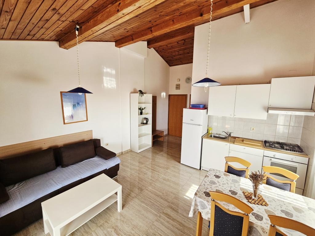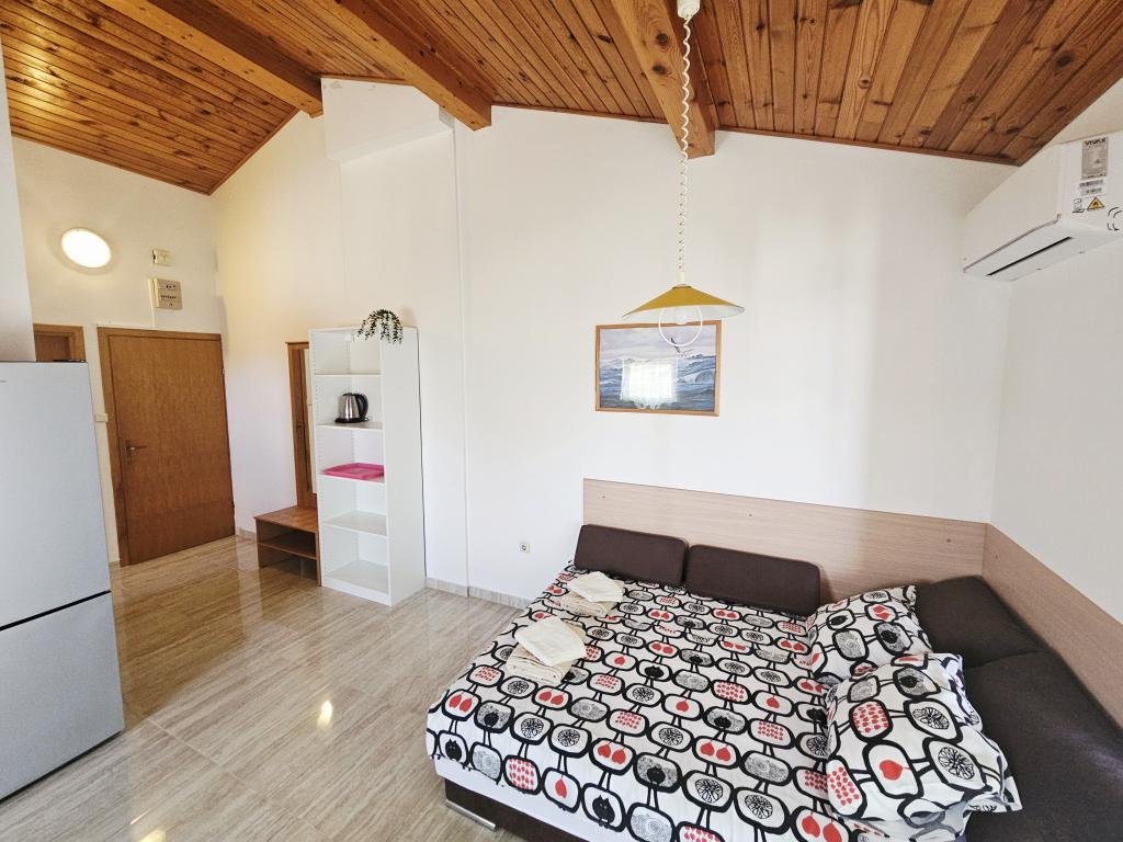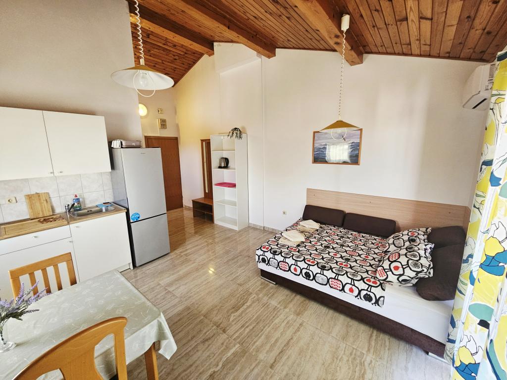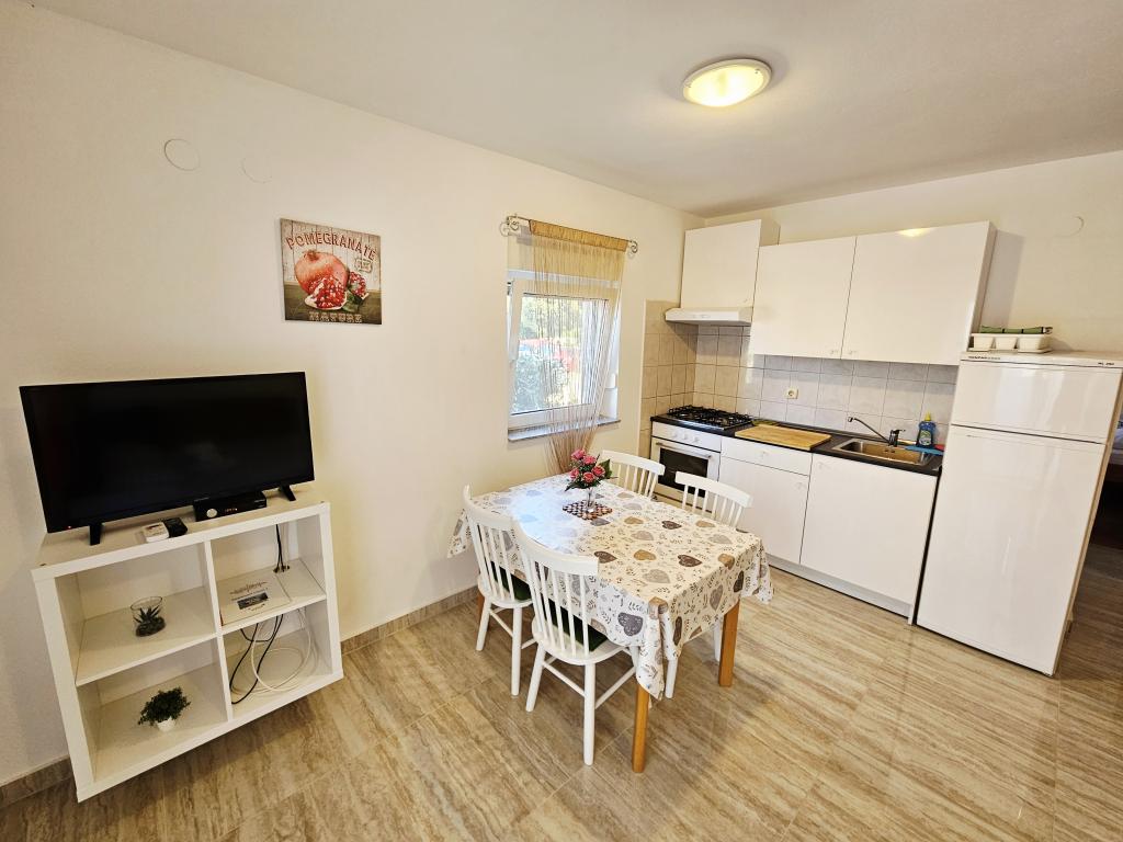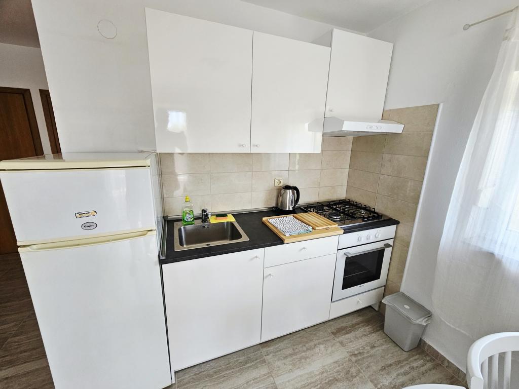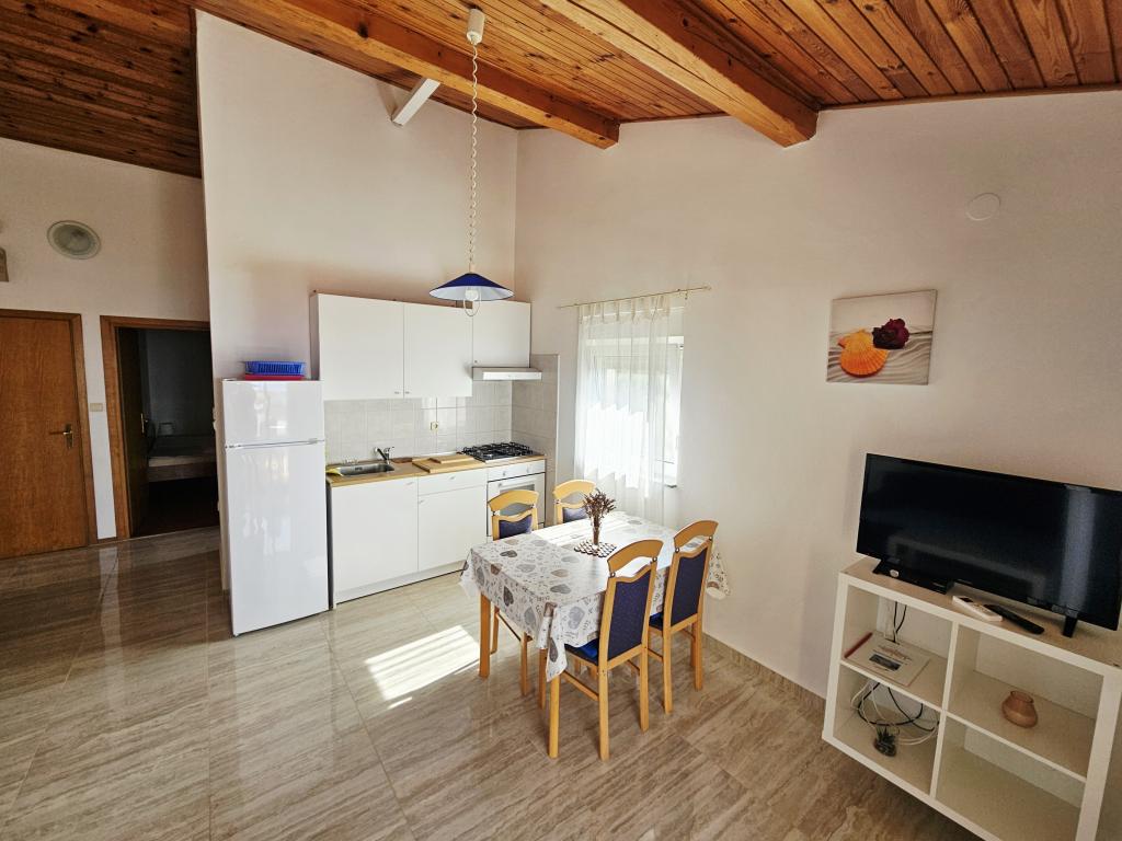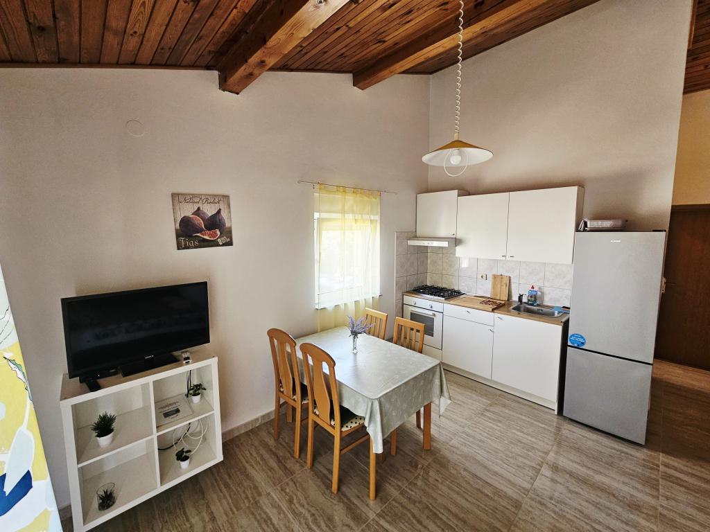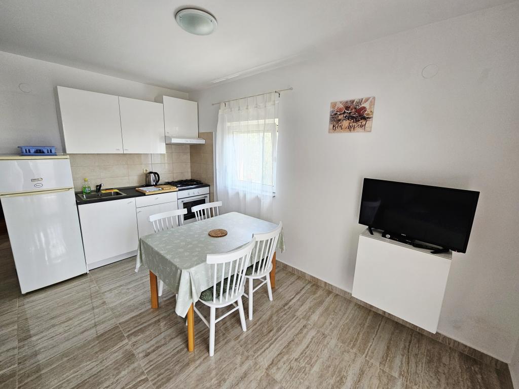 A fantastic place to spend a holiday. We stayed in apartment A6 + 1 on the ground floor, it is really worth remembering back. Beautiful spacious apartment, next to a large outdoor terrace, where we had a beautiful sea view. Outdoor fireplace where it smelled like good food. Large yard, parking, outdoor shower, a few steps to the beach, that's what we wanted. We were here for the first time, but I hope not for the last time. The owners are very friendly and helpful, if we needed anything they brought us. We recommend it, especially to those who like to be as close to the beach as possible. Nearby is a pastry shop, where ice cream is top quality, bread shop, sale of homemade fruits and vegetables. And something else that counts the clear sea as a pearl, and beautiful sunsets. Everything was unforgettable.