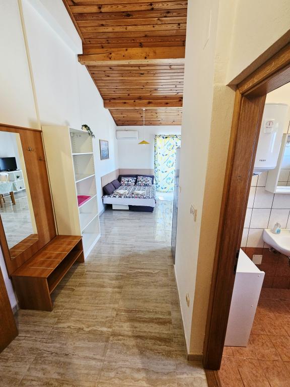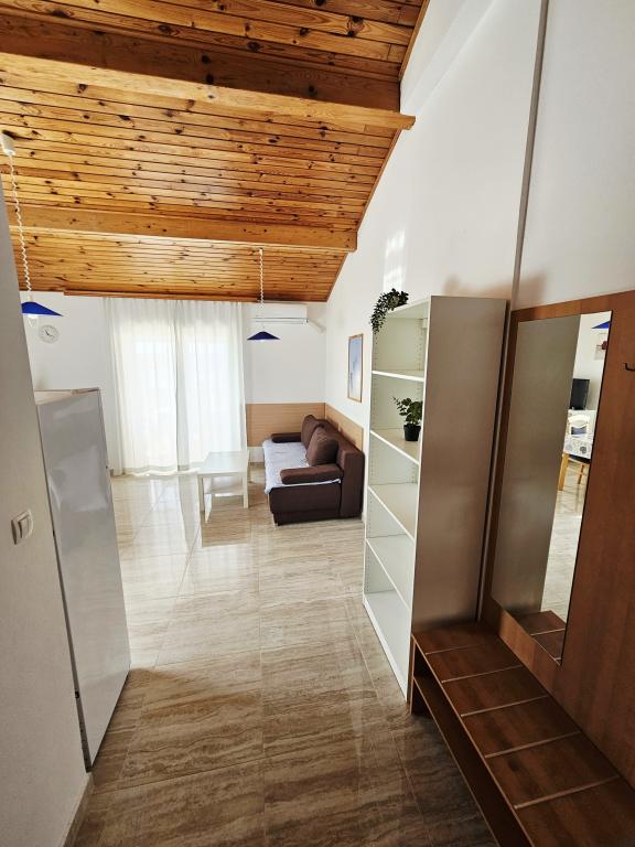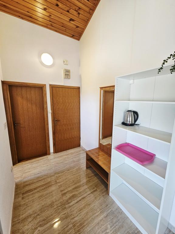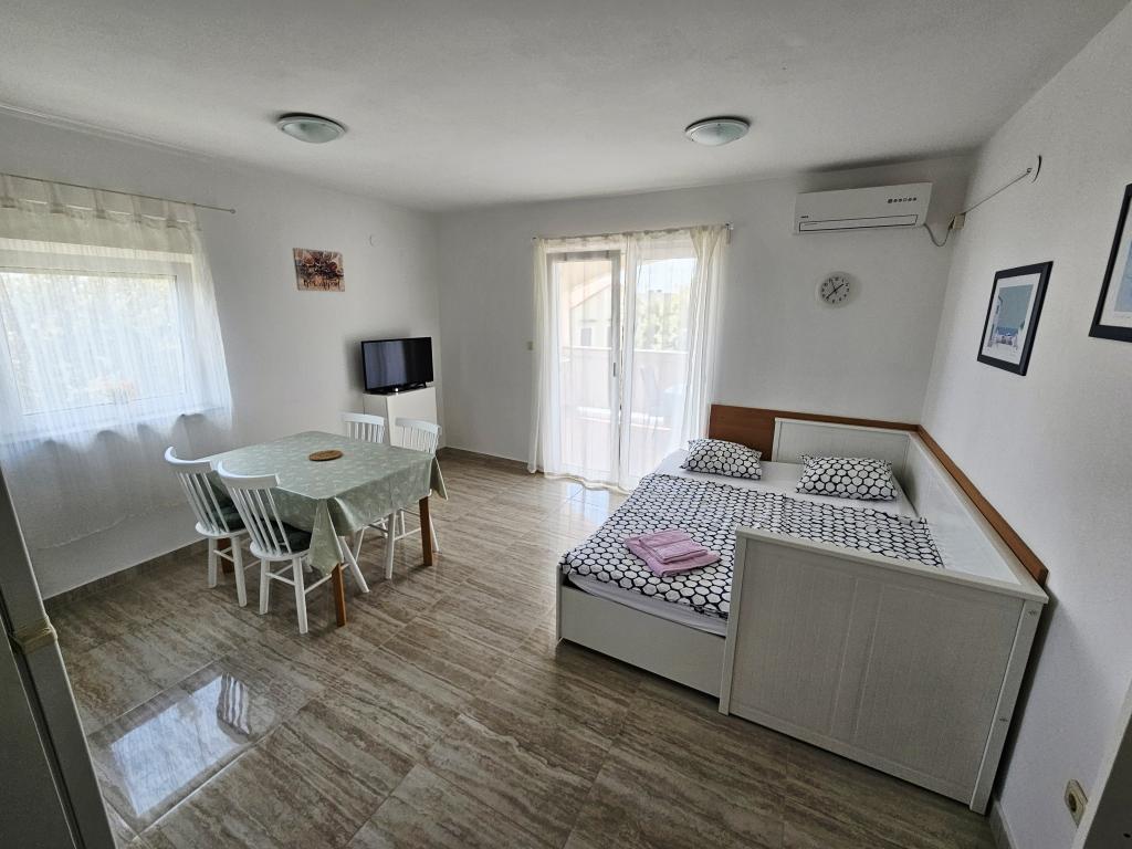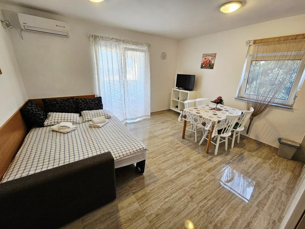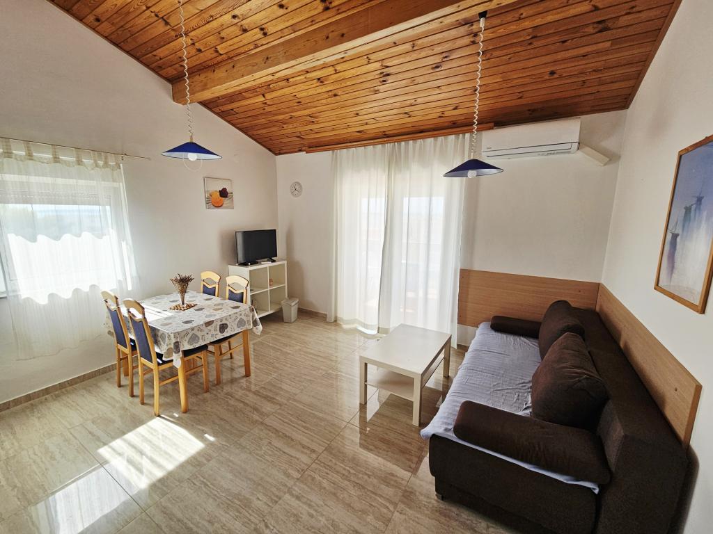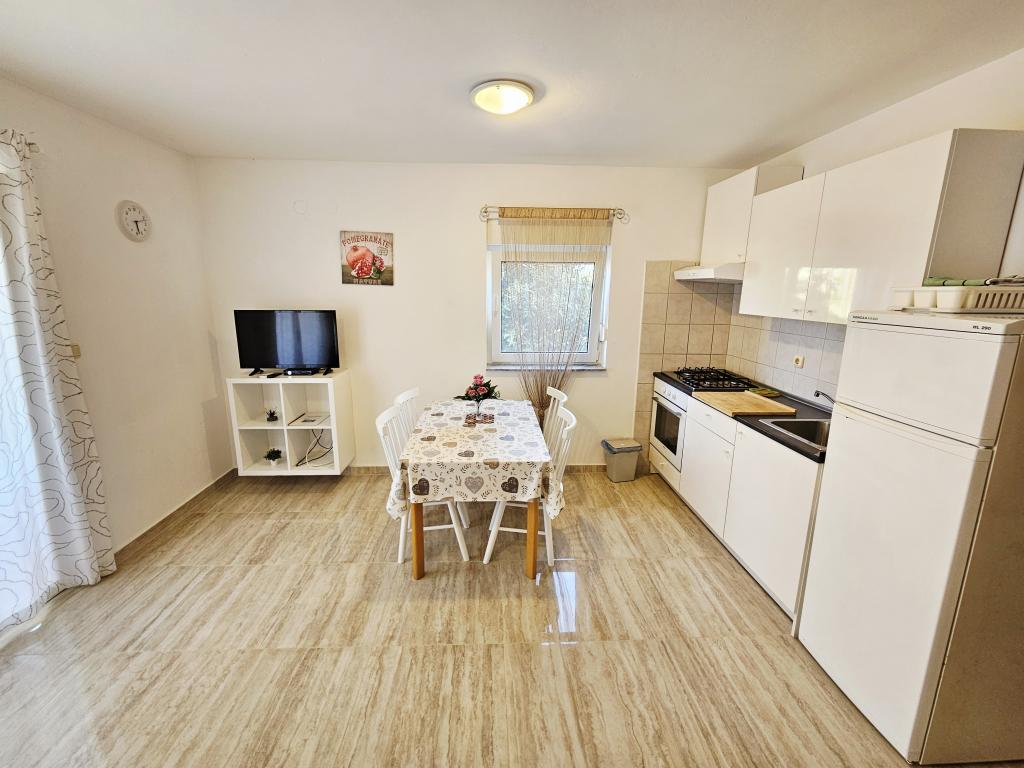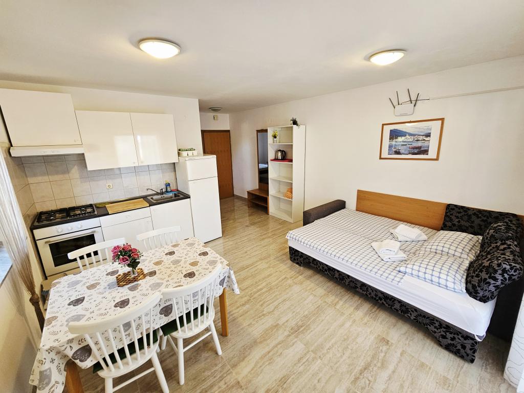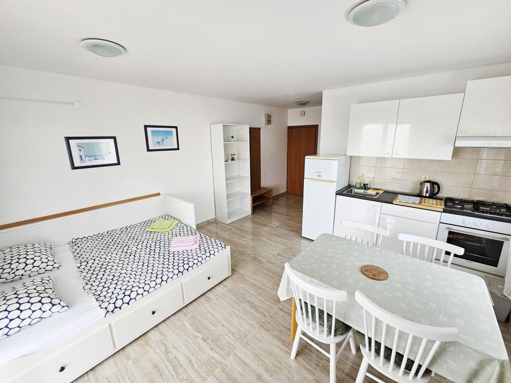A fantastic place to spend a holiday. We stayed in apartment A6 + 1 on the ground floor, it is really worth remembering back. Beautiful spacious apartment, next to a large outdoor terrace, where we had a beautiful sea view. Outdoor fireplace where it smelled like good food. Large yard, parking, outdoor shower, a few steps to the beach, that's what we wanted. We were here for the first time, but I hope not for the last time. The owners are very friendly and helpful, if we needed anything they brought us. We recommend it, especially to those who like to be as close to the beach as possible. Nearby is a pastry shop, where ice cream is top quality, bread shop, sale of homemade fruits and vegetables. And something else that counts the clear sea as a pearl, and beautiful sunsets. Everything was unforgettable.