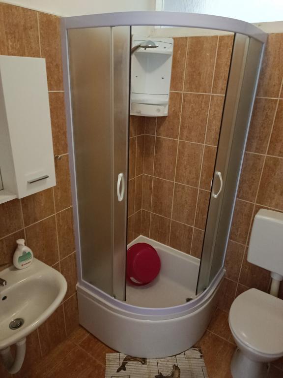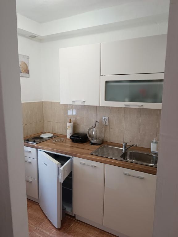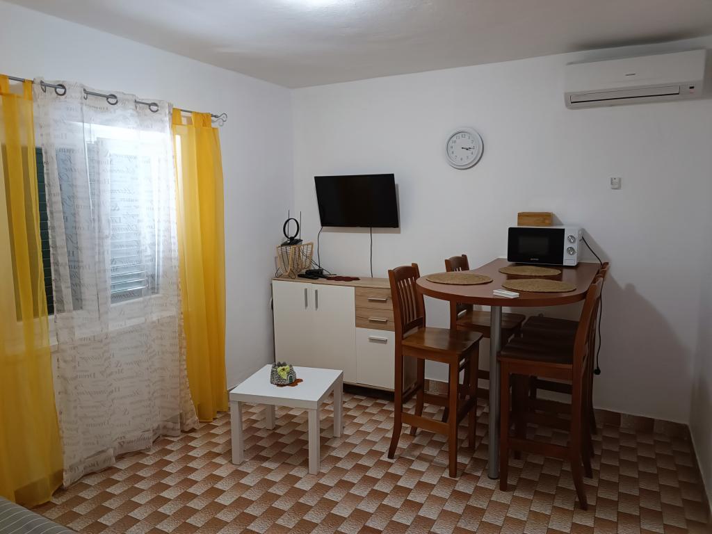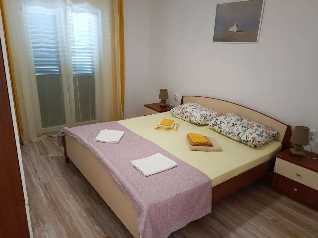 Dear guests, here is a brief description of the Apartment on Pag. Apartment Sol is located on the ground floor of a family house, measuring 42m square. You enter the hallway where there is a wardrobe with a mirror for storing clothes. From the hallway you can enter all rooms. The bedroom has a double bed, there is a possibility of adding an extra bed. The room has a view of the sea and the city and an exit to the balcony. The living room has a dining room and there is a raised table and a sofa bed. The kitchen is equipped with dishes, a kettle, a toaster, a microwave oven and an electric hob. The bathroom has a closed shower. The apartment is also equipped with air conditioning, which is additionally paid for on request at an additional cost of 2 euros per person per day. In Apartment Sol you get free of charge: wi-fi, parking and a view of the sea and the city, cleaning on arrival and departure, towels and bed linen for use. The apartment is 1 km from the city center, which is reached by a promenade along the sandy beach.