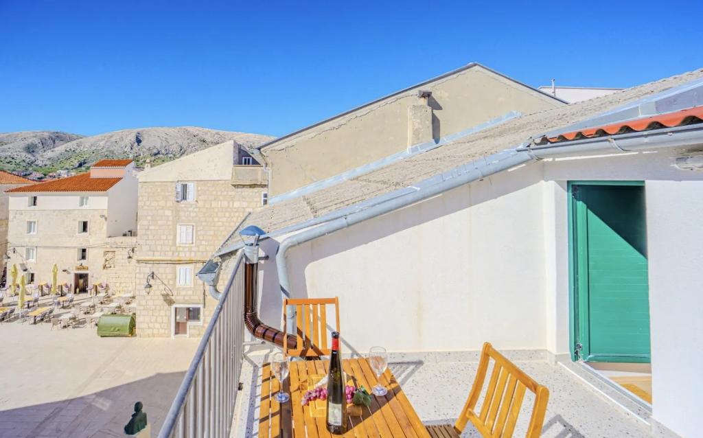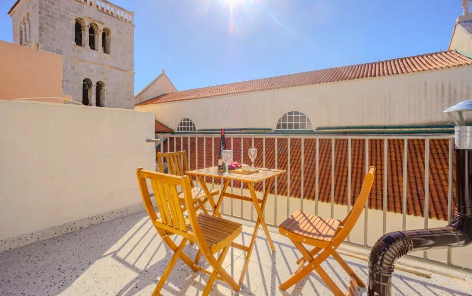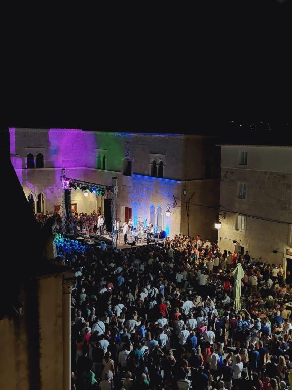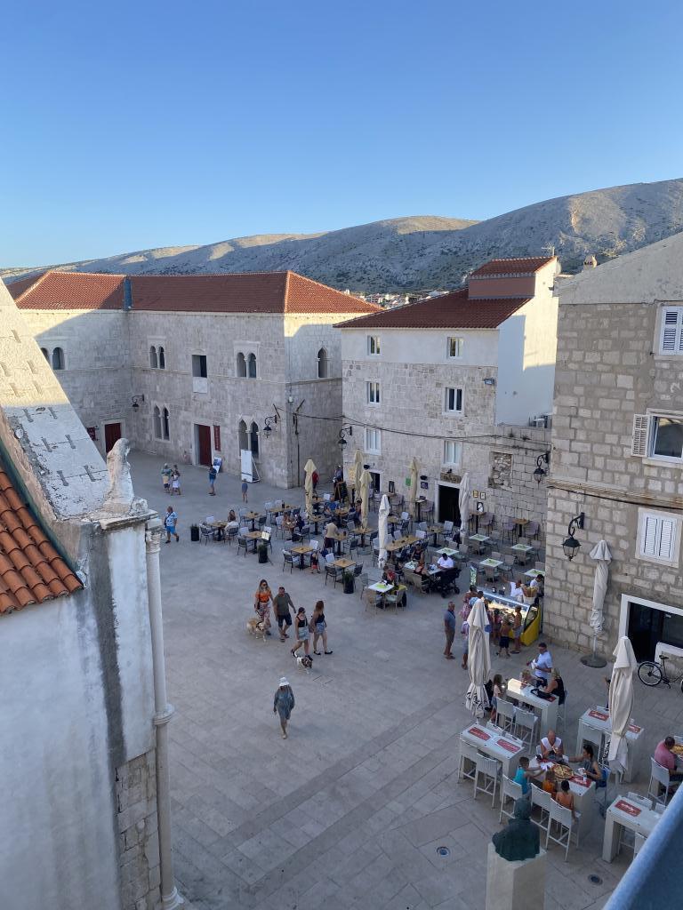 Holiday house, overlooking the main town square, located in the center of Pag. For 4 people. Contains: microwave, smart TV, air conditioning, kettle, toaster, refrigerator, washing machine, terrace with parasol.. Within a radius of 50 meters there are all amenities: restaurants, bakery (10m), shop, pharmacy, cafes, souvenir shops, parking, church, bus station (300m). Free parking included and private parking space. The main town beach is 250 meters from the house. The beach of the Pagus hotel is also nearby. View of the church and the Rector's Palace.