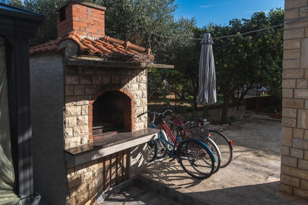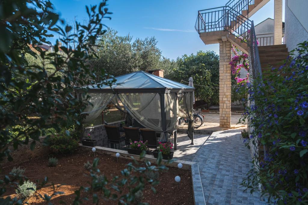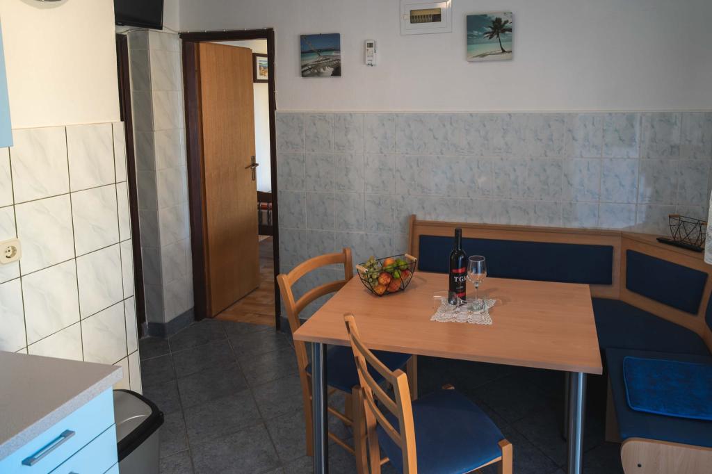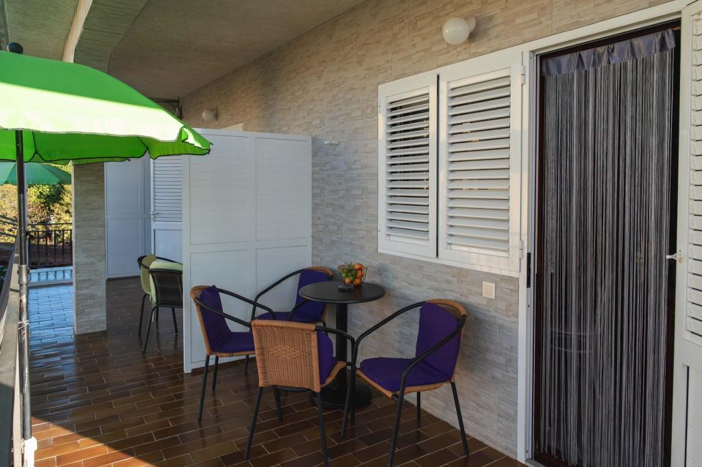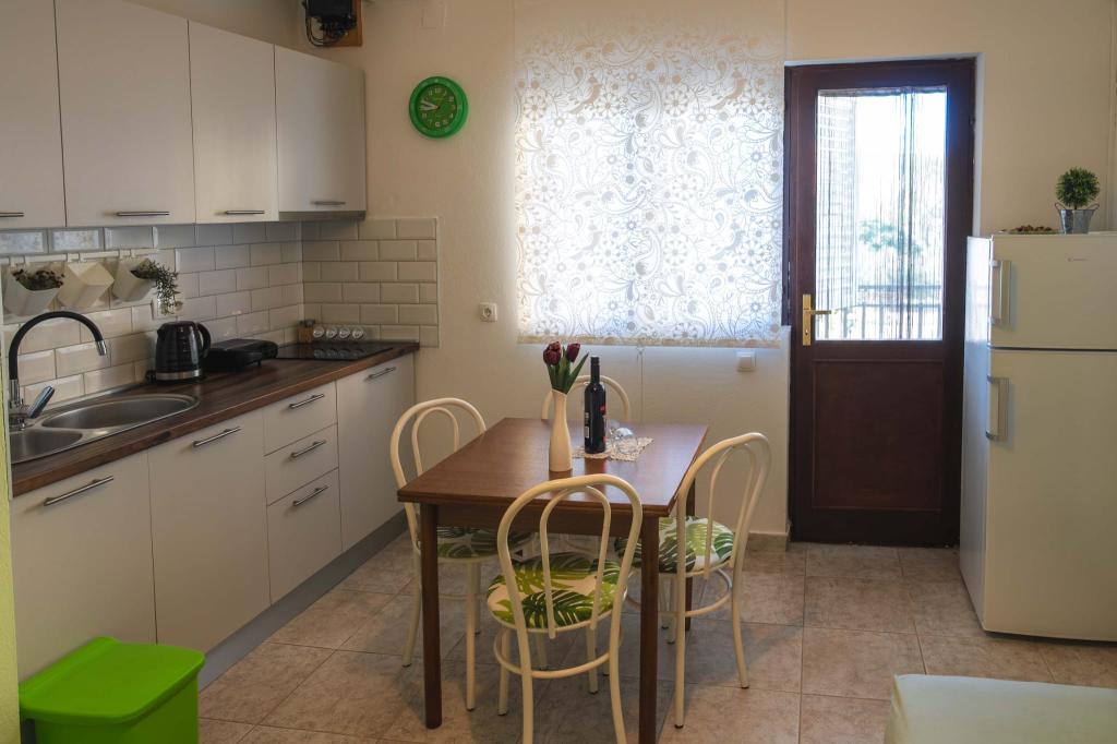 Four APP (2 2) in a quiet part of Pakostane. APP consists of a bedroom where a double and triple closet. The living room has a bed (200x140), table with four chairs, and in one corner of the kitchen. The kitchen consists of sudopra, furnaces kuhanhe with oven and refrigerator. Apartment owns air conditioning and TV. In front of APP's terrace with a table and four chairs for your APP. APP is on the first floor of a private house. Two-bedroom apartments consist of two bedrooms, kitchen, dining room and bathroom with shower. The apartments have a large terrace overlooking the sea, air conditioning. TV. In the backyard barbecue children's swings and parking in the fenced area.