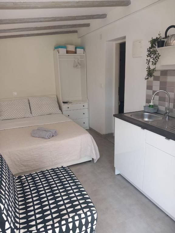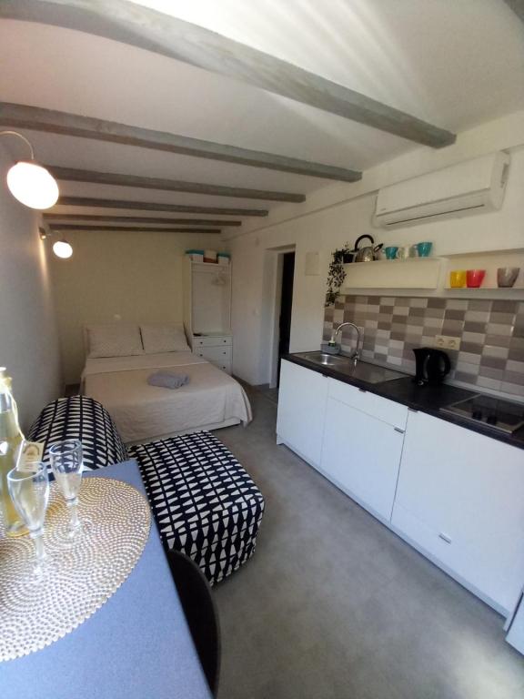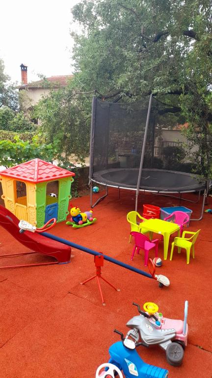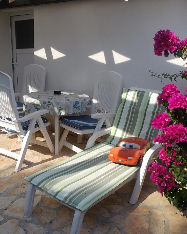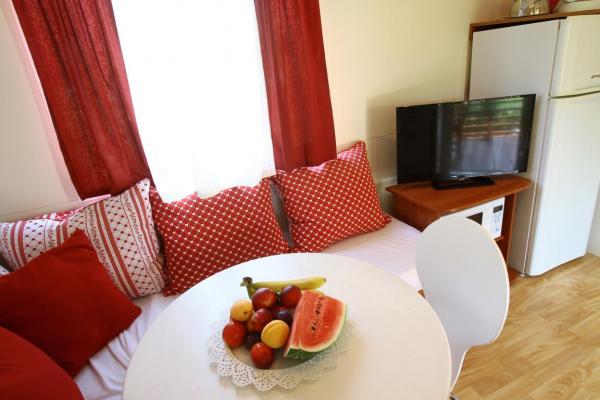 Apartments A4 1 are located on the ground floor of a family house, and apartment A2 2 of the stable unit. The mobile home is located at the same address as the apartments, and has a large terrace and a play area in front. The apartments are located in a quiet street, 3-4 minutes walk to the beach and the center.