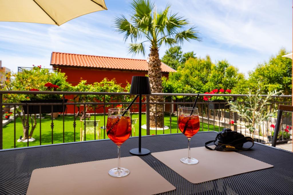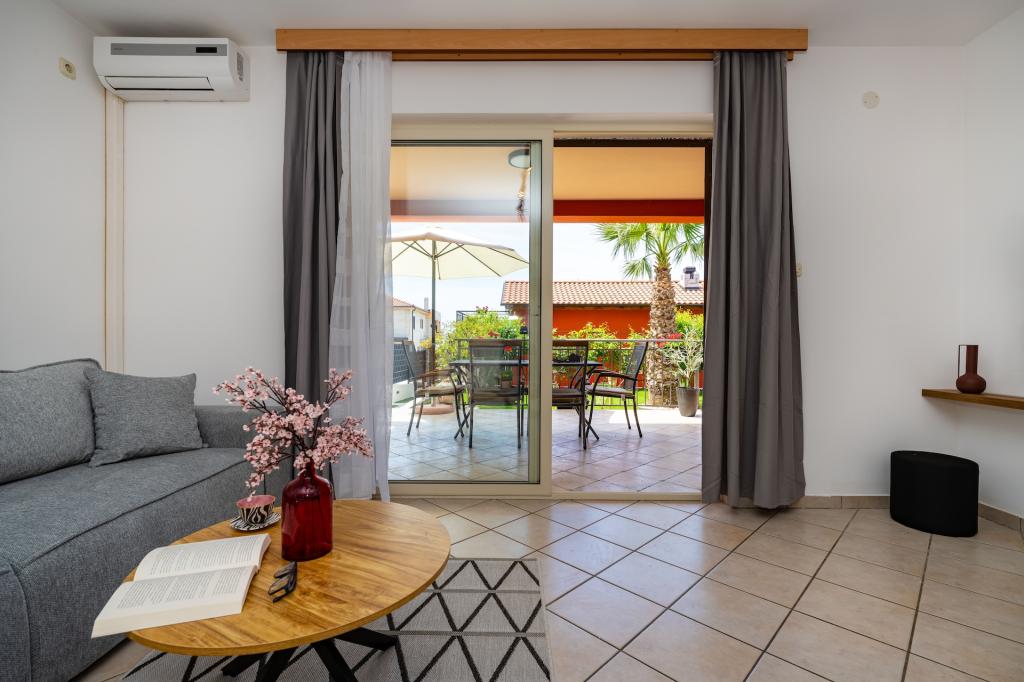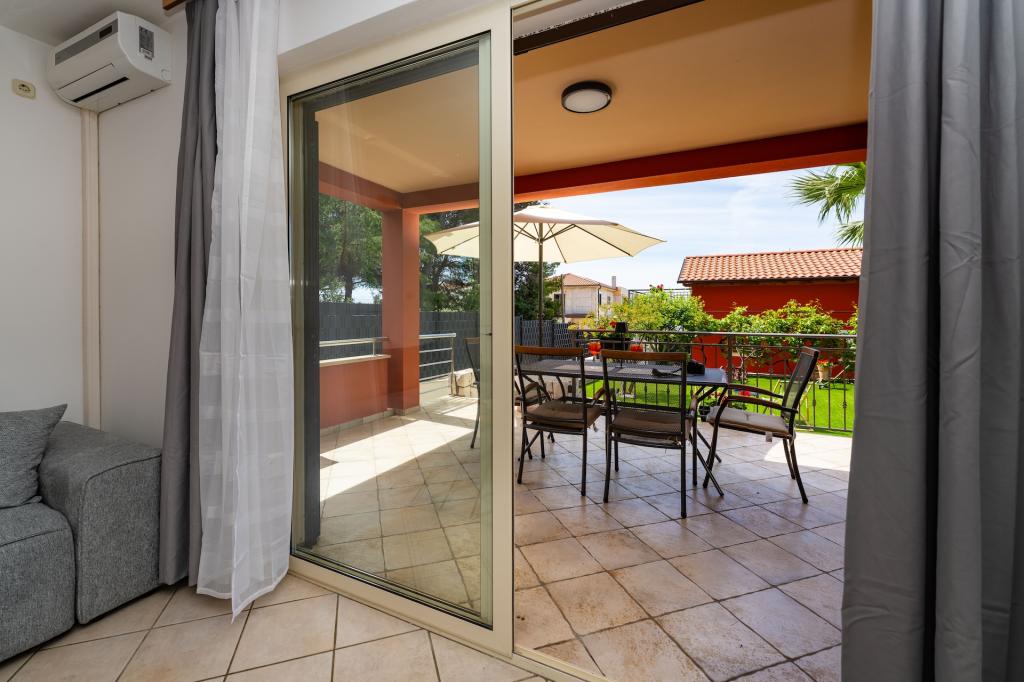 Villa San Marino has eight identical apartments located on three floors. There are two apartments on each floor. The apartments are 55m2 in total and contain a double bedroom, a living room with a click-clack bed, a kitchen, a dining room and a large terrace. All apartments are in the first row to the sea and face the sea. They are equipped with air conditioning for cooling and heating. The kitchens are equipped with utensils for preparing and serving food and drinks in appropriate quantities, a refrigerator, a freezer, an electric hotplate, a gas hob and a hood, and the bathrooms have showers. Each apartment has a flat-screen TV with satellite and antenna and Internet access. The terraces have seating furniture.