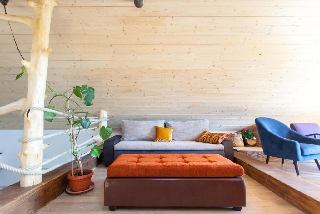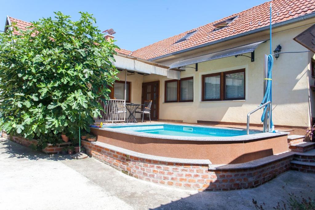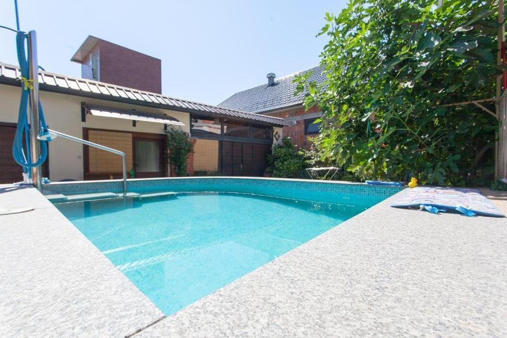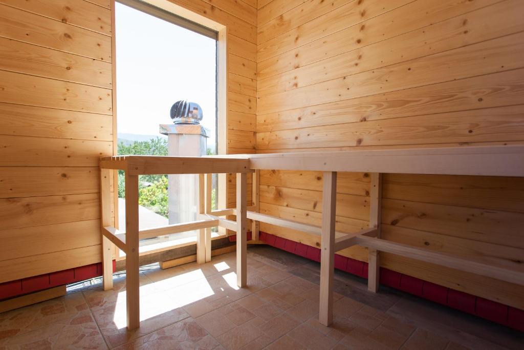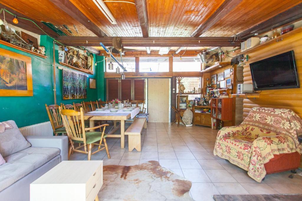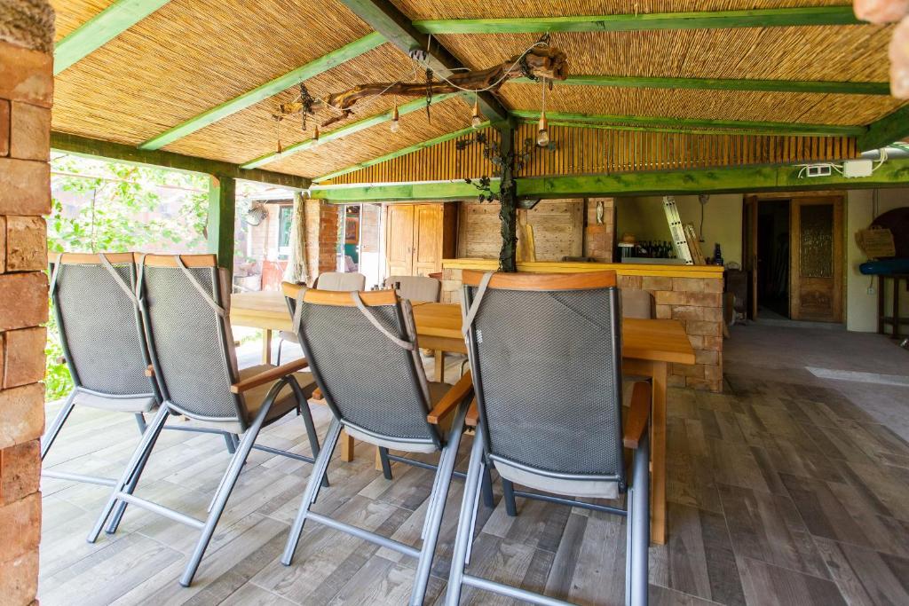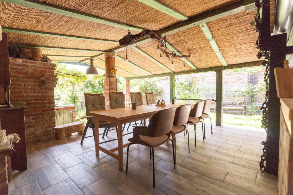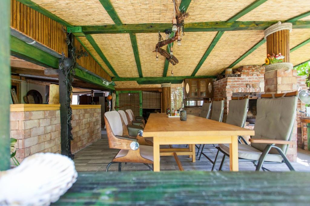 The vacation house contains two rooms and a gallery with a double bed, a double room with two separate beds, and an extra bed for two. It has two bathrooms, a kitchen, and a spacious living room. The possibility of using the outdoor pool, sauna and jacuzzi, wi-fi, max-tv, parking. Surrounded by greenery, there is a covered outdoor terrace with a grill, oven, kettle, skewers. Board games, cards, man don't get mad, badminton with a net, bow and arrow, darts, trampoline and swings for children are available.