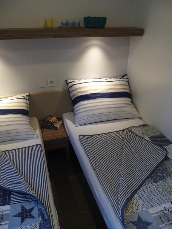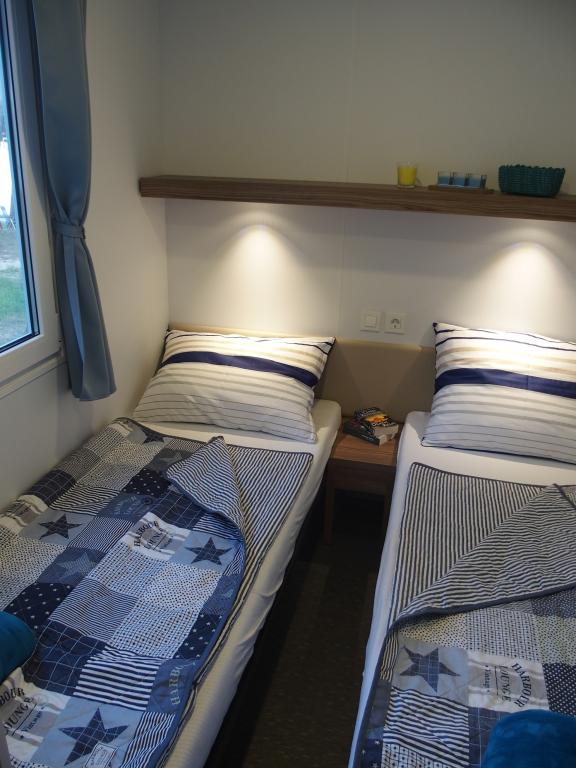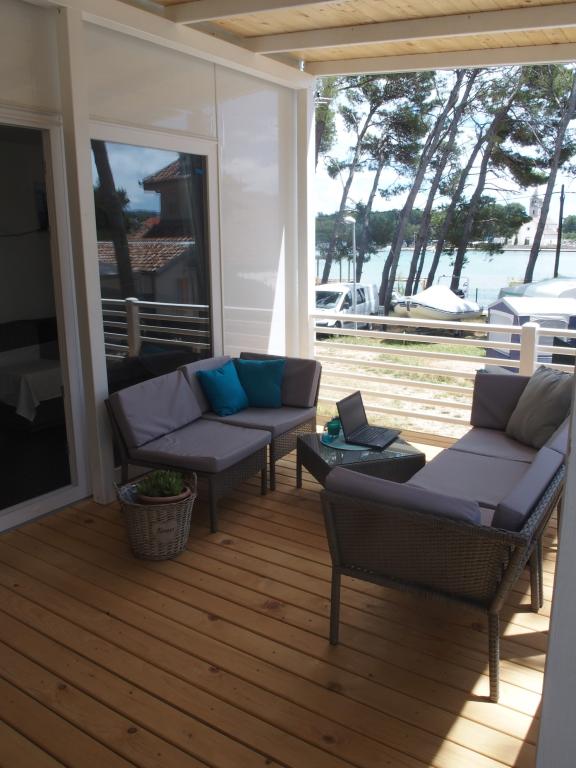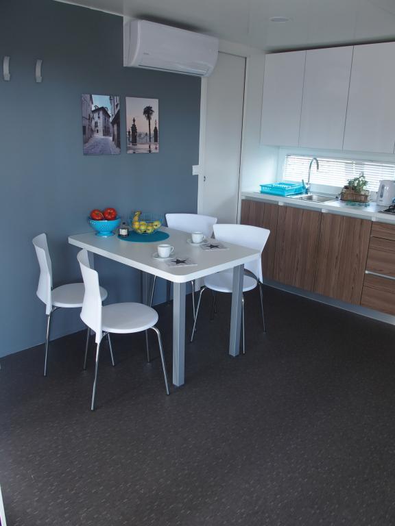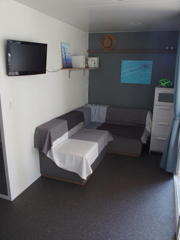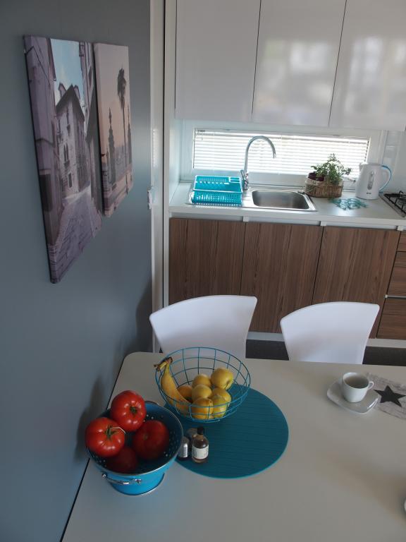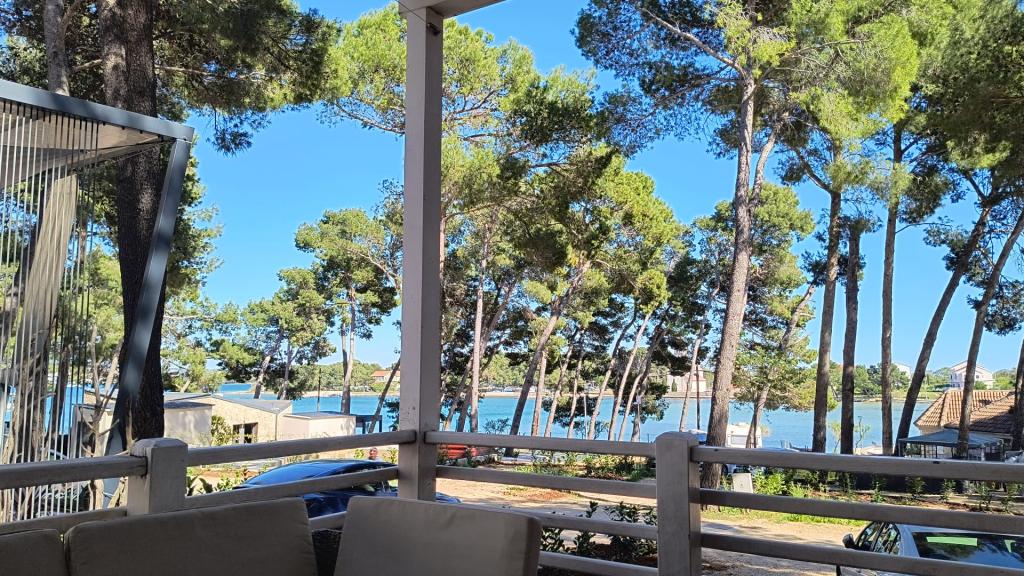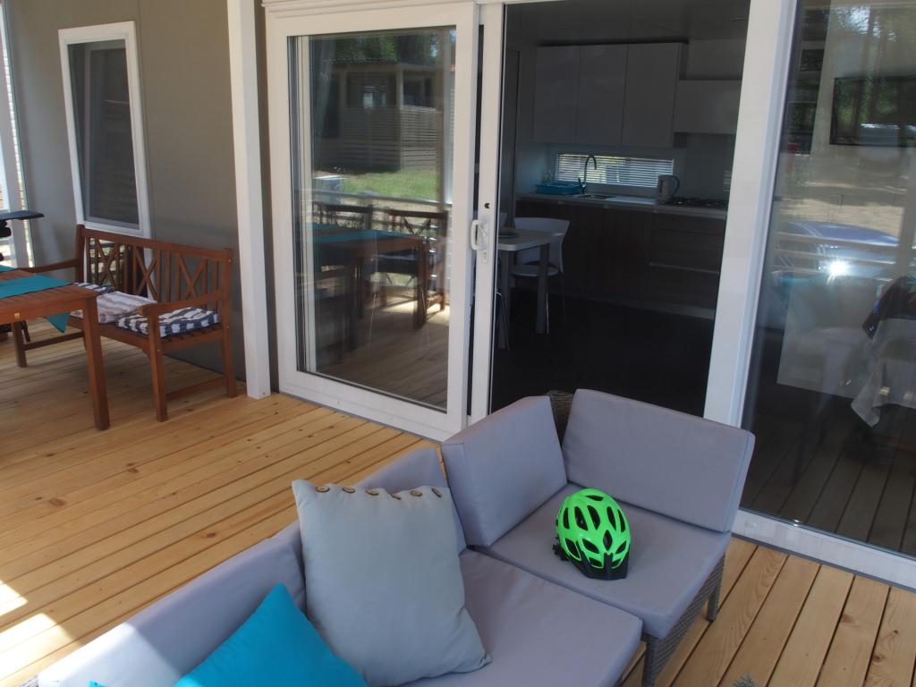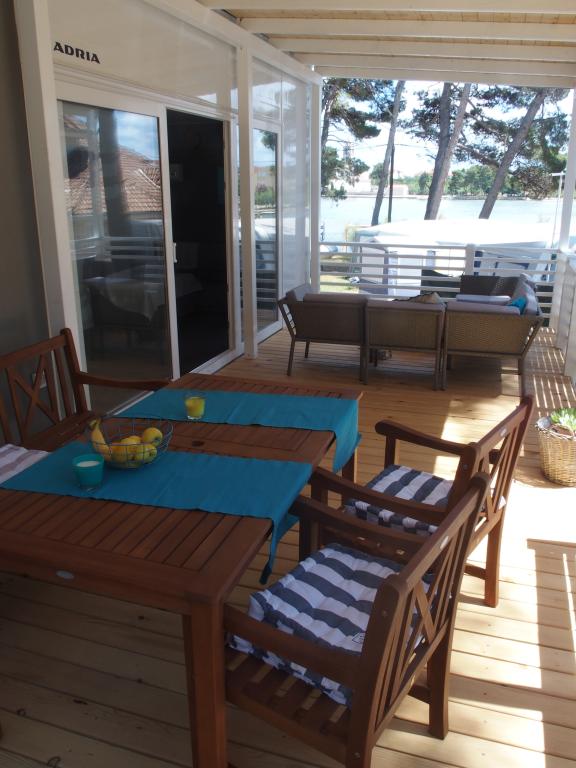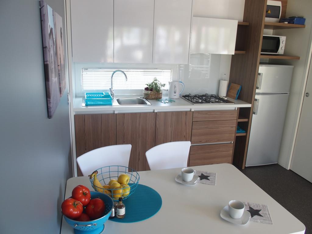 The luxury mobile home is located in the natural "deep shade" of a pine forest, just 20 m from the sandy beach. With a large open terrace overlooking the sea, 2 bedrooms, a fully equipped kitchen and bathroom, and a large living room with an additional sofa bed, this holiday home is the perfect choice for a relaxing family vacation. It provides comfortable accommodation for 4 people, while the maximum capacity is 4 + 1 people. The terrace has a seating area for relaxation, a dining table for up to 6 people, as well as a gas barbecue. Just 20 m away is a beautiful and safe beach with a sandy seabed that stretches from one end of the bay to the other. Along the coast, a few kilometers in both directions, there are other beaches of different types that you can explore. Inside the camp, guests have access to a swimming pool with a furnished sunbathing area with free sun loungers, as well as a cafe-bar, and the terrace of the house is located so that you have an open view of the entire bay and the pool.
