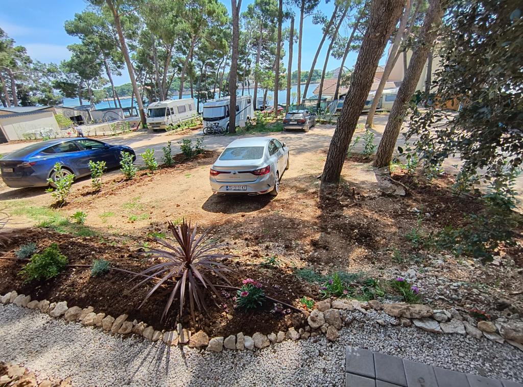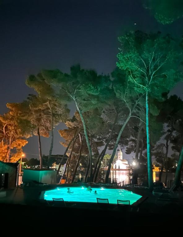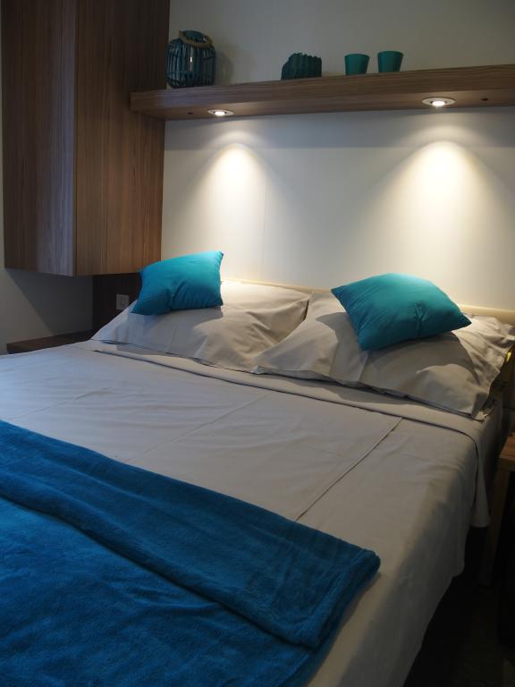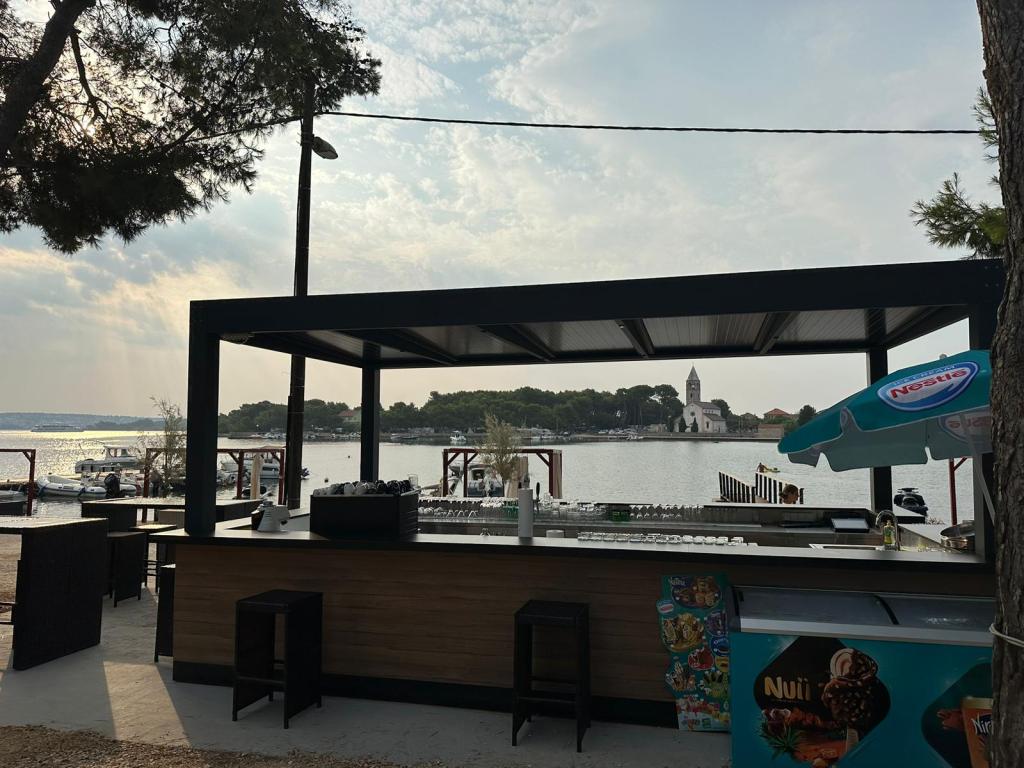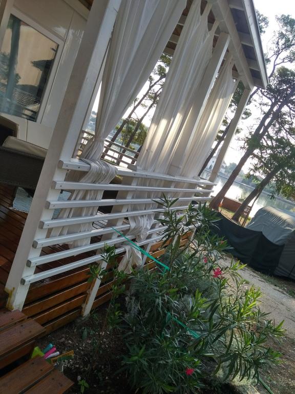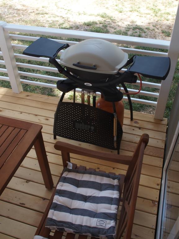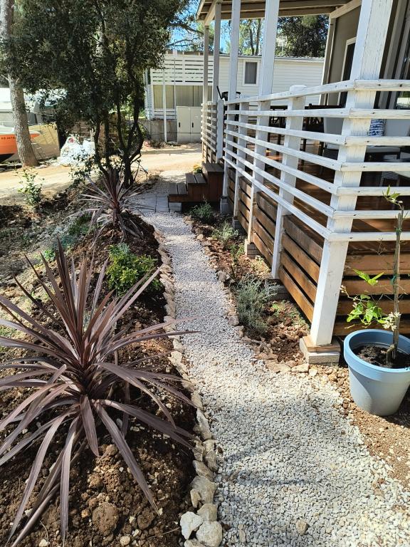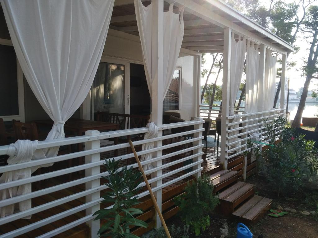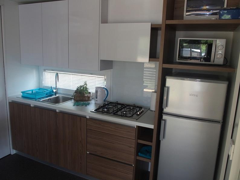 The luxury mobile home is located in the natural "deep shade" of a pine forest, just 20 m from the sandy beach. With a large open terrace overlooking the sea, 2 bedrooms, a fully equipped kitchen and bathroom, and a large living room with an additional sofa bed, this holiday home is the perfect choice for a relaxing family vacation. It provides comfortable accommodation for 4 people, while the maximum capacity is 4 + 1 people. The terrace has a seating area for relaxation, a dining table for up to 6 people, as well as a gas barbecue. Just 20 m away is a beautiful and safe beach with a sandy seabed that stretches from one end of the bay to the other. Along the coast, a few kilometers in both directions, there are other beaches of different types that you can explore. Inside the camp, guests have access to a swimming pool with a furnished sunbathing area with free sun loungers, as well as a cafe-bar, and the terrace of the house is located so that you have an open view of the entire bay and the pool.
