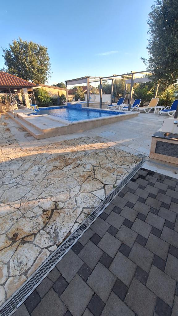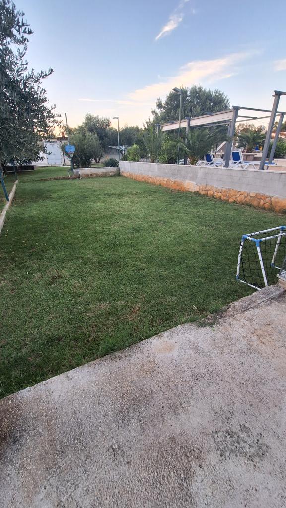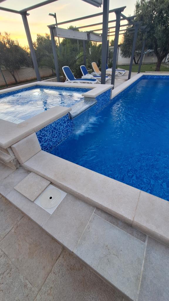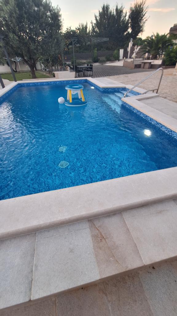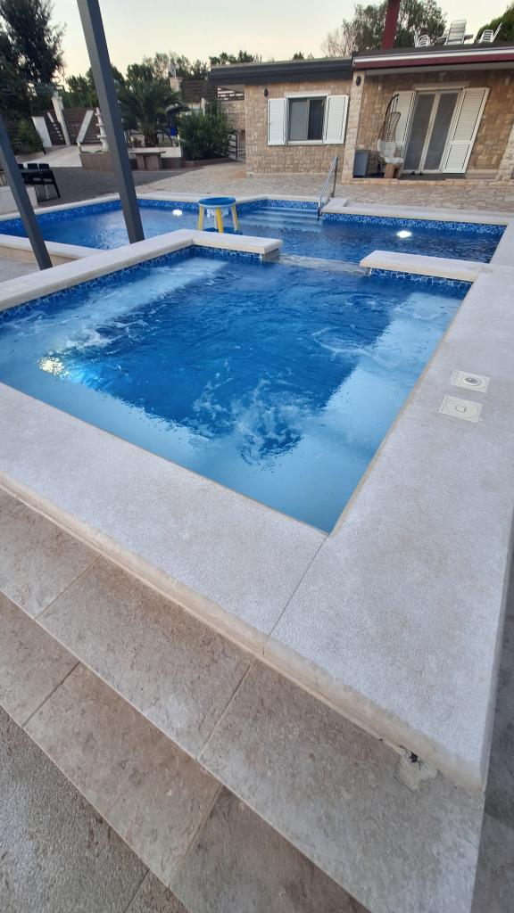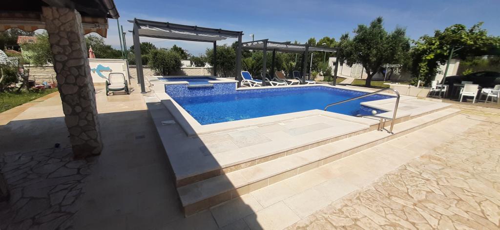 Holiday house with a swimming pool that is heated and a massage pool with an artificial waterfall. The pool is 8x4 m and the massage pool is 3 x 3 m. It is 200 meters from the beach. Nearby is a restaurant, a port for mooring boats and a beach for pets. with grill, parking for 3 cars
