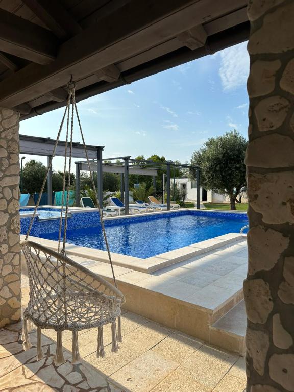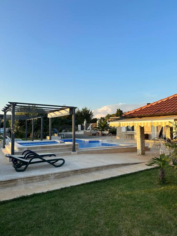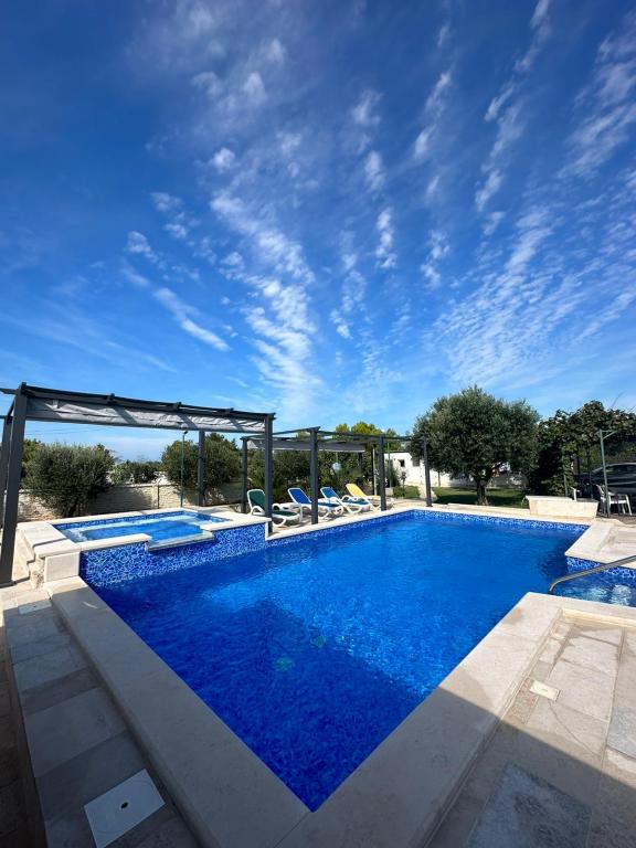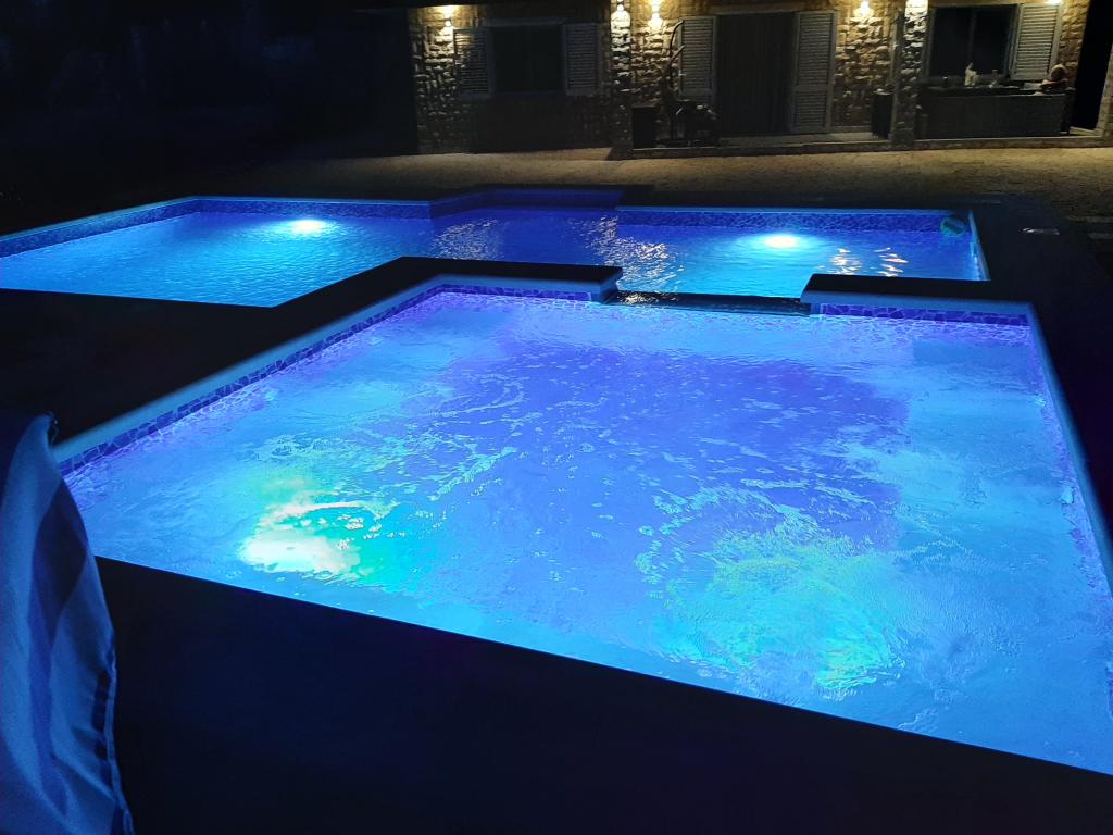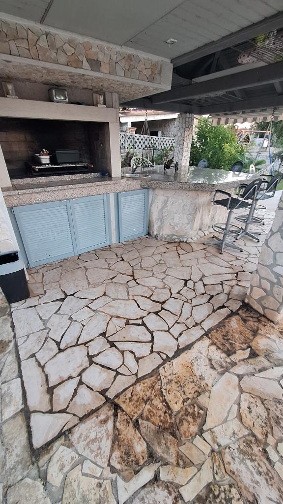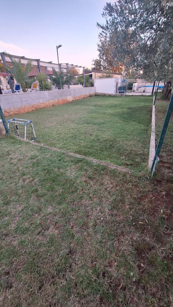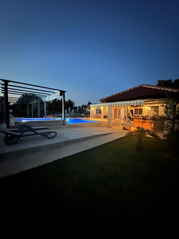 Holiday house with a swimming pool that is heated and a massage pool with an artificial waterfall. The pool is 8x4 m and the massage pool is 3 x 3 m. It is 200 meters from the beach. Nearby is a restaurant, a port for mooring boats and a beach for pets. with grill, parking for 3 cars