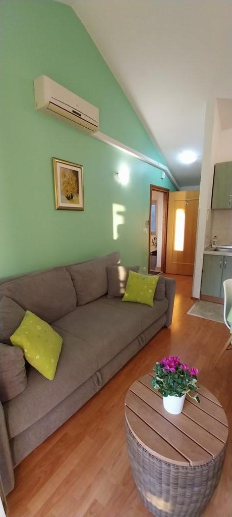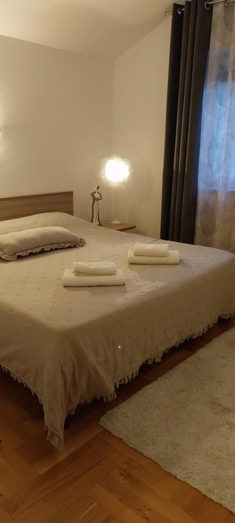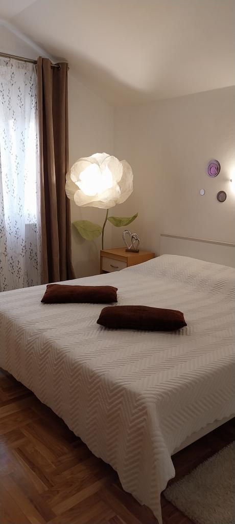 The apartments are located in a new family house in the center of Petrcan. Below the house there is a beautifully landscaped children's playground, promenade and harbor with boats. Nearby there are beaches, restaurants, shops. The apartments have covered balconies overlooking the sea and islands. They are comfortable, with two bedrooms, living room with kitchen, bathroom. The apartments are air conditioned, with wi fi internet, microwave, kettle, coffee maker and cutlery and drinks. They are equipped with bed linen and towels.