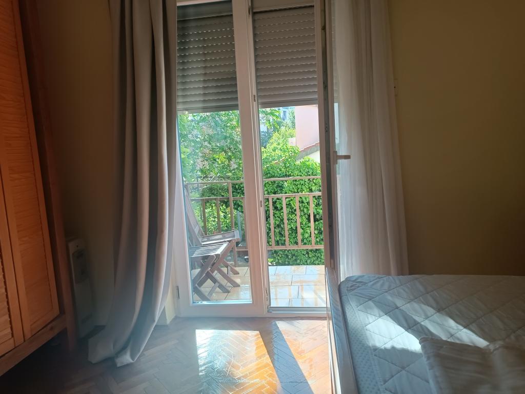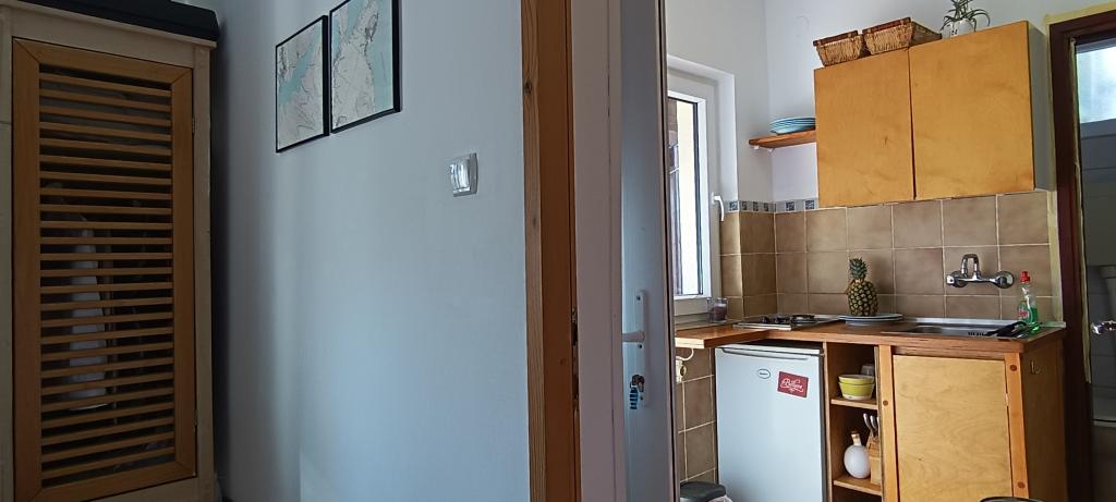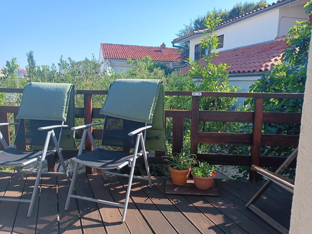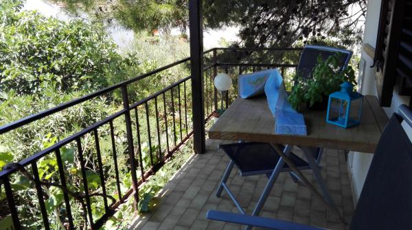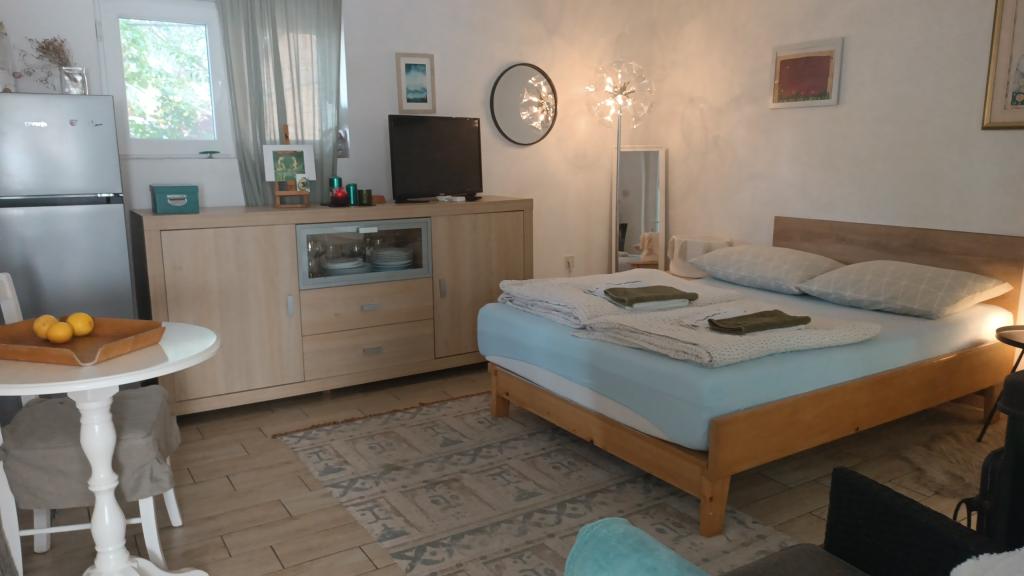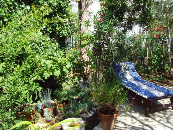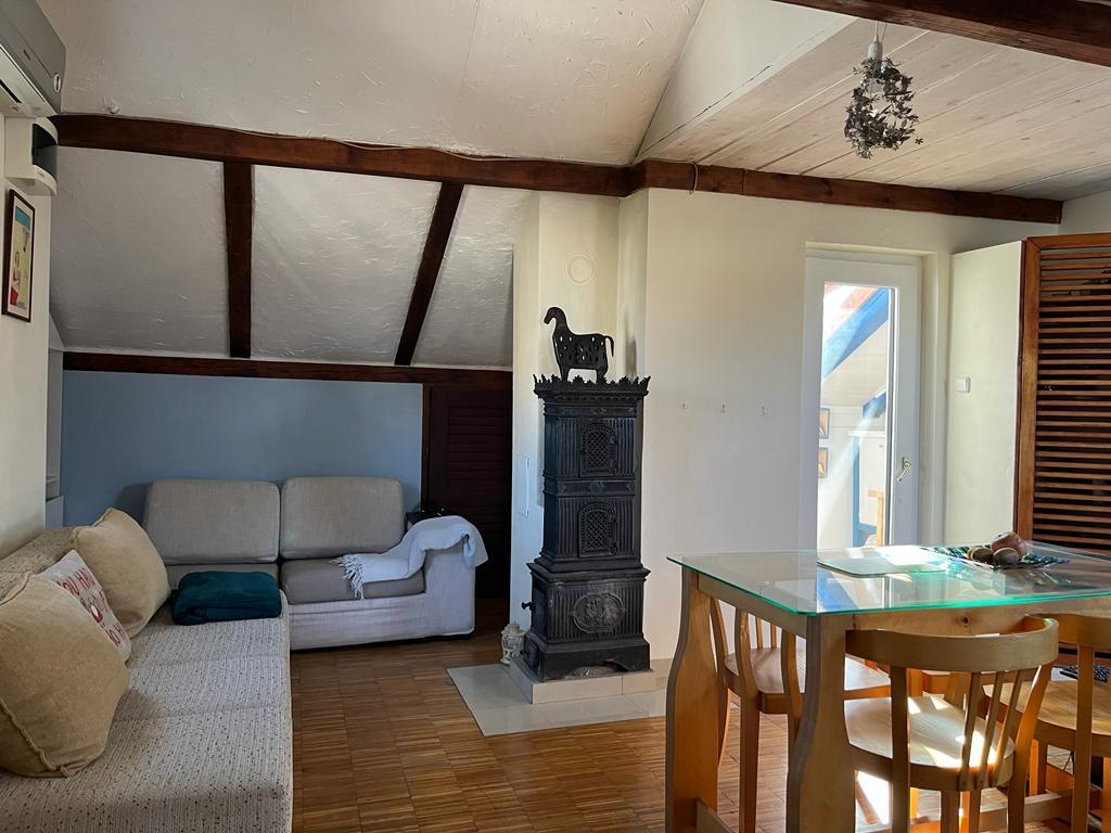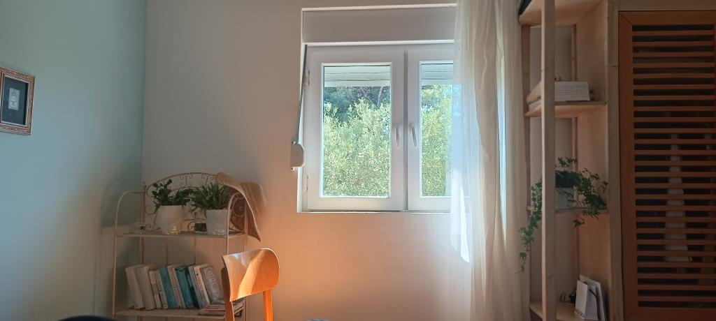 The Log Inn apartment is located on the first floor of a house with only two apartments, in a quiet alley for families. The garden of the house is shady with olive, fig and pine trees, with a parking space in the yard. The town center with shops, bakeries, pastry shops, cafes and restaurants is a 10-minute walk away, and the first pebble beach is only a 5-10-minute walk away. The Log Inn is pleasant to stay in whatever the weather, spacious and with a separate room with a living room with toys and picture books. It is well equipped (dishes, kettle, coffee machine, max-tv, wlan, air conditioning) and in the living room in the spring evenings it is relaxing by the fire in the wood stove. The terrace with garden furniture is pleasant, and guests are happy to have breakfast on it, sunbathe or enjoy the evening. The studio is smaller and with a smaller kitchenette, but because of the garden it is pleasant even in the summer heat. It has equipment for babies: travel cot, nursery, toys, mat, etc. Both apartments have cooling and heating. In the off-season, they are rented with discounts and on a monthly basis