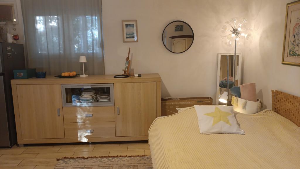 The Log Inn apartment is located on the first floor of a house with only two apartments, in a quiet alley for families to relax. The garden of the house is shady with olive, fig and pine trees, with a parking space in the yard. The town center with shops, bakeries, pastry shops, cafes and restaurants is a 10-minute walk away, and the first pebble beach is only a 5-10-minute walk away. The Log Inn is pleasant to stay in whatever the weather, spacious and with a separate room with a living room with toys and picture books. It is well equipped (dishes, kettle, coffee machine, max-tv, wlan, air conditioning) and in the living room in the spring evenings it is relaxing by the fire in the thick stove. The terrace with garden furniture is pleasant, and guests are happy to have breakfast on it, sunbathe or enjoy the evening. The studio is smaller and with a smaller kitchenette, but because of the garden it is pleasant even in the summer heat. equipment for babies if they come: travel cot, nursery, toys, mat, etc. Both apartments have cooling and heating. In the off-season, they are rented with discounts and on a monthly basis