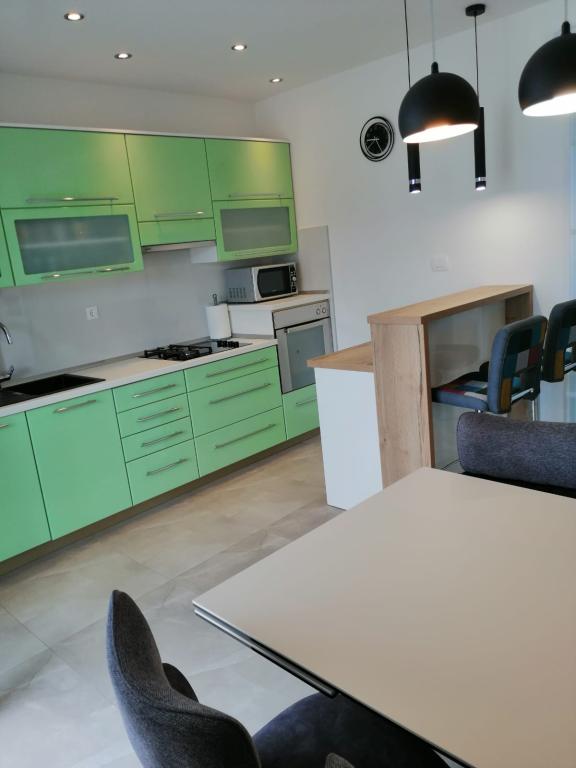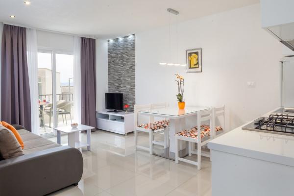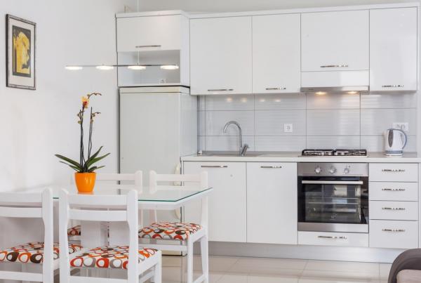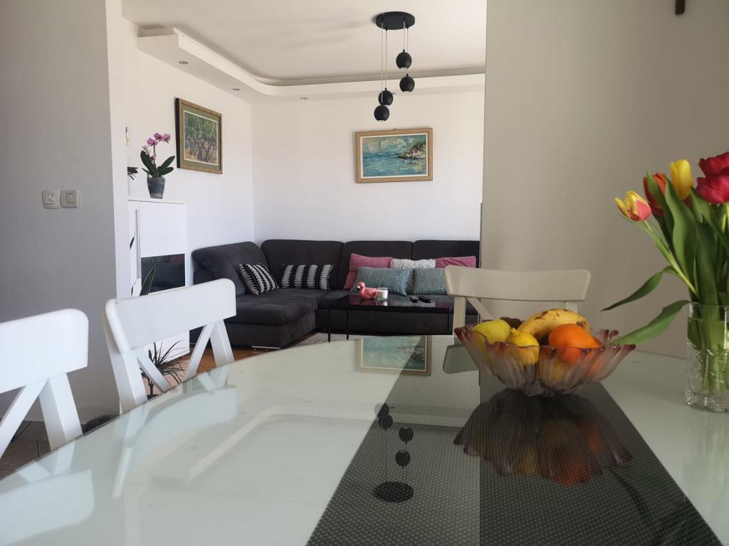 We stayed in the apartment for two weeks. Spacious rooms, dining room, terrace and two balconies. The apartment is equipped with appliances - washing machine, dishwasher, microwave, stove, oven. Very close to the beach, sea view, owners extremely nice. In addition, a beautiful place, not too crowded, where everyone can find something for themselves. Hope to come back again!