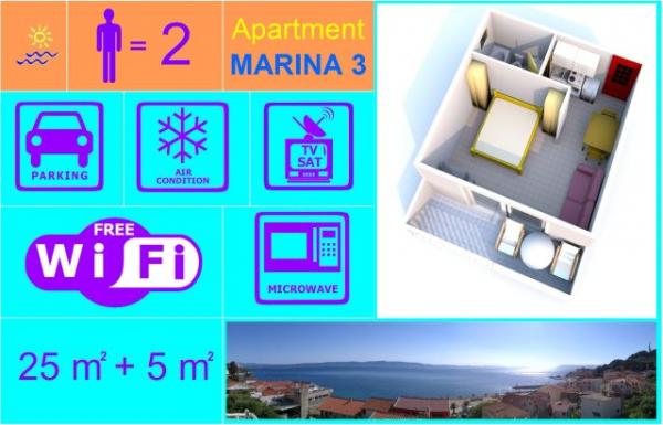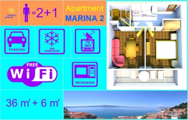 Apartments Marina are ideal choice for a peaceful and relaxing holiday, situated in a quiet location near the sea, beautiful beaches, city center and all major attractions. Apartments Marina are facing south and the sea, with sweeping view (180°) to the sea and the islands. Modern equipped apartments with air conditioning, free Wi-Fi, satellite TV, microwaves, and other necessary equipment. One parking space for each apartment right next to our house. Each apartment has its own entrance. MARINA 1 (2 1) is located on the ground floor, the total area of the apartment is 28 m2 and associated garden terrace is 24 m2. The apartment is located on the south side of the house with a partial sea view. The apartment is ideal for families with small child. MARINA 2 (2 1) is located on the second floor, the total area of the apartment is 36 m2, and a balcony area is 6 m2. Apartment fully facing the sea and the south and has a breathtaking view (180°)The apartment is idea