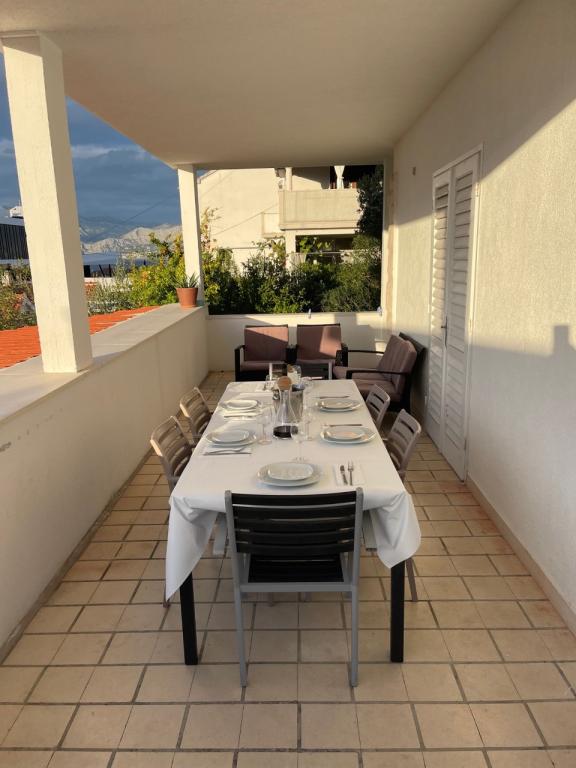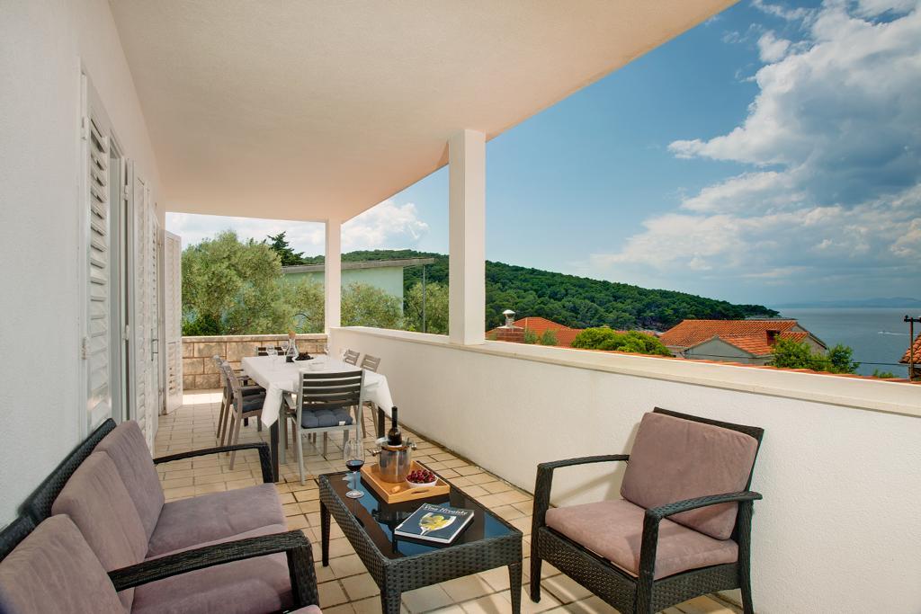 The house in which the apartments are located is located in a quiet and attractive part of the town. Surrounded by a garden and flowers, and a spacious covered terrace offers a beautiful view of the sea. There is a parking space in front of the house and a barbecue in the yard. The sea is only 80 m away. The nearest beach is sandy. The bay is quiet, but you have a 2-3 minute walk to the center of town.