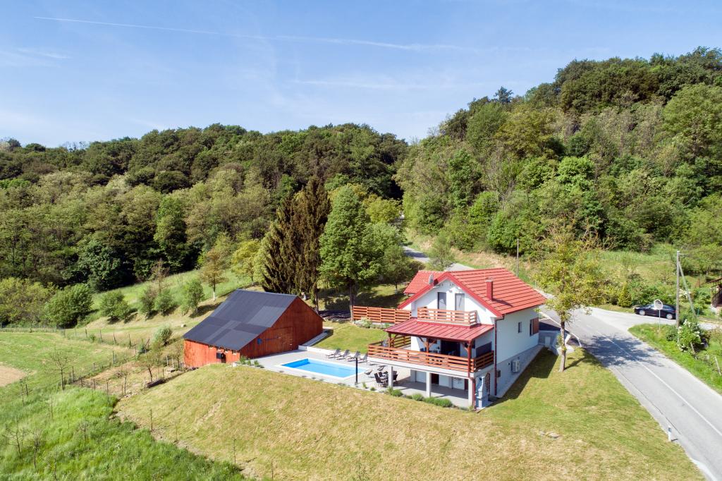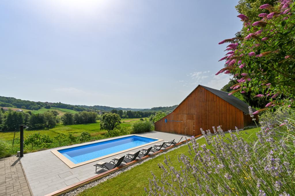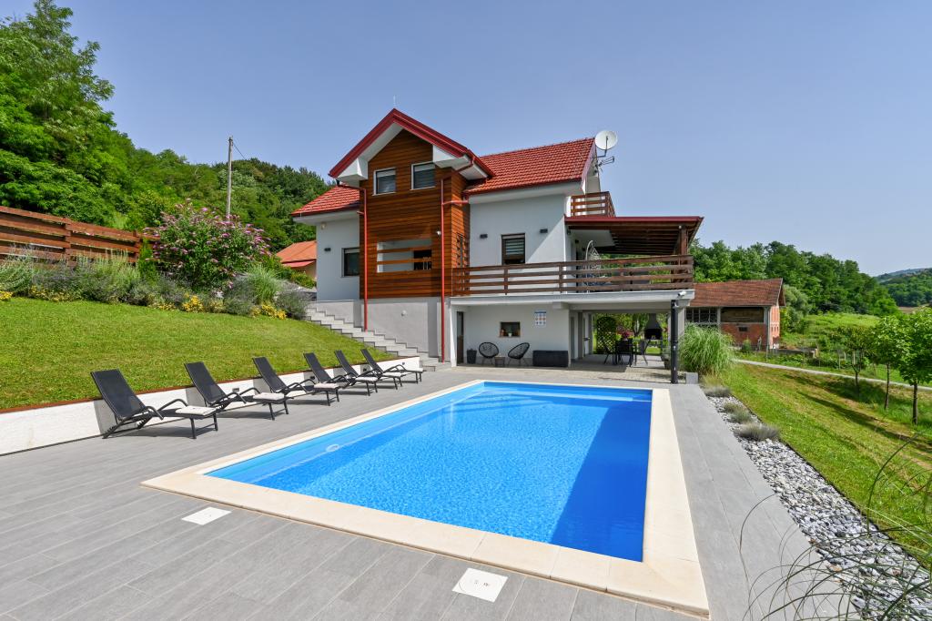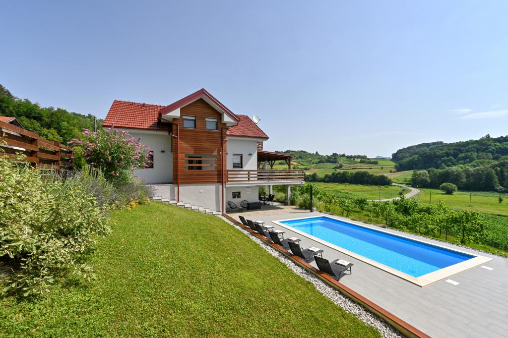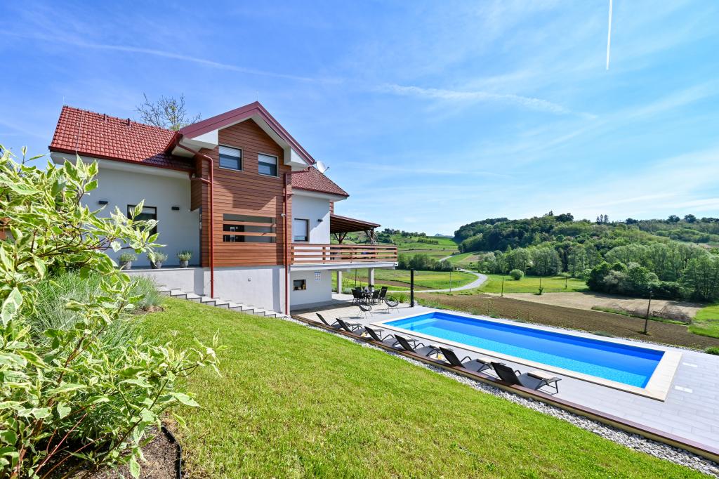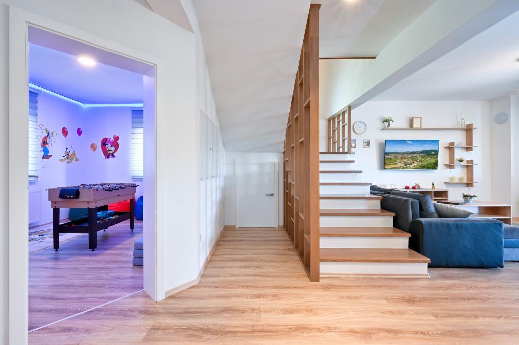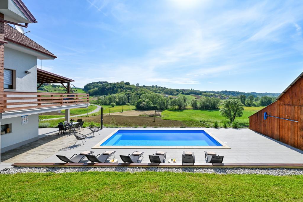 This incredible house is located on one of the many hills of beautiful Zagorje. Surrounded by hills, vineyards, orchards and forests, it is an ideal place to enjoy and rest in nature. The wonderful view that stretches allows you to enjoy beautiful sunrises, which is what the house got its name from. Sunrise Hill is categorized with 4* and provides comfortable accommodation for 8 people, and is primarily oriented towards families with children. It is perfect for a quiet vacation or socializing, but also for recreation and sports. In addition to the landscaped garden, which offers a large swimming pool with a shower and a covered and open terrace, a barbecue, a play house, parking, the house is decorated with a meticulously decorated interior dominated by wood and bright and calming tones. The house consists of a ground floor with a spacious living room with kitchen and dining room, a bathroom, a children's playroom with table football, a PS 4 game console and board games, and a spacious terrace that invites you to rest and socialize. There are three bedrooms on the first floor of the house.