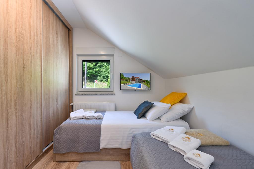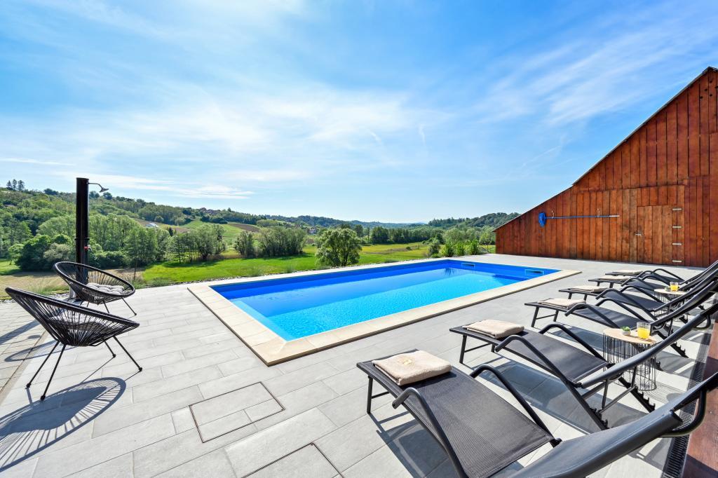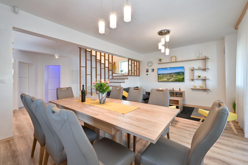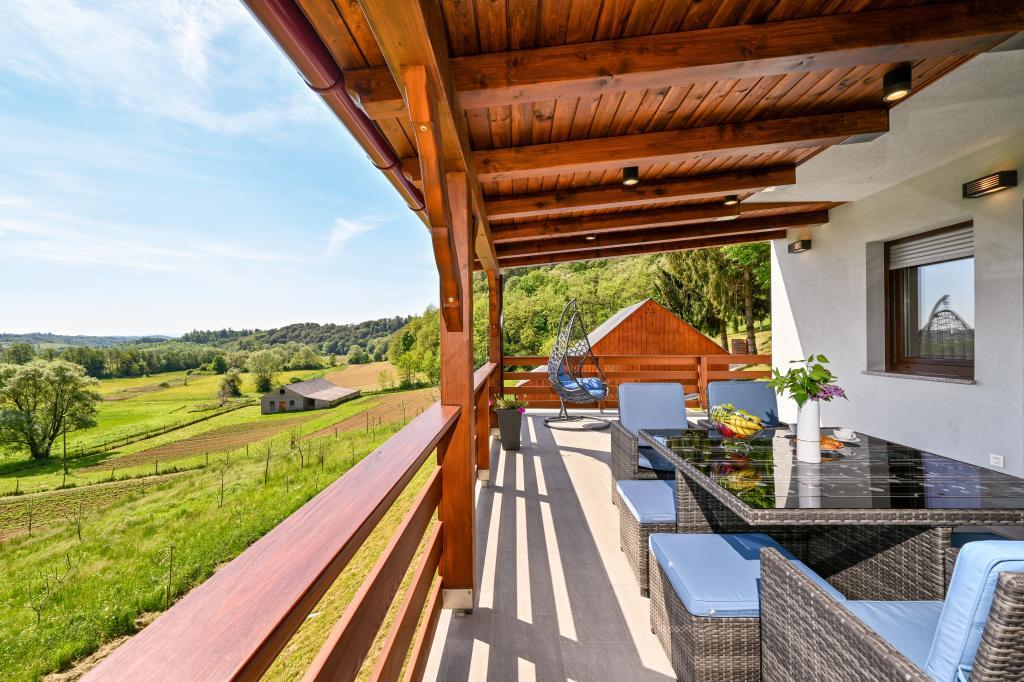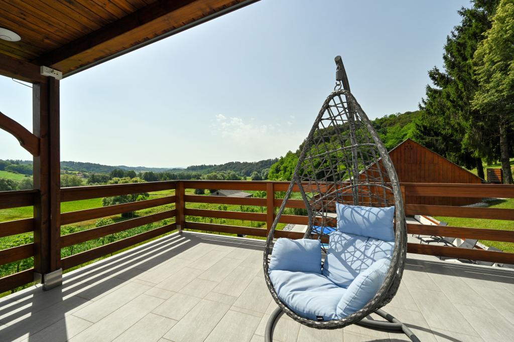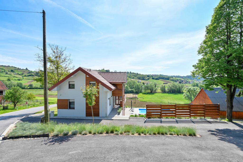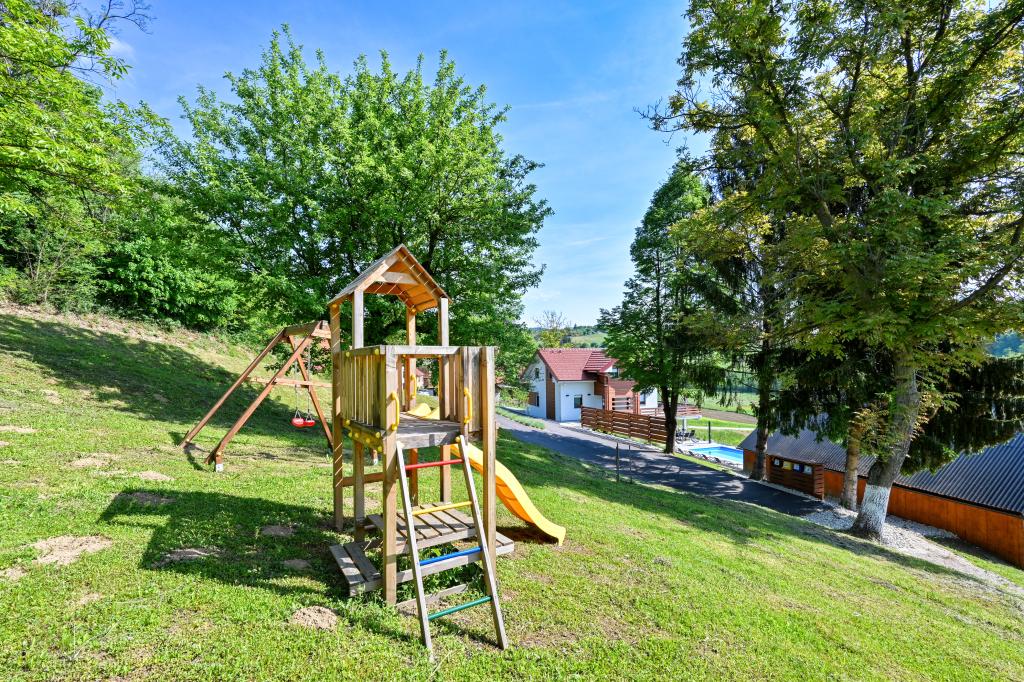 This incredible house is located on one of the many hills of beautiful Zagorje. Surrounded by hills, vineyards, orchards and forests, it is an ideal place to enjoy and rest in nature. The wonderful view that stretches allows you to enjoy beautiful sunrises, which is what the house got its name from. Sunrise Hill is categorized with 4* and provides comfortable accommodation for 8 people, and is primarily oriented towards families with children. It is perfect for a quiet vacation or socializing, but also for recreation and sports. In addition to the landscaped garden, which offers a large swimming pool with a shower and a covered and open terrace, a barbecue, a play house, parking, the house is decorated with a meticulously decorated interior dominated by wood and bright and calming tones. The house consists of a ground floor with a spacious living room with kitchen and dining room, a bathroom, a children's playroom with table football, a PS 4 game console and board games, and a spacious terrace that invites you to rest and socialize. There are three bedrooms on the first floor of the house.