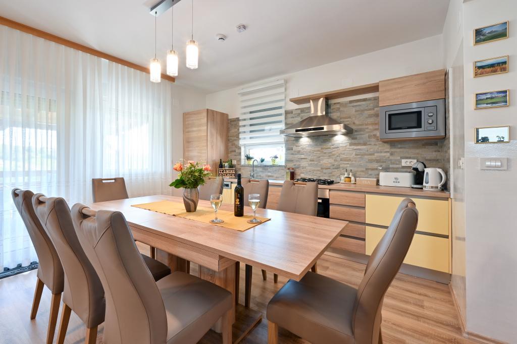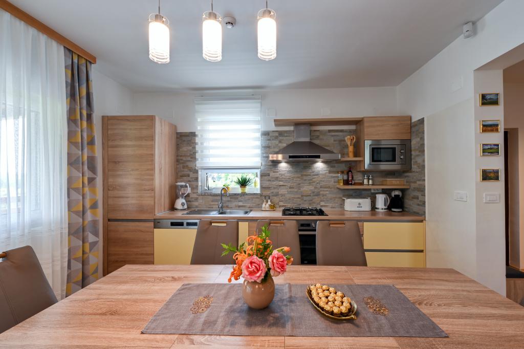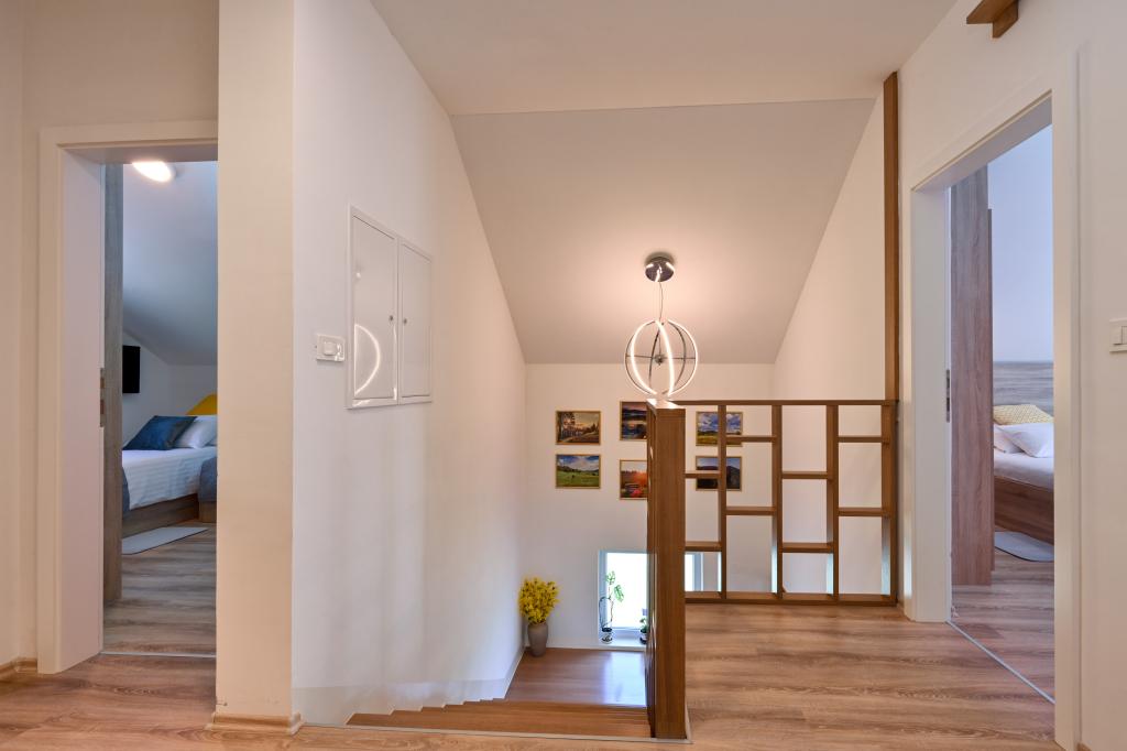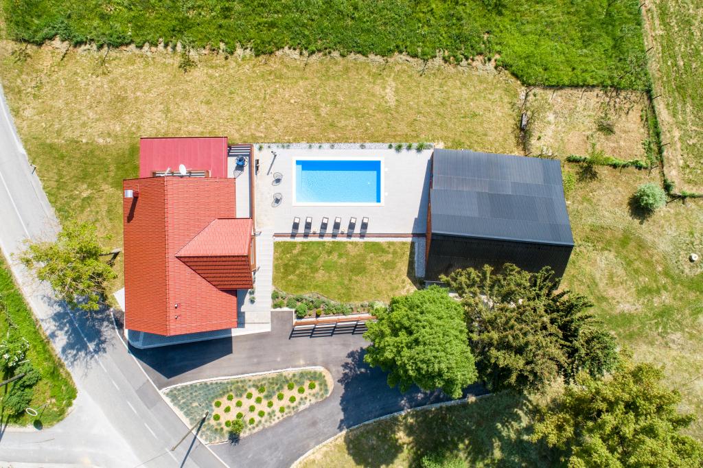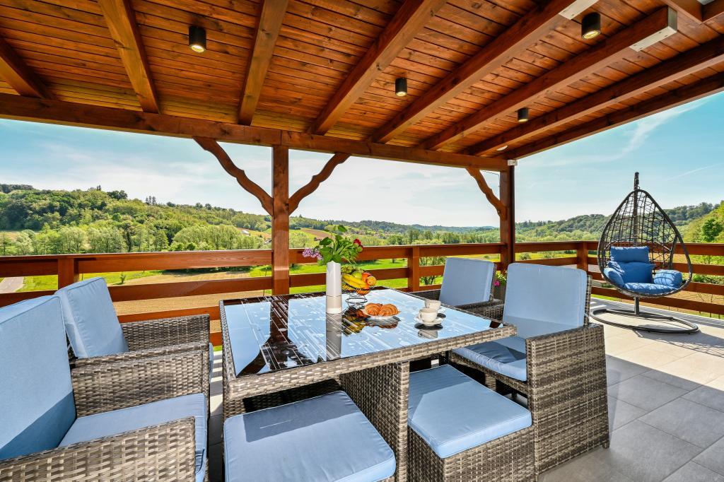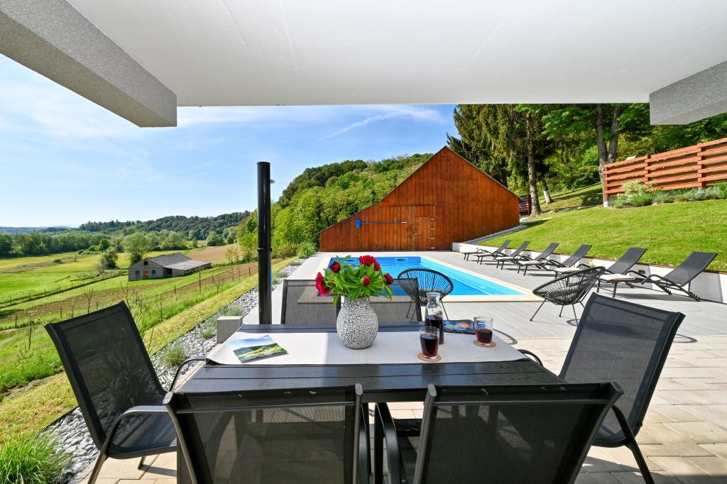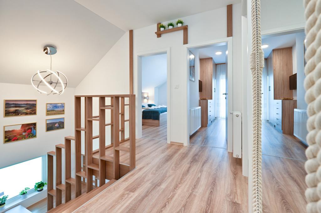This incredible house is located on one of the many hills of beautiful Zagorje. Surrounded by hills, vineyards, orchards and forests, it is an ideal place to enjoy and rest in nature. The wonderful view that stretches allows you to enjoy beautiful sunrises, which is what the house got its name from. Sunrise Hill is categorized with 4* and provides comfortable accommodation for 8 people, and is primarily oriented towards families with children. It is perfect for a quiet vacation or socializing, but also for recreation and sports. In addition to the landscaped garden, which offers a large swimming pool with a shower and a covered and open terrace, a barbecue, a play house, parking, the house is decorated with a meticulously decorated interior dominated by wood and bright and calming tones. The house consists of a ground floor with a spacious living room with kitchen and dining room, a bathroom, a children's playroom with table football, a PS 4 game console and board games, and a spacious terrace that invites you to rest and socialize. There are three bedrooms on the first floor of the house.