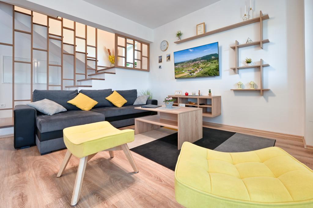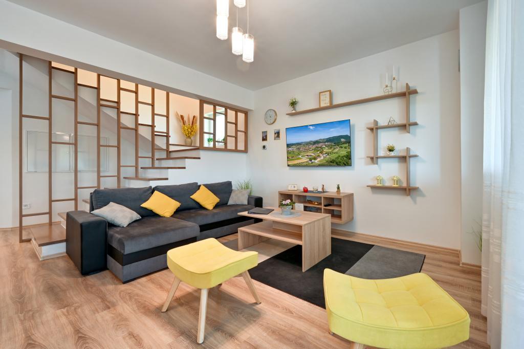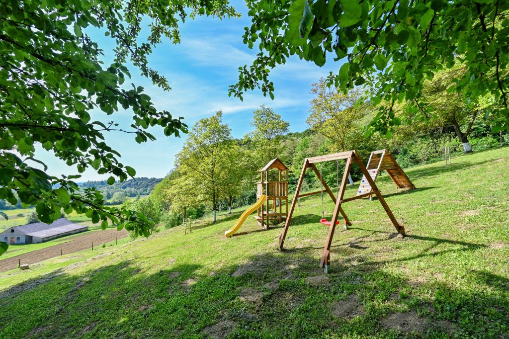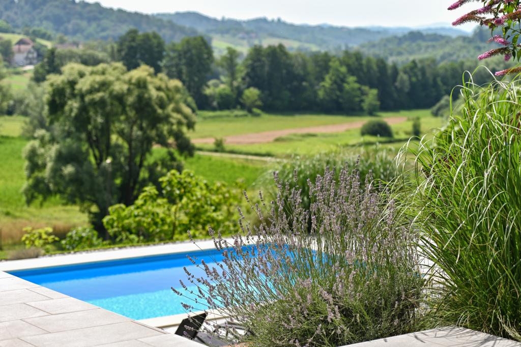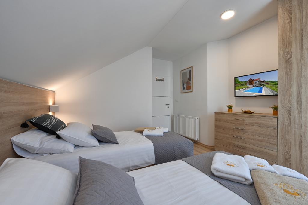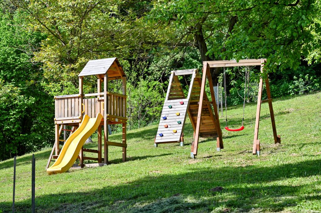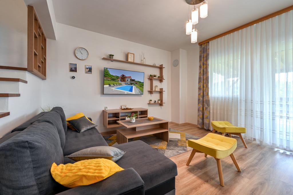 This incredible house is located on one of the many hills of beautiful Zagorje. Surrounded by hills, vineyards, orchards and forests, it is an ideal place to enjoy and rest in nature. The wonderful view that stretches allows you to enjoy beautiful sunrises, which is what the house got its name from. Sunrise Hill is categorized with 4* and provides comfortable accommodation for 8 people, and is primarily oriented towards families with children. It is perfect for a quiet vacation or socializing, but also for recreation and sports. In addition to the landscaped garden, which offers a large swimming pool with a shower and a covered and open terrace, a barbecue, a play house, parking, the house is decorated with a meticulously decorated interior dominated by wood and bright and calming tones. The house consists of a ground floor with a spacious living room with kitchen and dining room, a bathroom, a children's playroom with table football, a PS 4 game console and board games, and a spacious terrace that invites you to rest and socialize. There are three bedrooms on the first floor of the house.