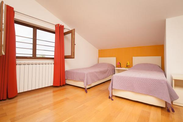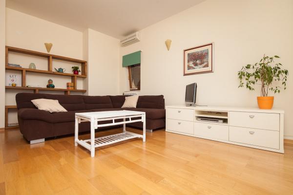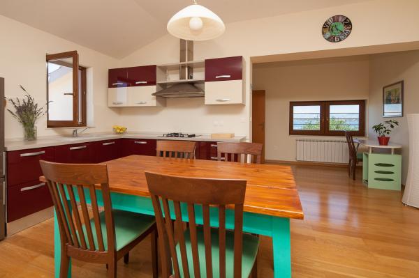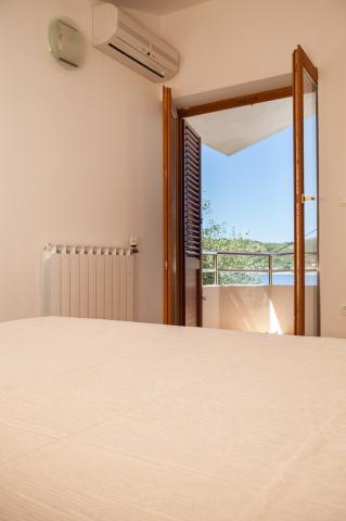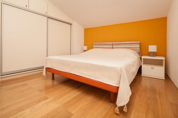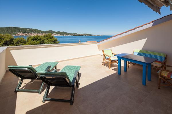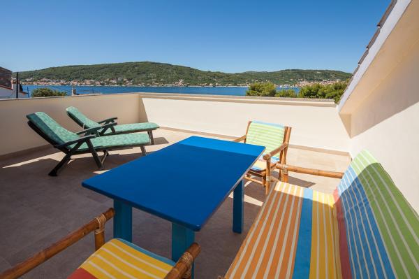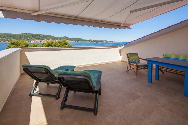 Spacious apartment with sea views from every room, with a large terrace of 25 m2 overlooking the sea and the island of Ugljan. The apartment is located in the attic of the house on a small island Osljak, the first island to Zadar. The apartment has two bedrooms. Room with balcony has a double bed measuring 180 x 200 cm and closet and overlooks the sea and the island of Ugljan. The second bedroom has two beds measuring 90 x 200 cm (which can also be easily connected to a large double bed) and closet. If necessary, it can be put an additional children's krevetić.Ova room has a view of the harbor, the city of Zadar, Velebit and part of the island of Ugljan. The bathroom is spacious with shower and washing machine. The kitchen has all the necessary utensils, refrigerator, oven and dishwasher. One air-conditioning in the living and the other in bedrooms apartments. The living room has a large corner sofa and television and a dining room open onto a terrace which has a table with chairs and two comfortable lounge chairs. The terrace is full, if necessary, can be covered with an awning.