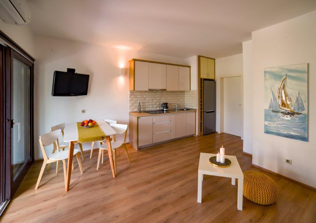 The apartments are located by the sea, first row to the sea, with a beach where guests can use the beach deck chairs. From the center of the center we have just 1000 meters away. The center of Primostena can be reached by the sea. This is a nice place to spend your vacation!