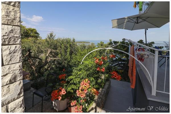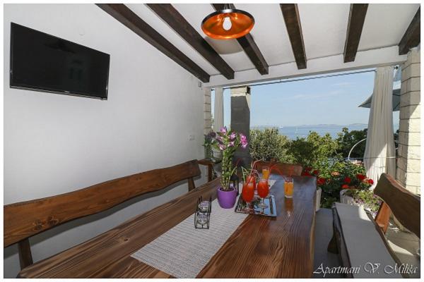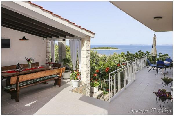 Welcome to Miliša-Vesna apartments! Enjoy the peace and beauty of our beautiful Primosten! Apartments Miliša are located in a quiet part of Primosten. 100 meters from the pebble and rocky beach and 600 meters from the center which can be reached on foot in 8 minutes. Our apartments can accommodate from 2-16 people. Each apartment is equipped with satellite TV, air conditioning and wifi. Each apartment has parking in the yard. You have a barbecue in the garden with a large shared terrace. Apartments Milisa provide you with a beautiful view from each terrace of our apartment and gives you the opportunity to enjoy the Primosten sunset which is the most beautiful and romantic sunset.