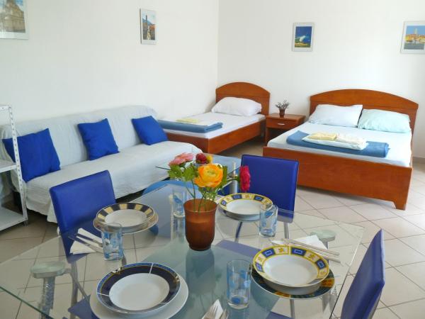Villa Maria is in centre of Primosten, 50 - 100 meters away from beautiful beaches (pebbles, sandy and rocky). On the top of apartments is big terrace with beautiful panoramic view of Primosten and beaches. Villa has eight studio apartments, two two-rooms apartments. They are all modern style and have three stars that guarantee comfort and happy vacation. Apartments have air condition, mini kitchen, refrigerator, satellite TV and view on sea. Studio apartments have three beds + additional, two big apartments have five, six beds + two additional. All apartments have they parking space. Grocery store, post office, bank, bakery and shops are all 100 meters away from apartments.