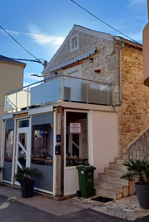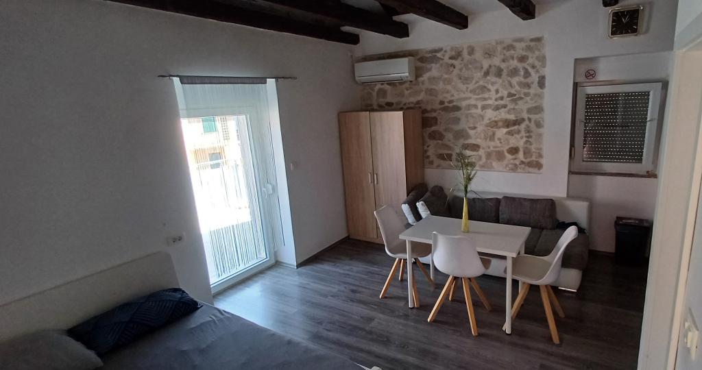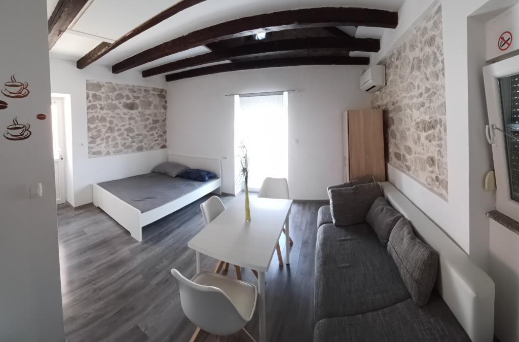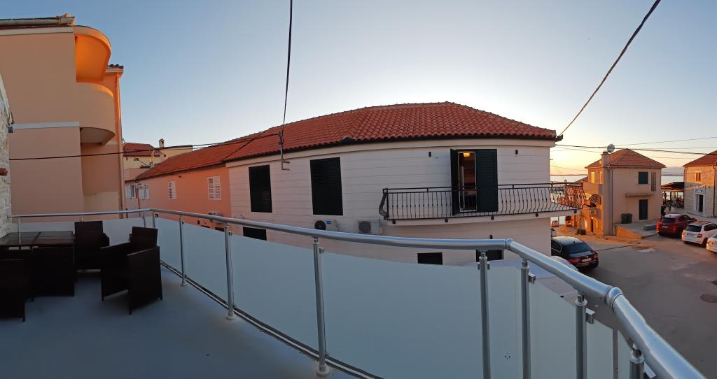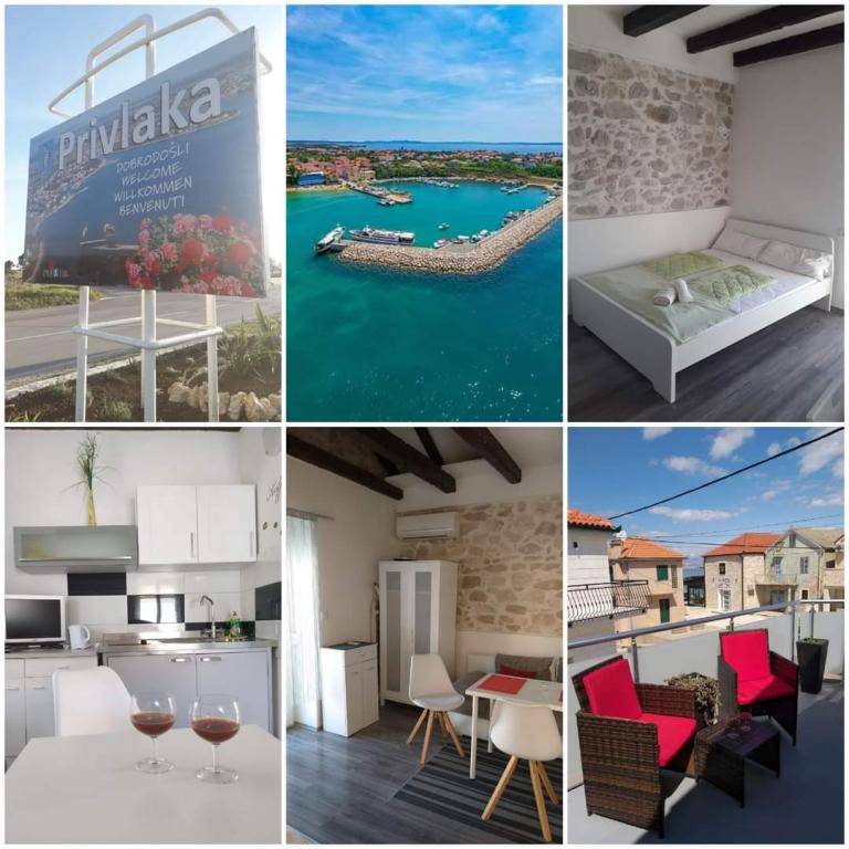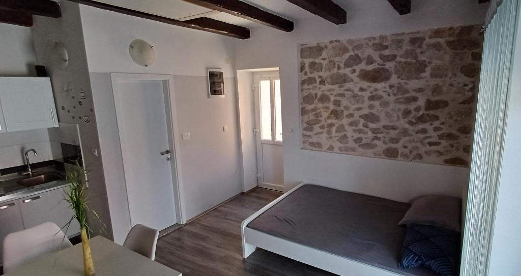 Studio apartment (460x440) in the old center of Privlaka on the first floor with separate bathroom (110x210) with shower, toilet and sink. A spacious terrace (500x260) to the northwest with a view of the sea, an awning for shade, seating and a table. Double bed (140x200) with extra bed (couch 80x200) for a third person. Kitchen with electric hob without oven, refrigerator with freezer, utensils and dishes, TV with satellite dish, wardrobe with hangers and shelves, dining table and chairs. The location is quiet, surrounded by family houses and apartments, in the immediate vicinity of the port, and sandy, rocky and concrete beaches and bathing areas. Also very close to entertainment facilities, playgrounds and numerous restaurants with a wide range of offers in all price ranges. One of them (Skoby Street Food bar) is located right below the apartment, on the ground floor of the same building, and you can order directly from your balcony! :) Bed linen and towels are not available (BYO)!