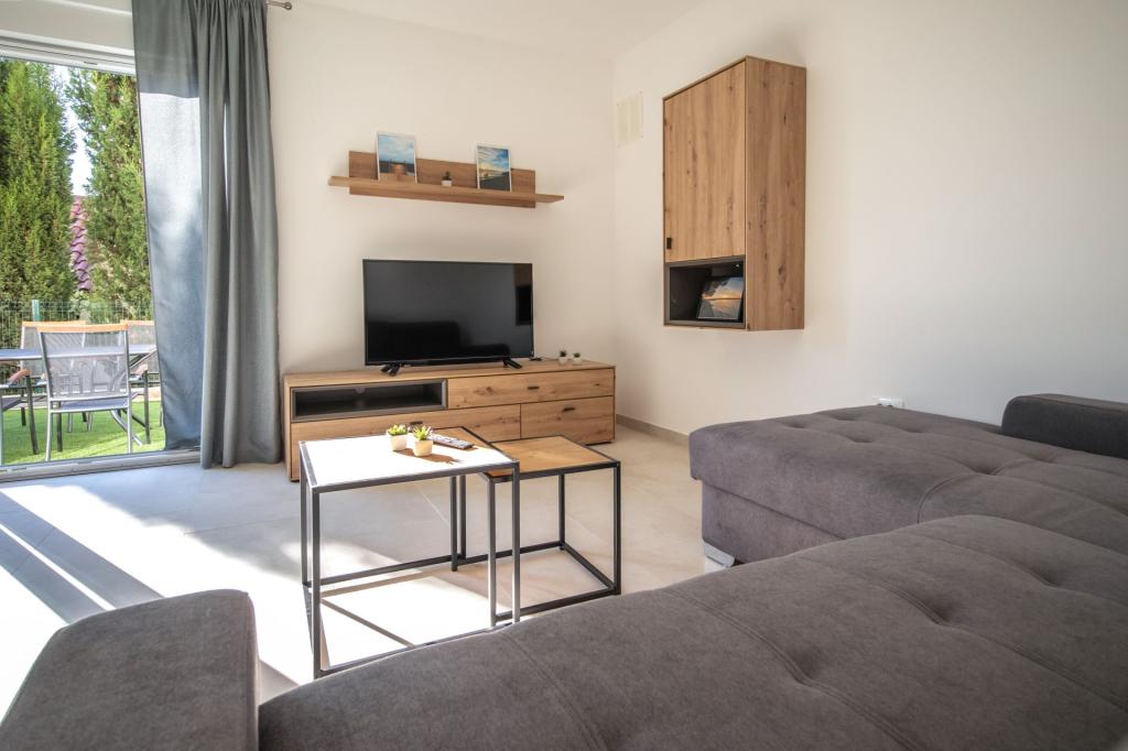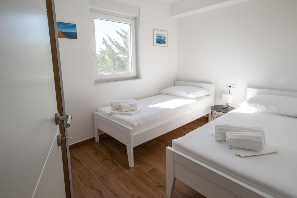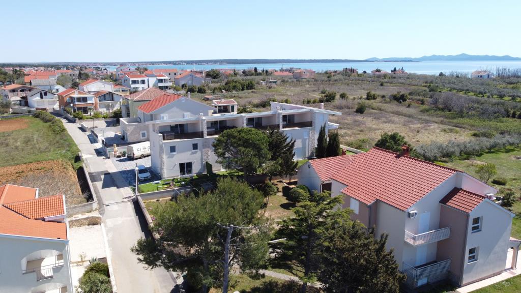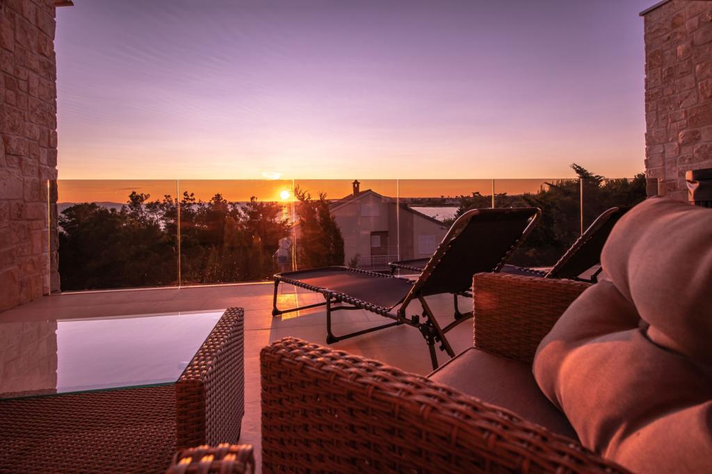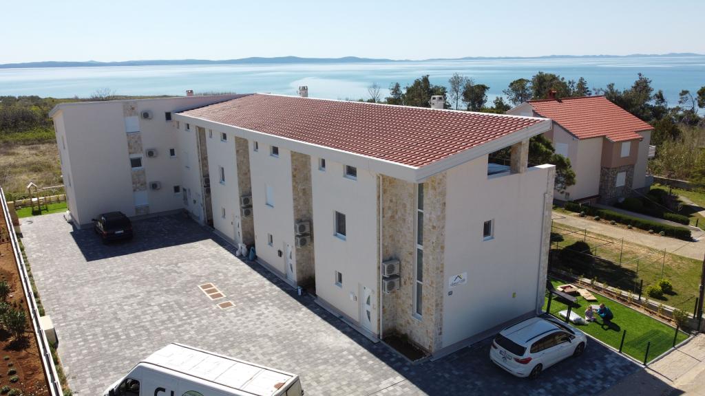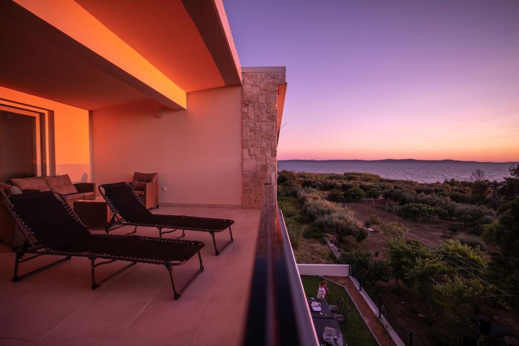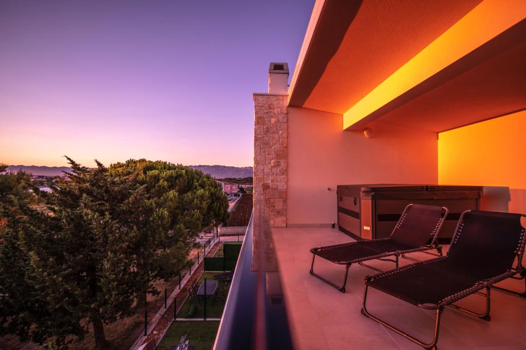 Sunset Ville is located in a quiet area of Mletak, 1 km on foot from the centre of Privlaka on promenade. Only 130 m from the house there is a nice beach with a gradual entrance to the sea (fine gravel combined with sand, sometimes pebbles). Sandy beaches lie on the other side of Mletak. Sunset Ville D3 offers: separate entrance (mesonets) 3 separate bedrooms, 2 bathrooms with toilet, 1 WC. Apartment house has front garden The house is equipped with jaccuzi on the upper terrace. In the garden is an outdoor seating. There are 2 common outdoor grills outside the apartmant.