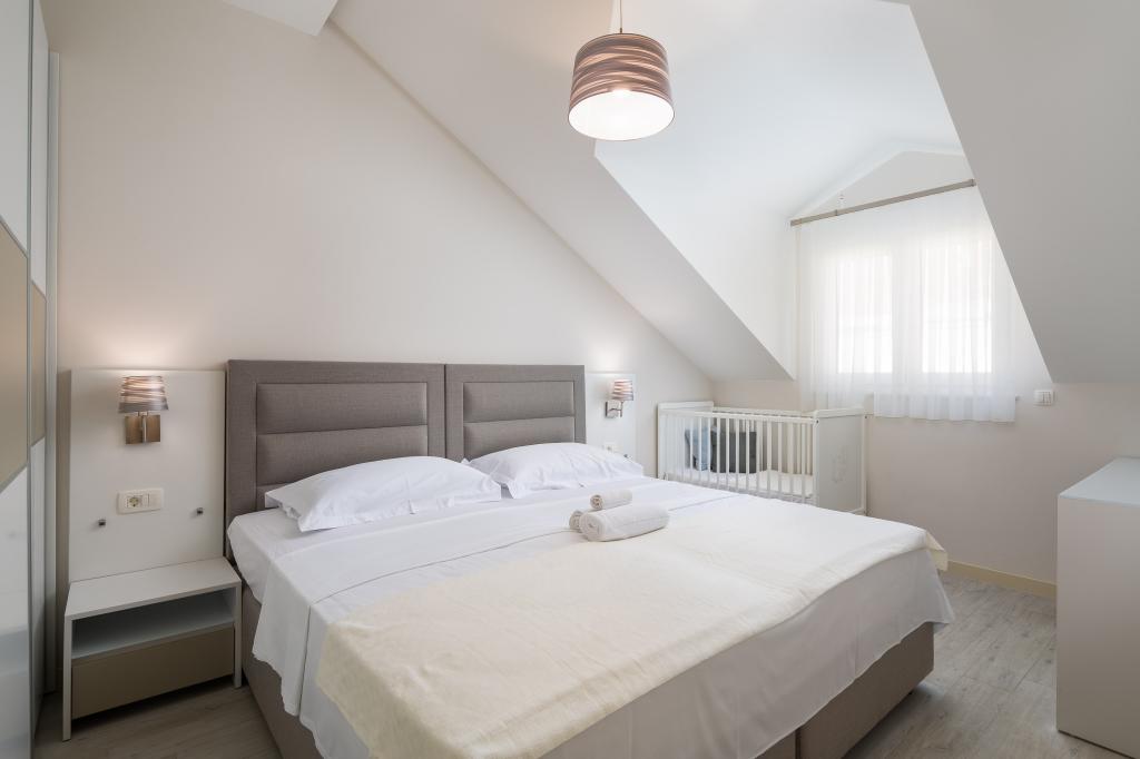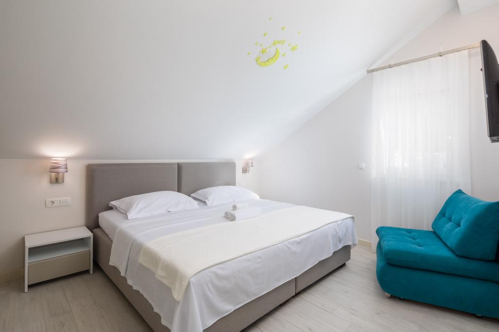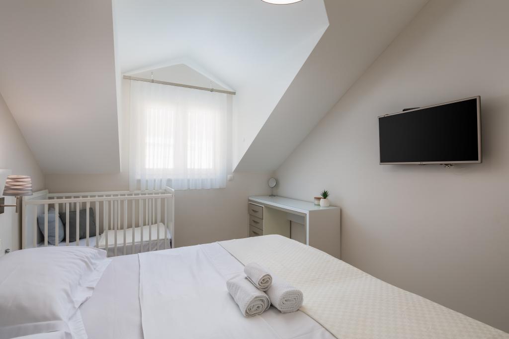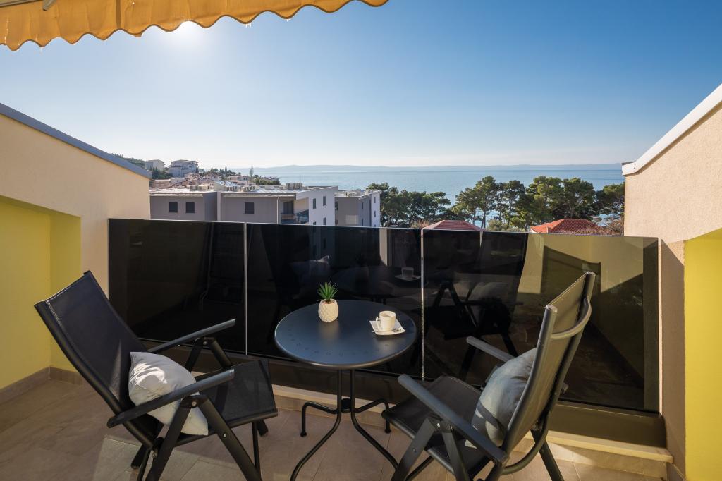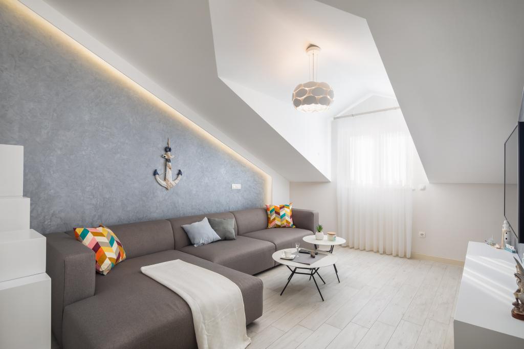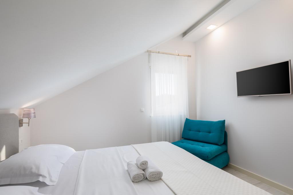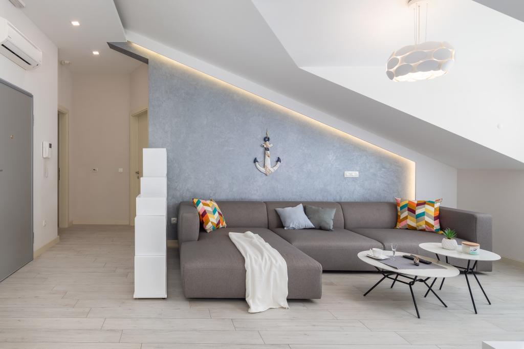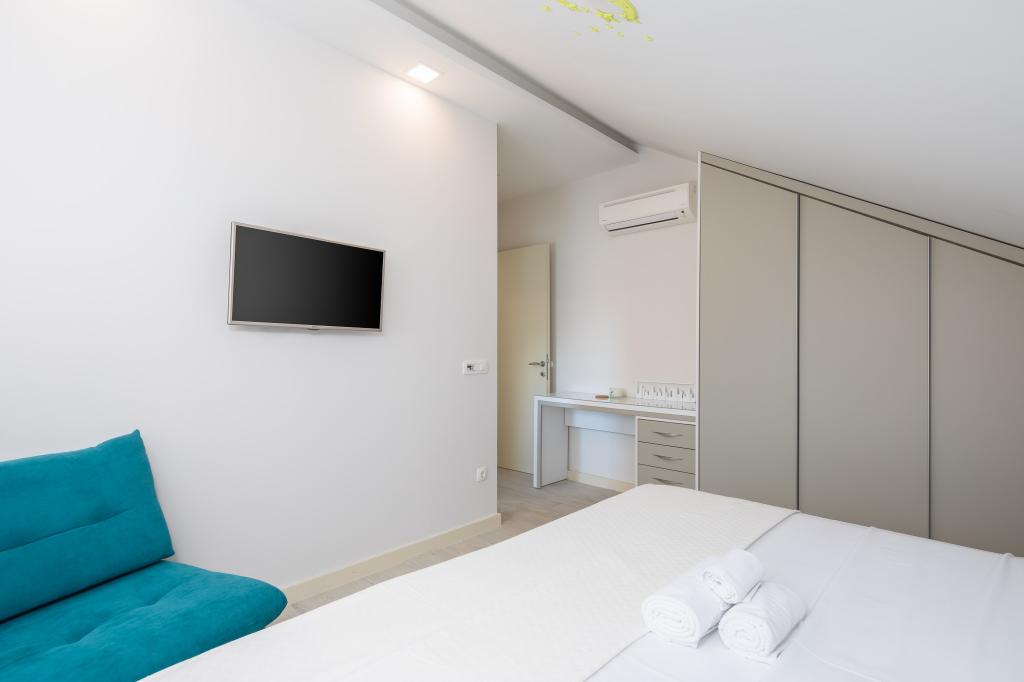 Penthouse Potter is a modern apartment with 3 bedrooms and 3 bathrooms. The spacious kitchen offers great equipment. The balcony offers a view of the sea. It is located 50m from the beach in Promajna. There are 2 parking spaces next to the building.
