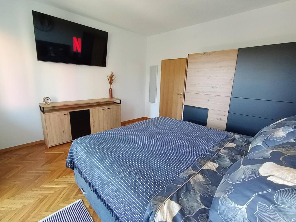 Newly renovated and fully equipped spacious apartment on the first floor of the building, in the very center of Pula. Private parking space in the courtyard of the building. One bedroom (bed 200x180) and extra bed (120x190). The building is located between the Golden Gate and the Little Roman Theatre. The bedroom and living room have access to a large terrace with a view of the Korza and greenery. The kitchen also has a terrace with a view of the yard and a parking space. Nearby are Kaštel, Arena, restaurants, galleries, bus station, etc. City beaches are 10 minutes away by car.