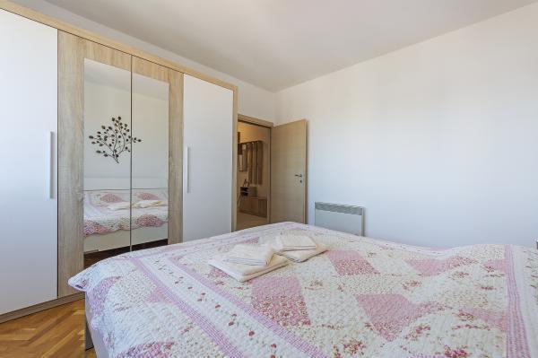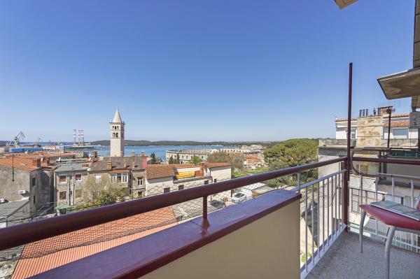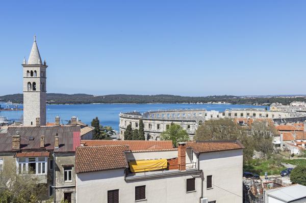 The apartment is located in a quiet street, 1 minute walk to the Amphitheater and 5 minutes walk to the center where you can take a walk through the double doors, the Archaeological Museum, the Golden Gate, the Augustan Temple, the Austro-Hungarian town market and all you can do without using transportation. The apartment is on the 4th floor with a beautiful view of the sea, the amphitheater, the castle, the lighthouse cranes mainly from the apartment offers a spectacular view of the whole of Pula. The apartment is newly furnished, is located in a residential building with a yard that has a parking space. It is suitable for 4 persons (2 2) and consists of one bedroom with double bed for two persons, living room with sofa bed suitable for adults and children, kitchen, TV, air conditioning, wi-fi internet, bathroom with shower, washing machine. The owner does not live in the house.