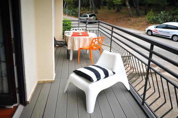 Excellent positioned and modernly equipped apartments are situated in a private house, only 150 meters from one of the most beautiful beaches in Pula. The beach is called Gortanova bay (on photo). In the garden you can use barbecue, sit and enjoy in scent of pine forest that is next to the house. In front of the house there are parking places. On the balconies of both apartments you can enjoy in your fresh prepared meals (grocery 200m) or you can go in restaurant near apartment. By the beach is beautiful promenade, jogging track and also beach bar with small park for children. All necessary is just 50-400m. Apartment (2 1) A is located on the ground floor (8 steps) and consists of a living room with sofa-bed, bedroom with double bed, kitchen, bathroom and balcony. Apartment (2 1) B is on the first floor and consists of a living room with sofa-bed and a small extra bed, bedroom with double bed, kitchen, bathroom and two balconies.