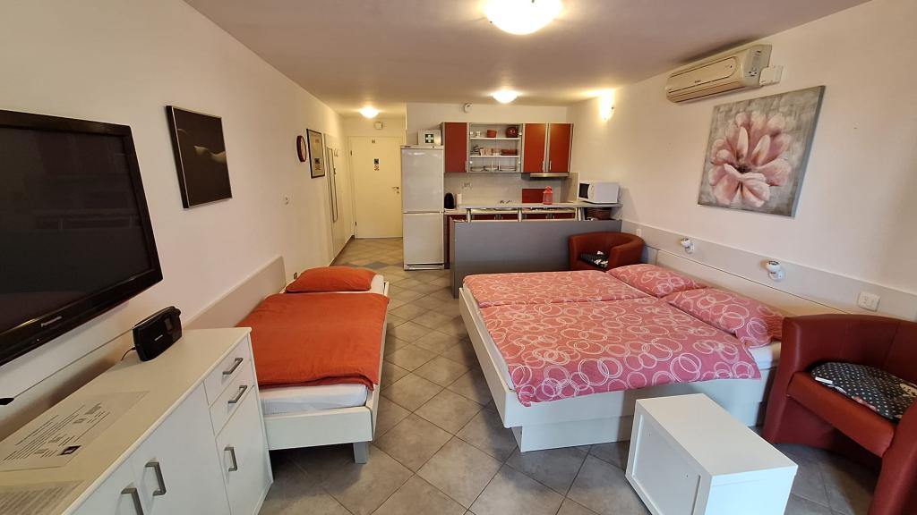 Accommodation is very nice and clean with all opremom.Idealan for a small family, and we like it that path all along the beach and there are also restaurants, pastry shops, playgrounds and entertainers for children, great place for families with children, and in addition You do not have the whole car ride home.
