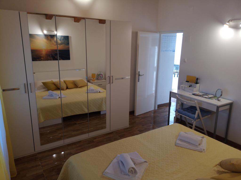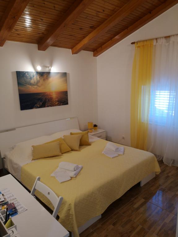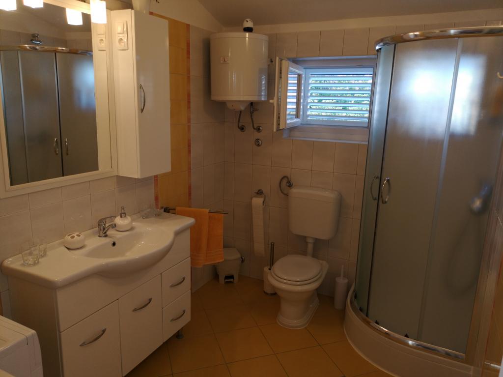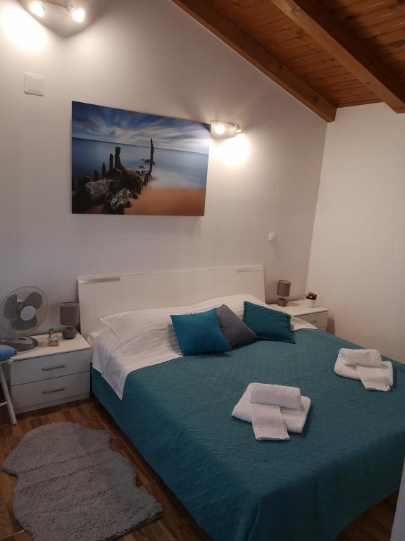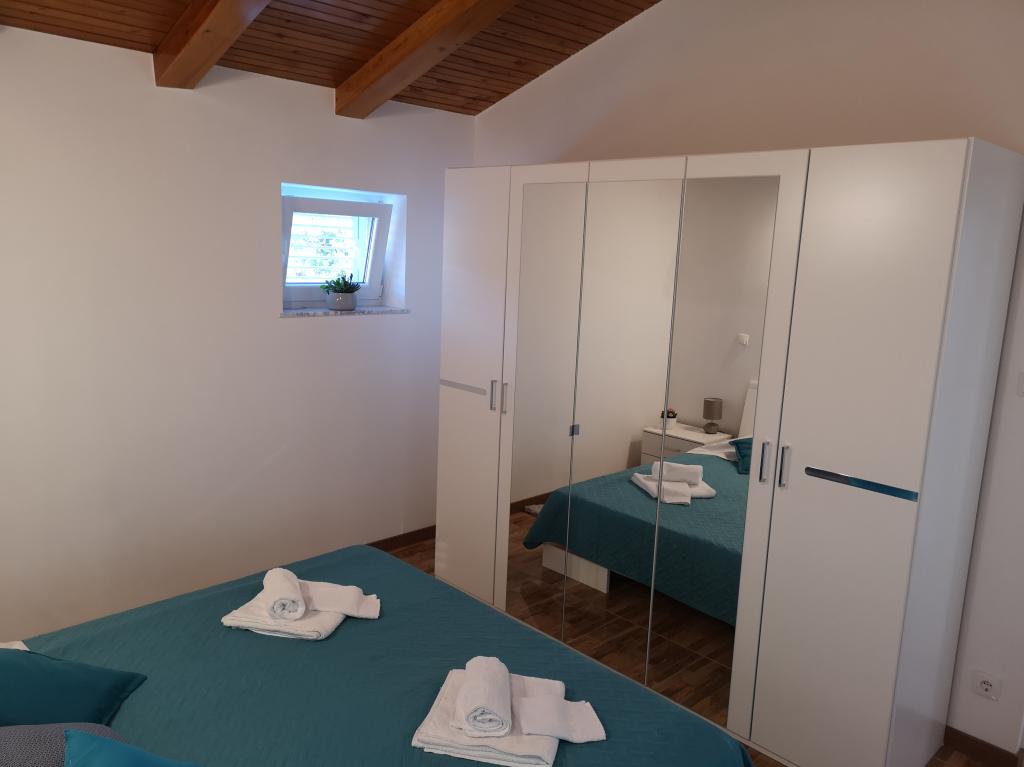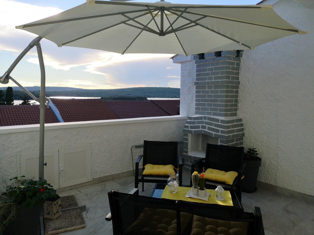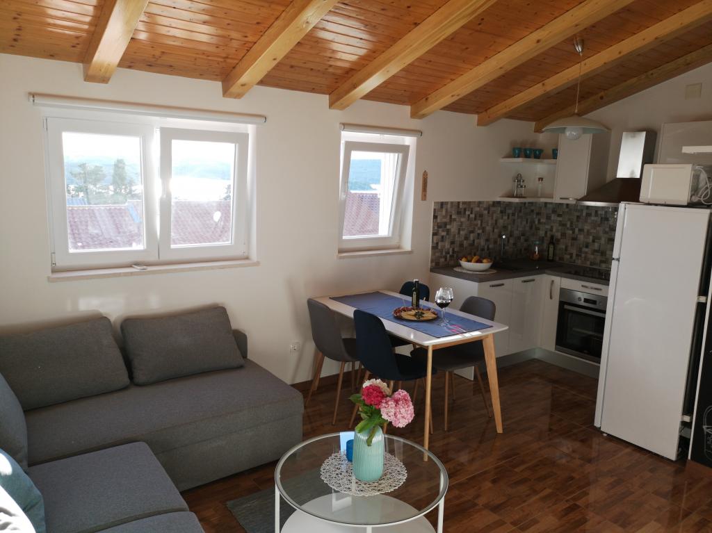 Apartment „The Rooftop“ is a newly-decorated apartment located on the top-floor our family home, giving it it’s penthouse properties and an appropriate name. The apartment consists of two large bedrooms, a large bathroom and a spacious living room with an accompanying kitchen and dining room. One of the highlights of the apartment definitely is the private roofed terrace with a beautiful view on the city of Punat, and the island of Košljun situated in the center of the Punat bay. The terrace provides an ideal chance to view how the golden sun sets into the beautiful blue sea or just to relax by the candlelight and enjoy a warm summer’s eve. The amenities provided include a flat-screen TV, radio, free wireless internet access, air conditioning and several more others. The house has a garden, filled with flowers, a wooden table with benches placed next to a barbecue, and a parking spaces secured for guests.