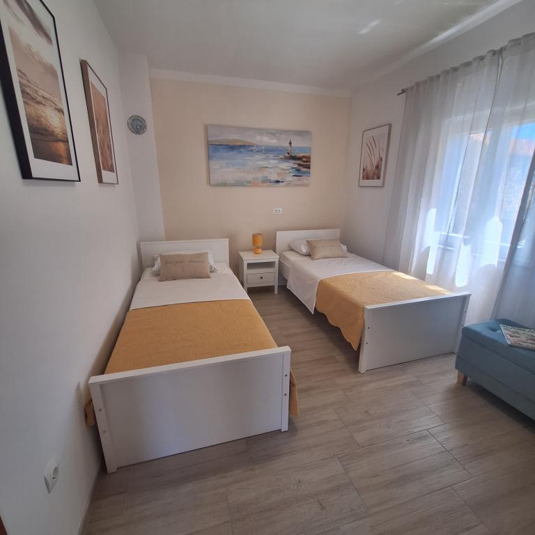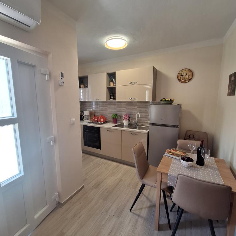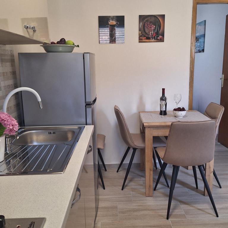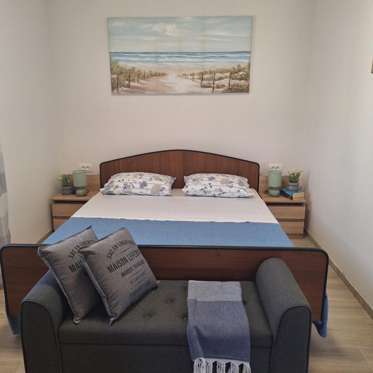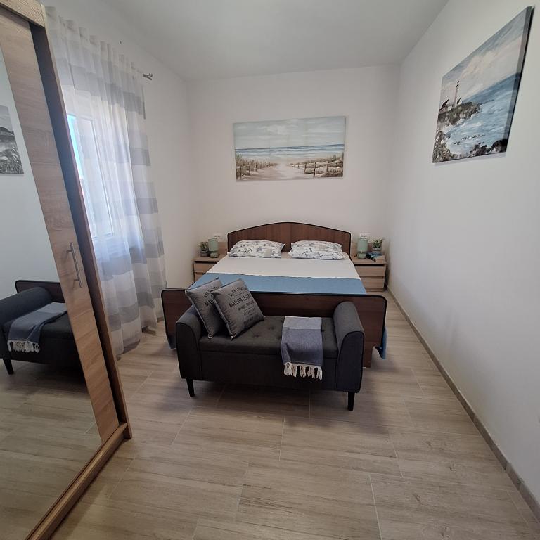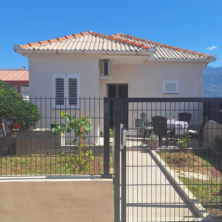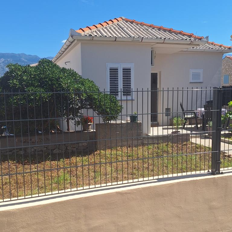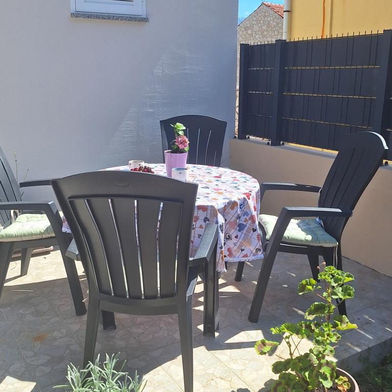 The fully furnished house of 45 m2 is located in Ražanac, a small town with a view of Velebit. The house is located a few minutes' walk from the very center of Ražanac, restaurants, pharmacy, shops, post office, fish market, market. The first store is a minute's walk away, Tommy supermarket is about 10 minutes' walk away. There is parking for one small car within the house. The house consists of a kitchen, bathroom with toilet and shower and two bedrooms. It has air conditioning, dishwasher, washing machine, coffee machine, kettle, oven, refrigerator with small freezer, hair dryer, clothes dryer, iron, ironing board, towels, dishes for 6 people. Both bedrooms have TV sets with max tv receiver. Free Wi-Fi is also available. In front of the house is a terrace with a table and chairs and a parasol.