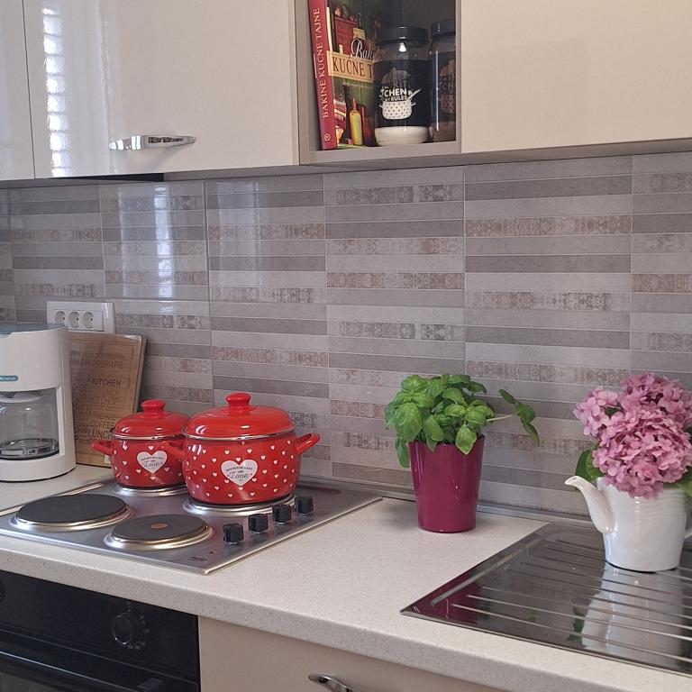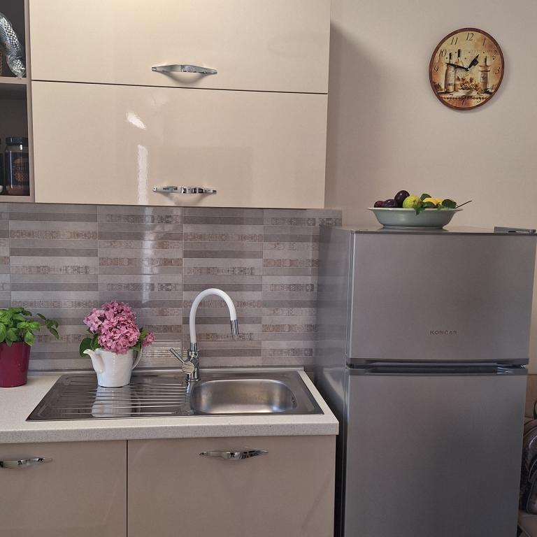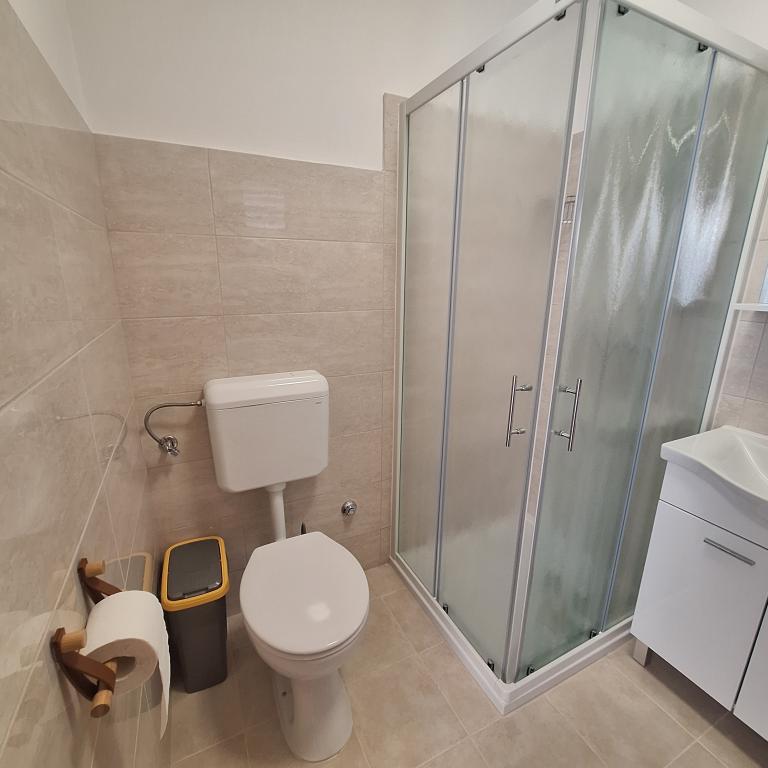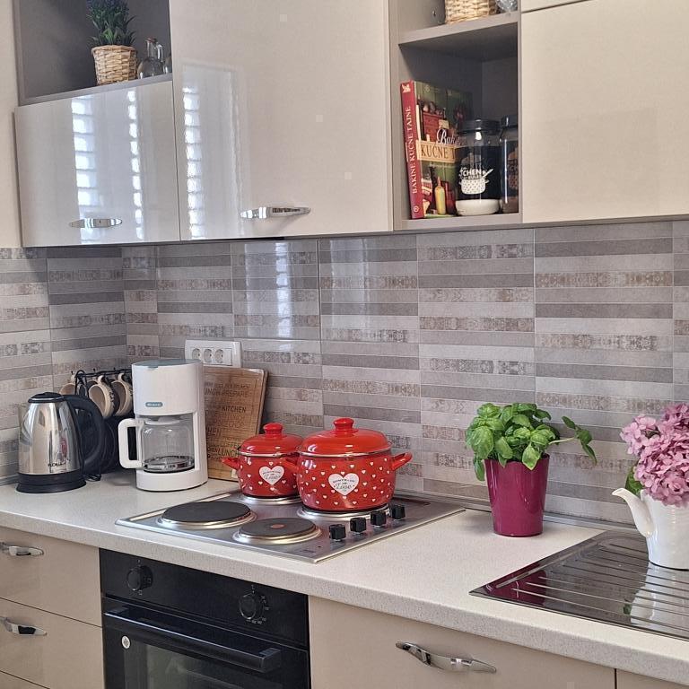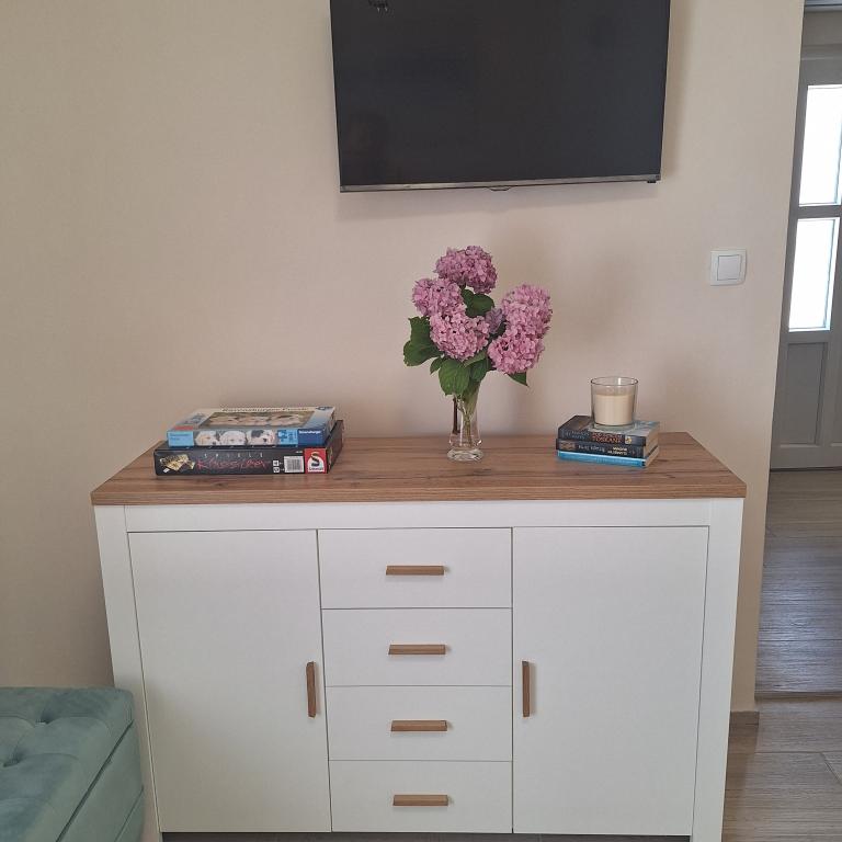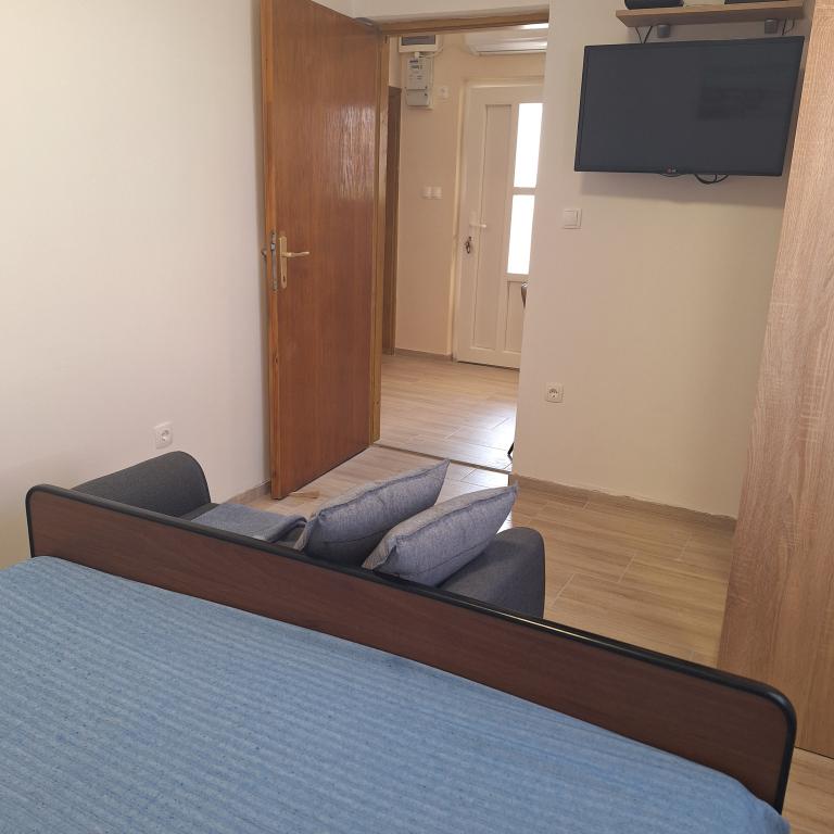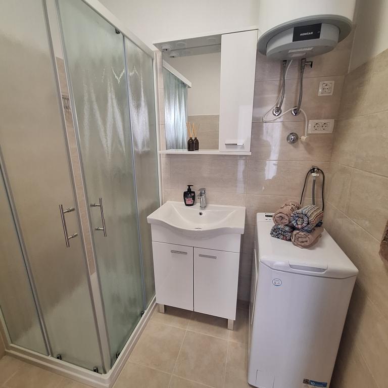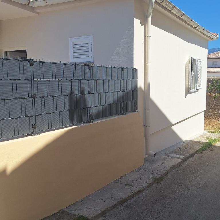 The fully furnished house of 45 m2 is located in Ražanac, a small town with a view of Velebit. The house is located a few minutes' walk from the very center of Ražanac, restaurants, pharmacy, shops, post office, fish market, market. The first store is a minute's walk away, Tommy supermarket is about 10 minutes' walk away. There is parking for one small car within the house. The house consists of a kitchen, bathroom with toilet and shower and two bedrooms. It has air conditioning, dishwasher, washing machine, coffee machine, kettle, oven, refrigerator with small freezer, hair dryer, clothes dryer, iron, ironing board, towels, dishes for 6 people. Both bedrooms have TV sets with max tv receiver. Free Wi-Fi is also available. In front of the house is a terrace with a table and chairs and a parasol.