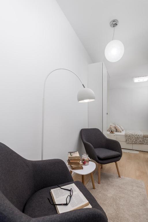 In addition to all modern appliances, the apartment rental price includes a TV and free broadband internet. Next to the building itself and in the immediate vicinity, there are also street parking lots and a large closed city parking lot.