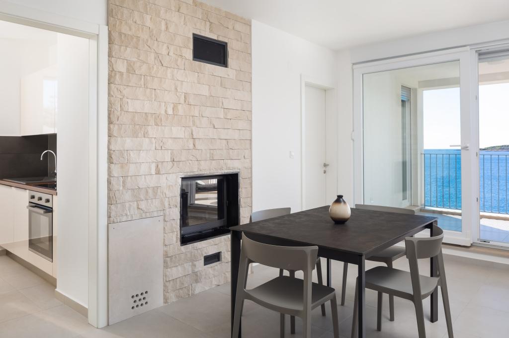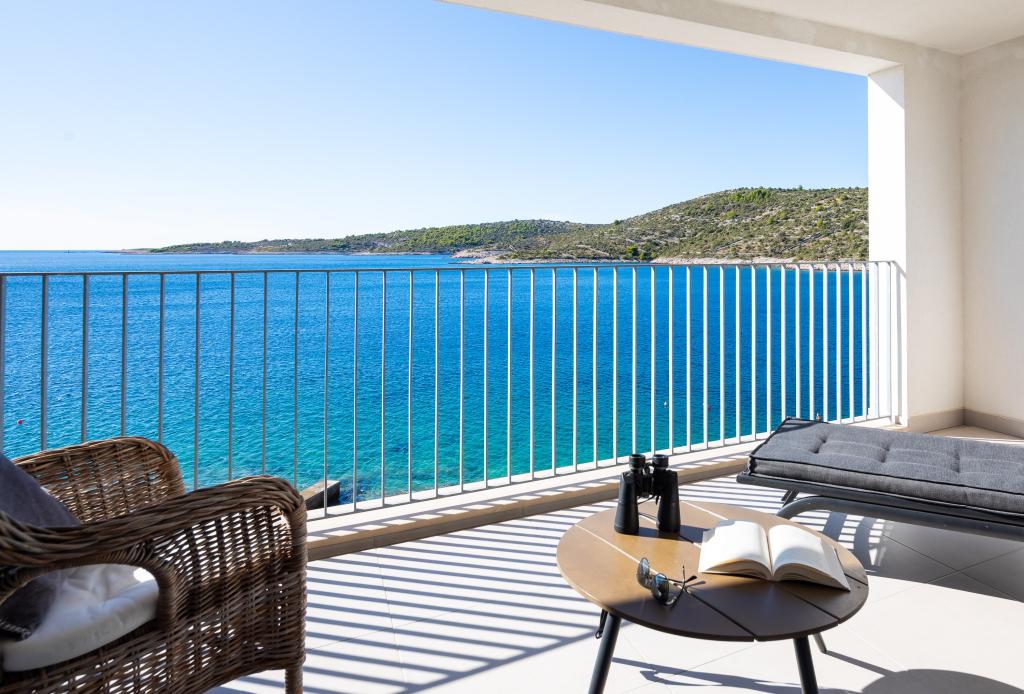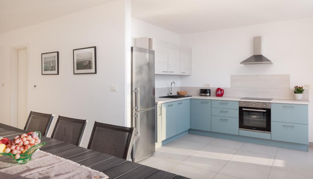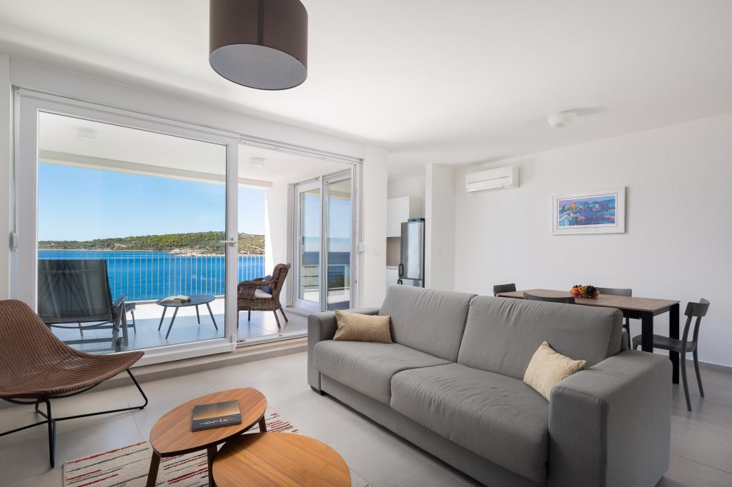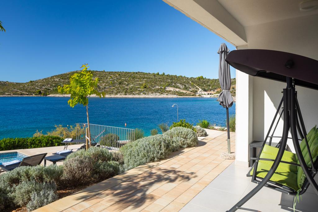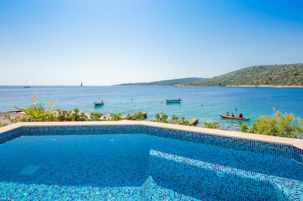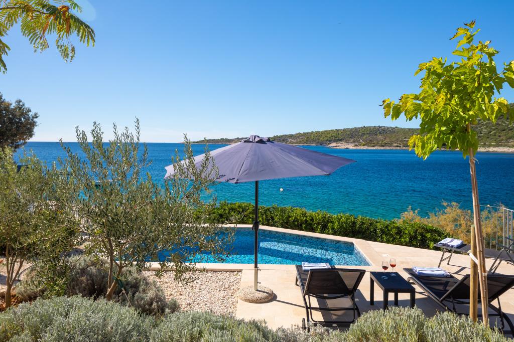 Villa CapeCarol is located in the very heart of sunny Dalmatia, in the tourist resort of Kanica. This modern villa is located right next to the coast and offers a magnificent panoramic view of the crystal clear sea and the untouched nature that surrounds it. The beautiful villa CapeCarol with a living area of 310 m2 offers its guests the privacy of a stay on three fully equipped floors-apartments. Both the exterior and the interior of the house are characterized by a clean, modern style that gives the villa a natural, pleasant atmosphere. Each 95m2 apartment has a large living room and kitchen, 2 bedrooms (1 with a double bed and 1 with separate beds) and 2 bathrooms. Each apartment has a large terrace with a beautiful view of the sea. Exclusive use of the swimming pool (15 m2) and the front yard/terrace is available with the rent of the SeaCarol apartment on the ground floor. The villa has a total of 3 private parking spaces, 1 space for each apartment. Mooring for a smaller boat is possible.