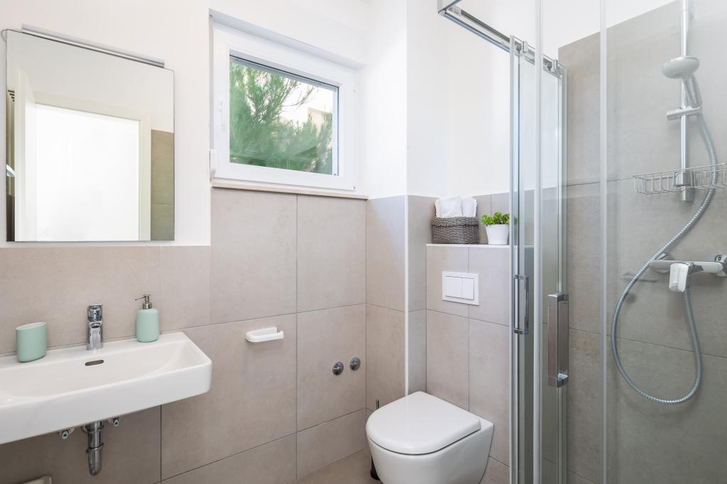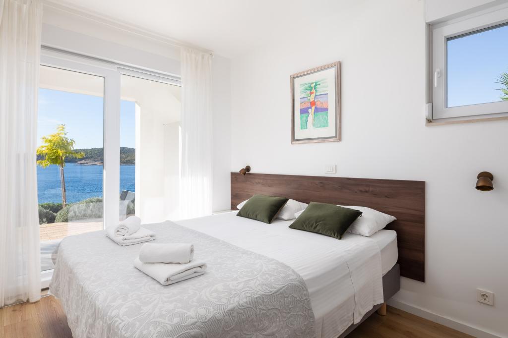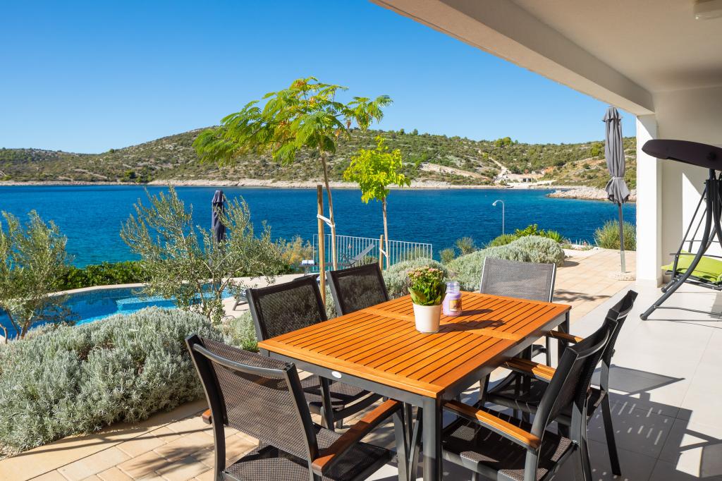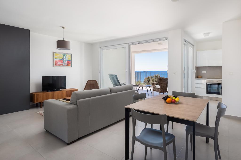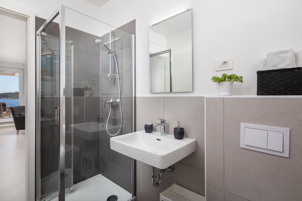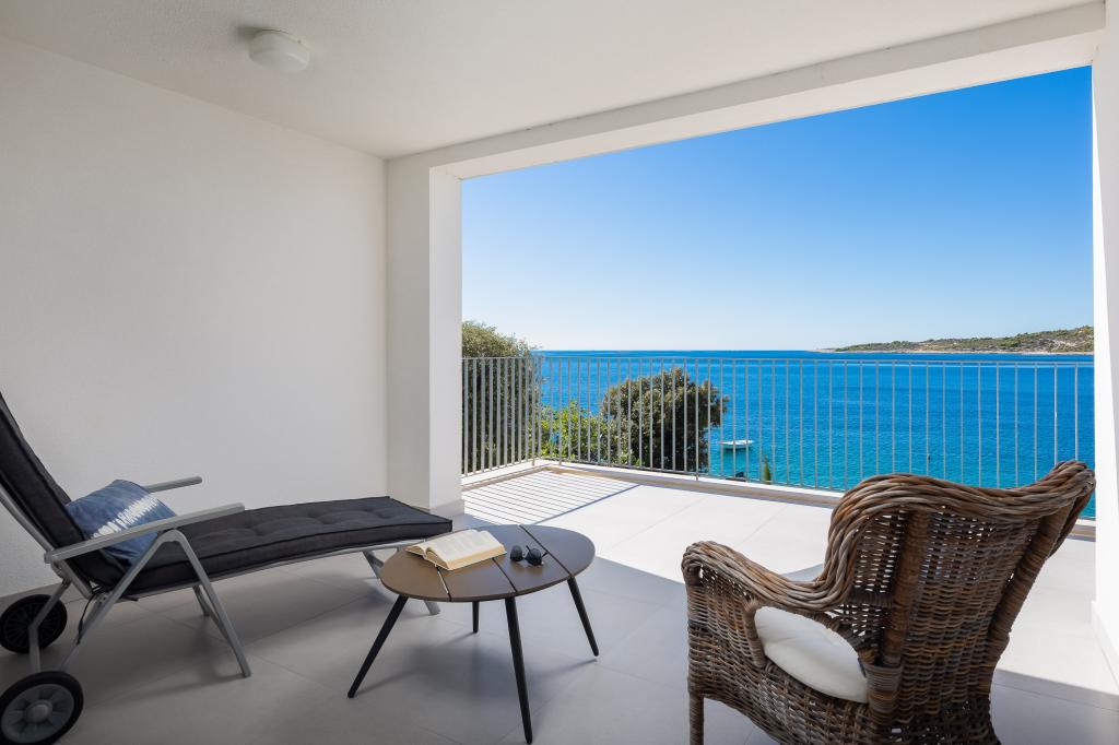 Villa CapeCarol is located in the very heart of sunny Dalmatia, in the tourist resort of Kanica. This modern villa is located right next to the coast and offers a magnificent panoramic view of the crystal clear sea and the untouched nature that surrounds it. The beautiful villa CapeCarol with a living area of 310 m2 offers its guests the privacy of a stay on three fully equipped floors-apartments. Both the exterior and the interior of the house are characterized by a clean, modern style that gives the villa a natural, pleasant atmosphere. Each 95m2 apartment has a large living room and kitchen, 2 bedrooms (1 with a double bed and 1 with separate beds) and 2 bathrooms. Each apartment has a large terrace with a beautiful view of the sea. Exclusive use of the swimming pool (15 m2) and the front yard/terrace is available with the rent of the SeaCarol apartment on the ground floor. The villa has a total of 3 private parking spaces, 1 space for each apartment. Mooring for a smaller boat is possible.