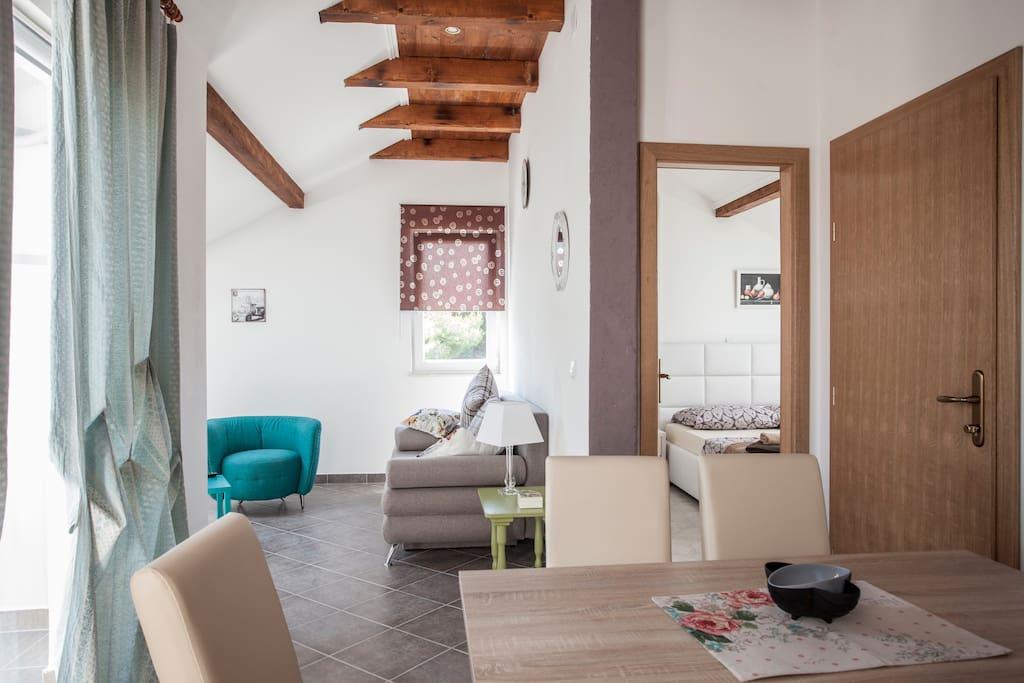 The reservation of the apartment was made after a previous conversation with the owner and was paid after the same down payment of HRK 1,000. When we arrived at the apartment, we were convinced that everything was not exactly as shown in the photos. The apartment is advertised as A4. To anyone reasonable, this would mean that there are four beds. In the ad, there are two photos that give the impression that there are two bedrooms with two beds each. However, it is the same room only with two different bedding. So where to put two more people? On that extra bed? How is it possible that someone advertises as A4, and does not have the basic conditions for that? That's why I won't go on and write about the fact that my original question was whether the apartment is available for a disabled person? Of course, if we had to give up the accommodation on the spot and buy another one... the advance payment was not returned!!