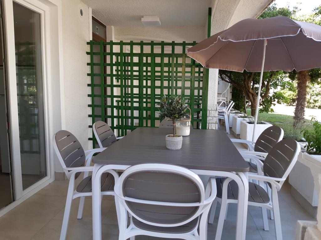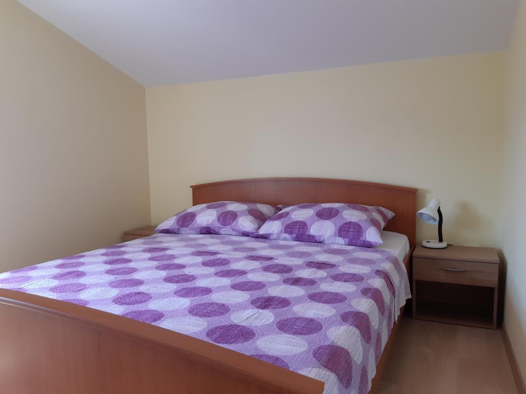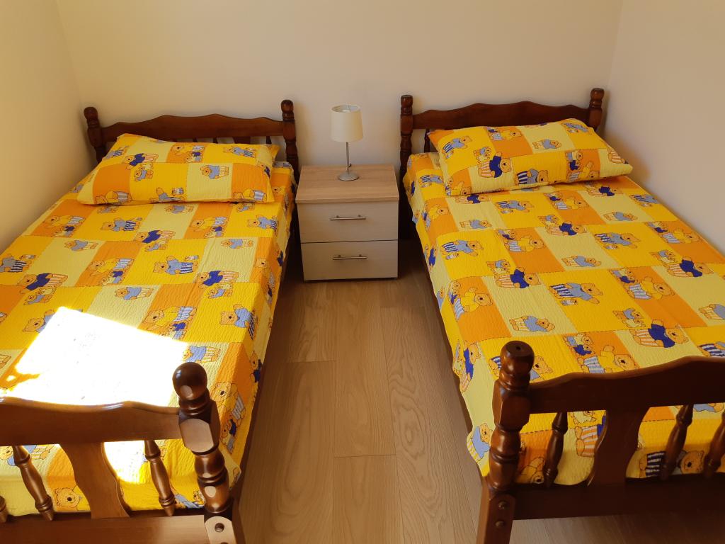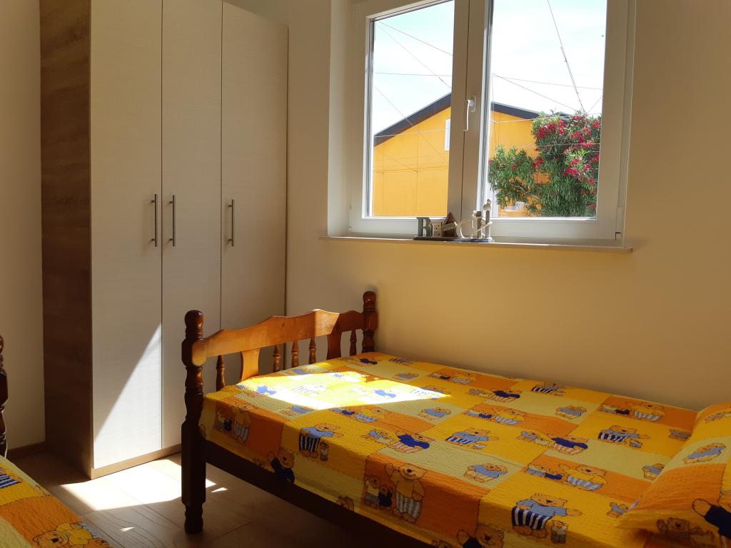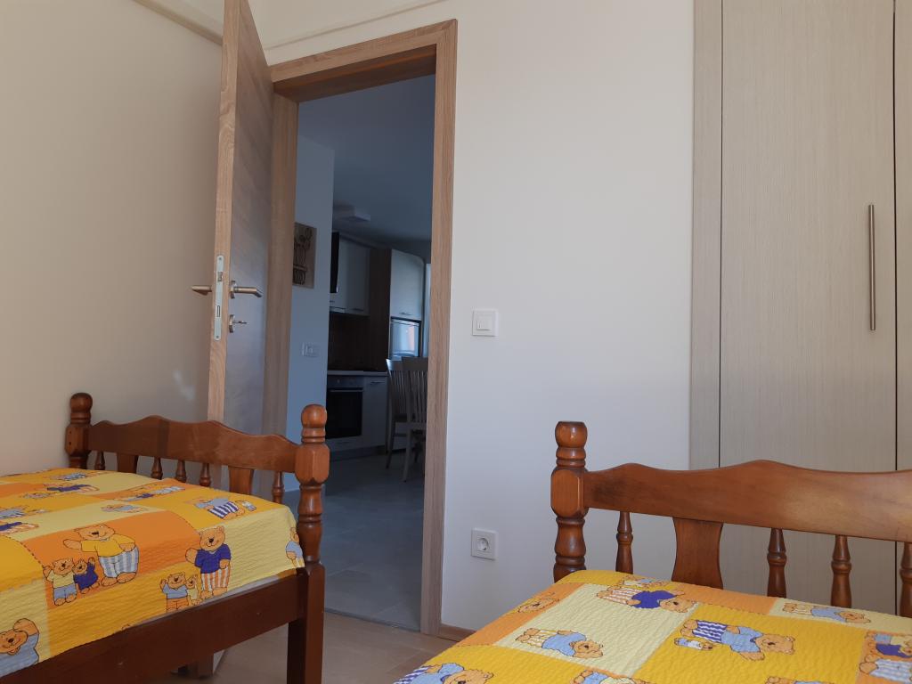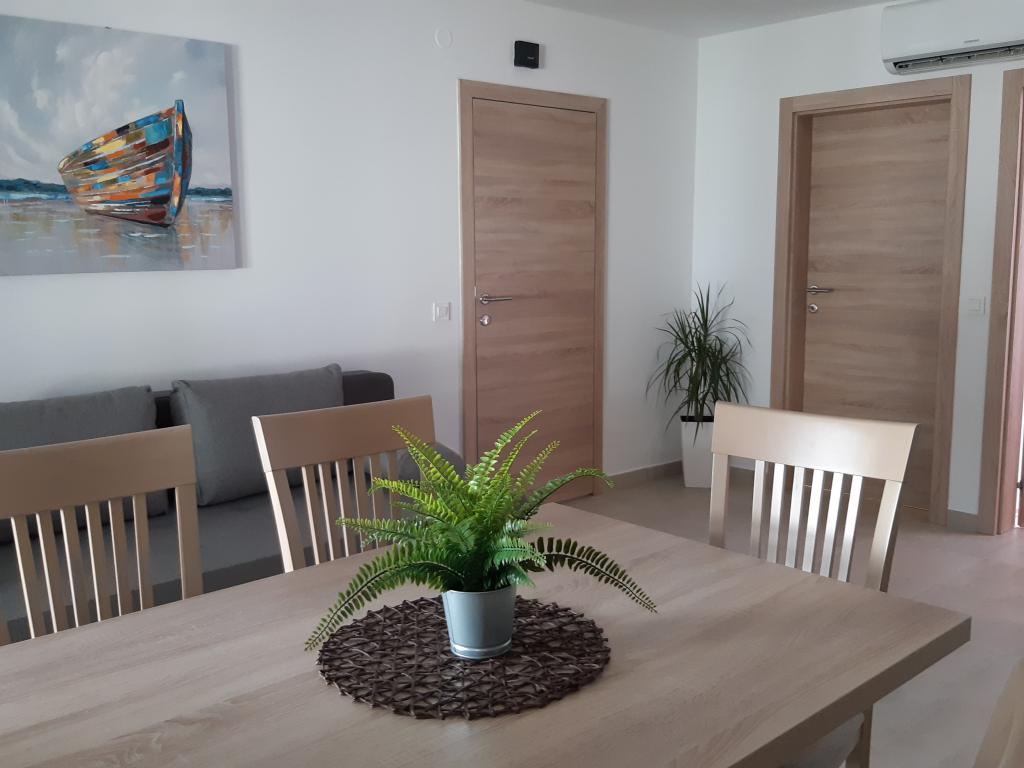 Newly and modernly furnished apartments. Location in the settlement - first row to the sea. Apartments with two bedrooms (one with a double bed, and the other with two separate), kitchen with dining room, covered terrace, bathroom with toilet and shower. TV, kettle, microwave oven, hob, oven, fridge with small freezer. Two-seater in the dining room (extra bed for 2 persons) or in the room with a double bed (extra bed for 1 person). Promenade to the center of the village - shop, bakery, fruit shop, coffee bar, ice cream - 2 min walk. The first restaurant 50 m. In front of the building there is a park and a pine forest with sports facilities and a fenced new children's playground. Two coffee bars in the park. Closed courtyard of our facility. Air conditioning, parking covered with a protective net, Wi-fi, fees and taxes, outdoor shower and use of grill included in the price.