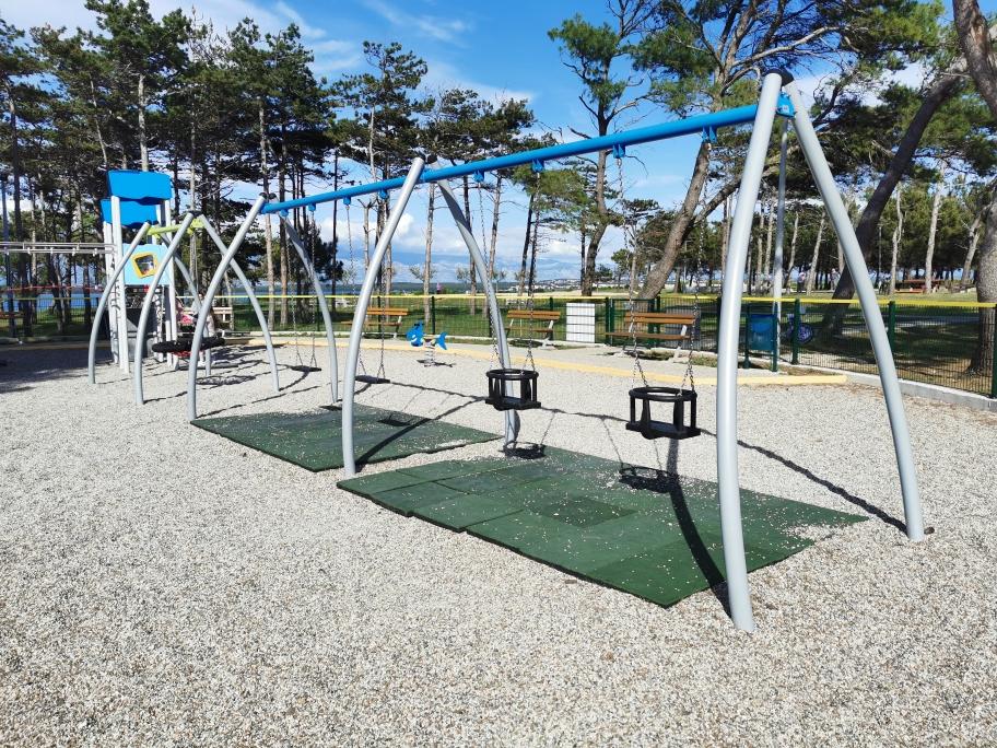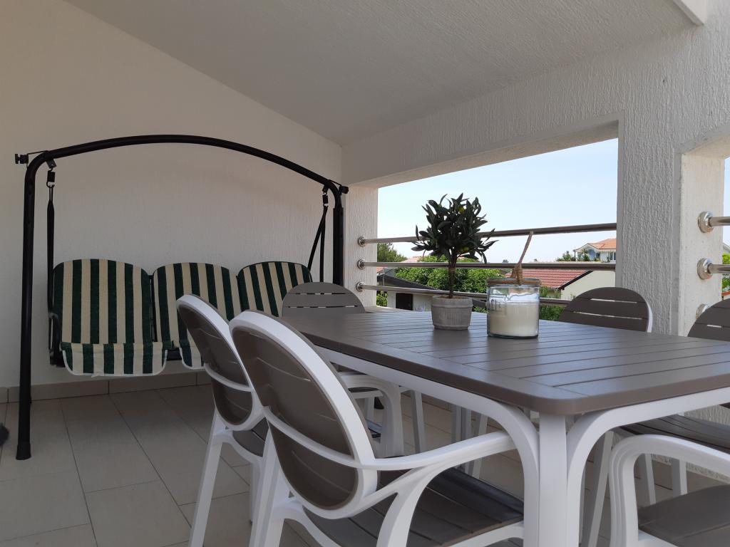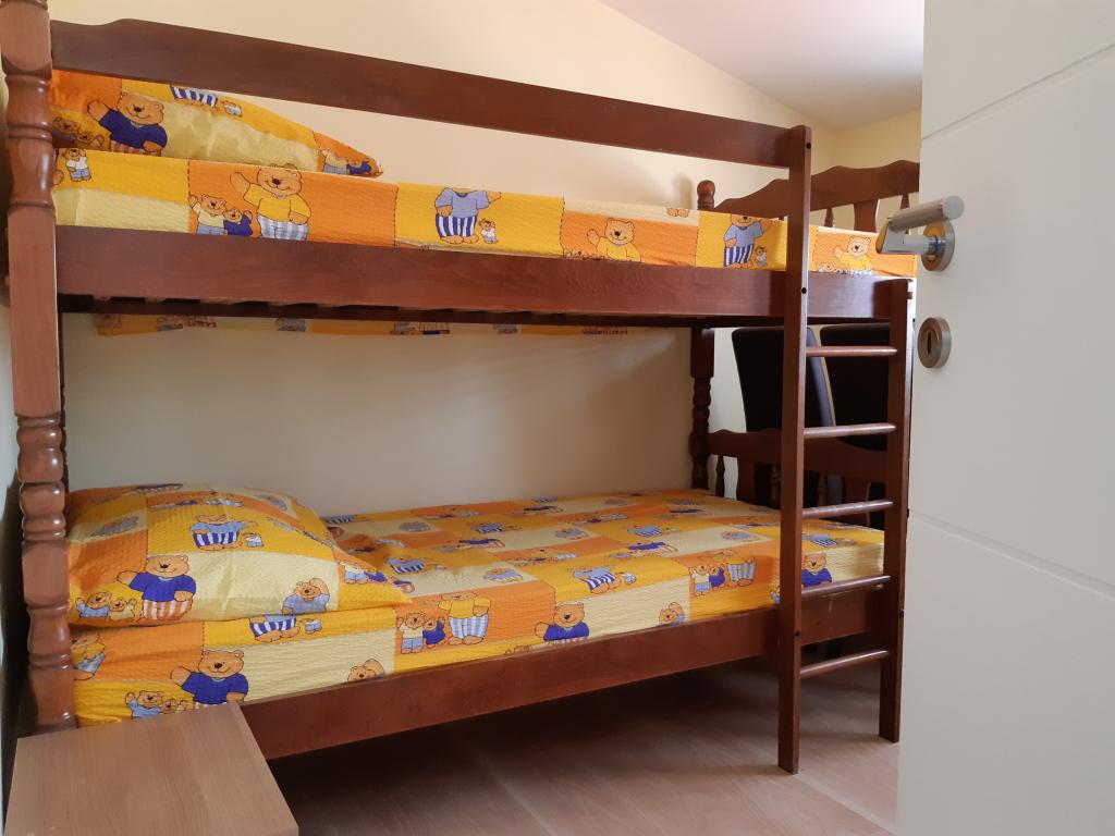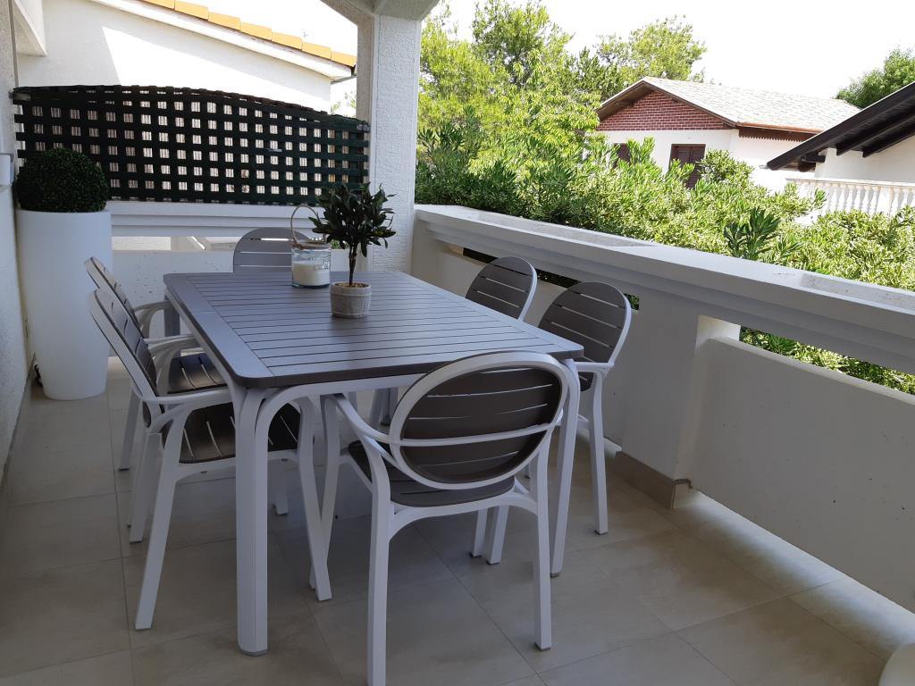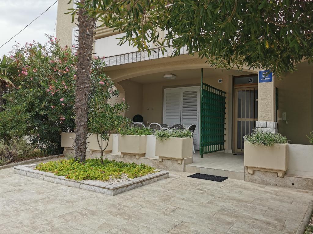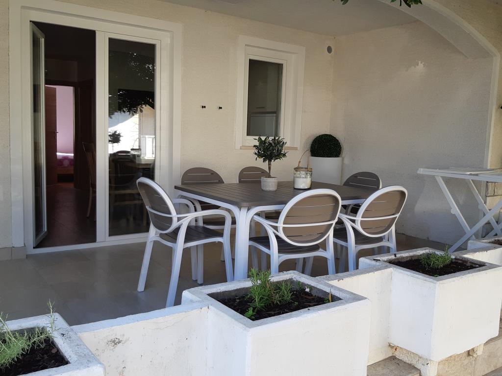 Newly and modernly furnished apartments. Location in the settlement - first row to the sea. Apartments with two bedrooms (one with a double bed, and the other with two separate), kitchen with dining room, covered terrace, bathroom with toilet and shower. TV, kettle, microwave oven, hob, oven, fridge with small freezer. Two-seater in the dining room (extra bed for 2 persons) or in the room with a double bed (extra bed for 1 person). Promenade to the center of the village - shop, bakery, fruit shop, coffee bar, ice cream - 2 min walk. The first restaurant 50 m. In front of the building there is a park and a pine forest with sports facilities and a fenced new children's playground. Two coffee bars in the park. Closed courtyard of our facility. Air conditioning, parking covered with a protective net, Wi-fi, fees and taxes, outdoor shower and use of grill included in the price.