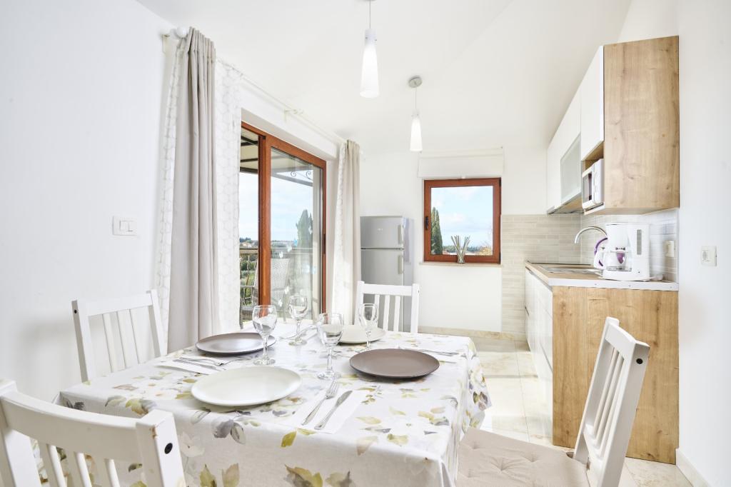 Two-bedroom, modern and equipped apartment. One room with a double bed, the other with a bunk bed. Open and airy living room, kitchen with dishwasher, bathroom with washing machine. Terrace, air conditioning, wifi, satellite TV. Swimming pool, private parking, covered barbecue. Distance from the restaurant 300 meters, distance from the beach 1300 meters