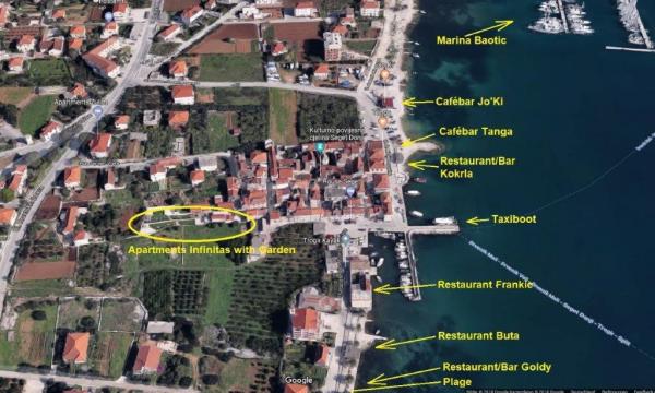 Read more Accommodation unitsFor our guests we recommend less hot months in April, May and June or September and October for all those who do not only enjoy swimming but want to know the beautiful surroundings and the islands, who want to stroll through the beautiful promenade along the beach, enjoy good restaurants with Mediterranean cuisine or who simply want to relax in a nice garden in warm weather. In Infinitas apartments smoking is not allowed (for smokers there is in the garden of ashtray for use). Also, pets are not allowed to take in the apartments. Since the apartments are located in the center of the village of Donji Seget, please do not host any big parties or gatherings.
