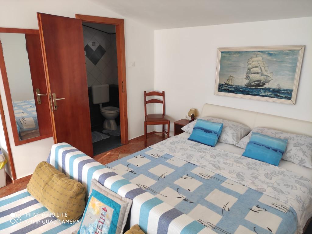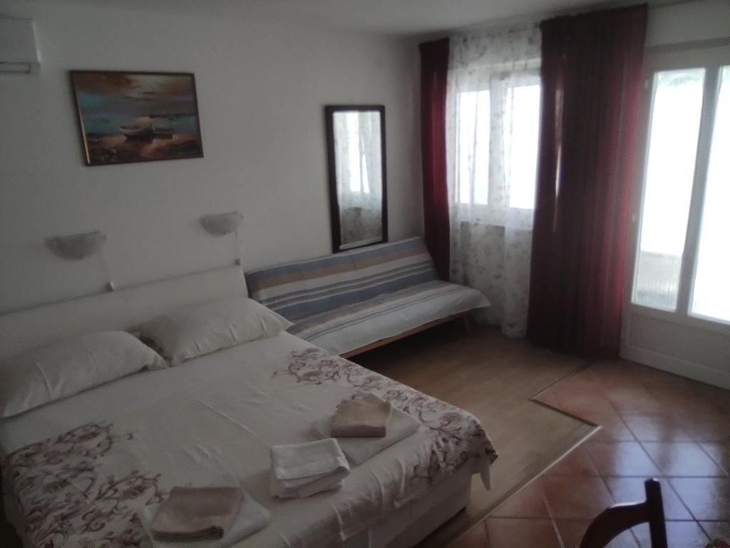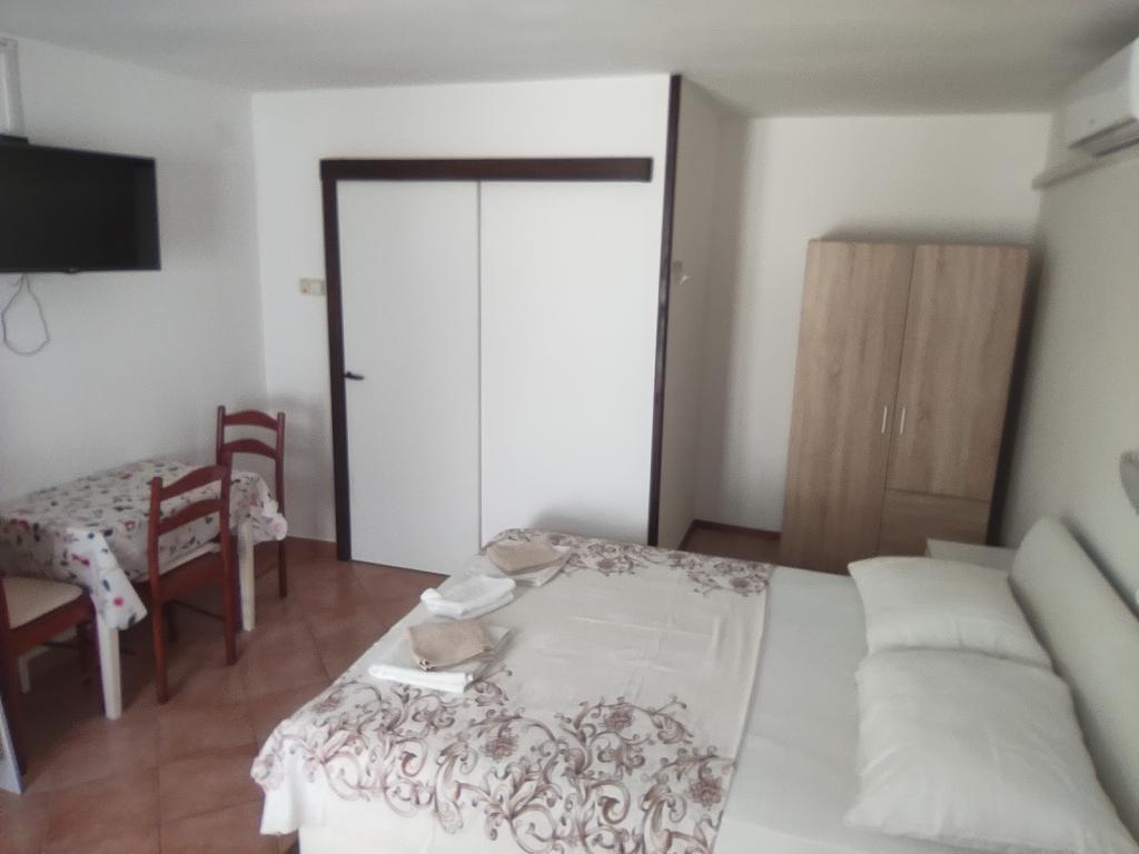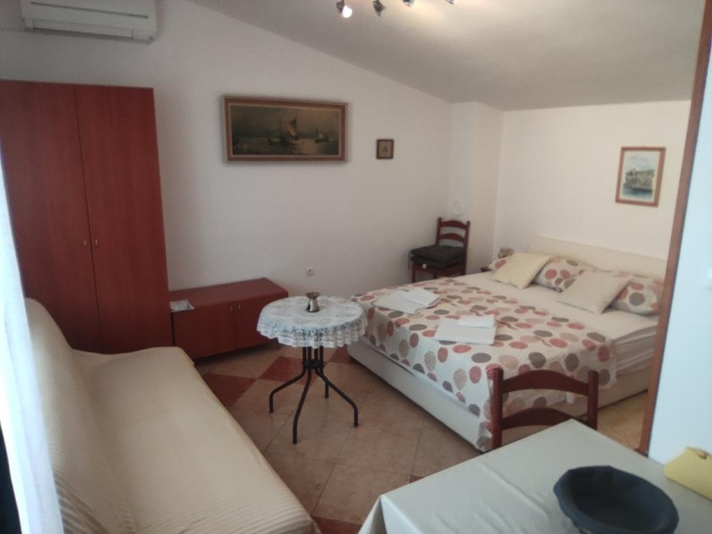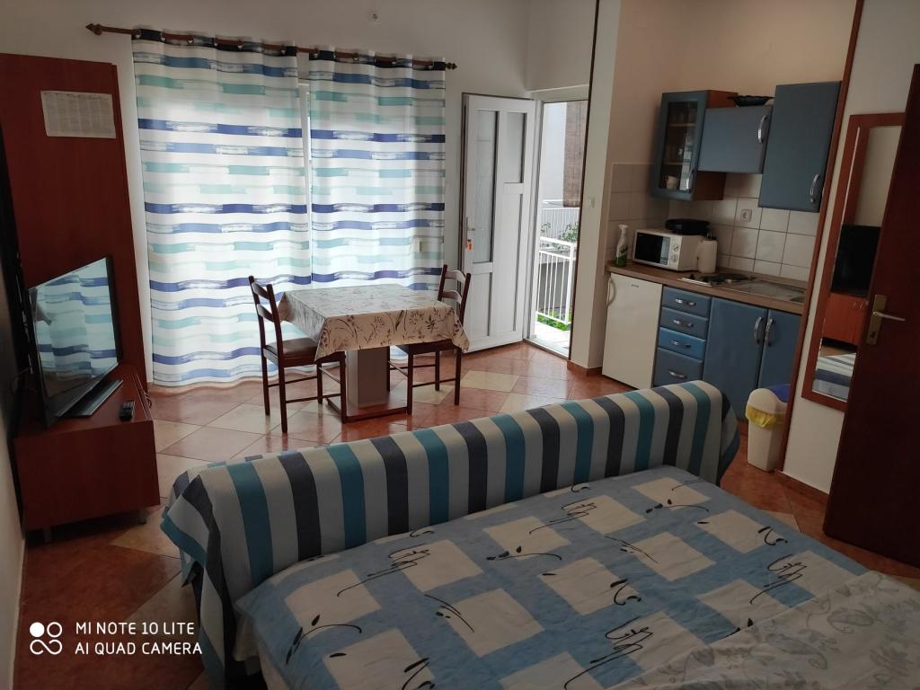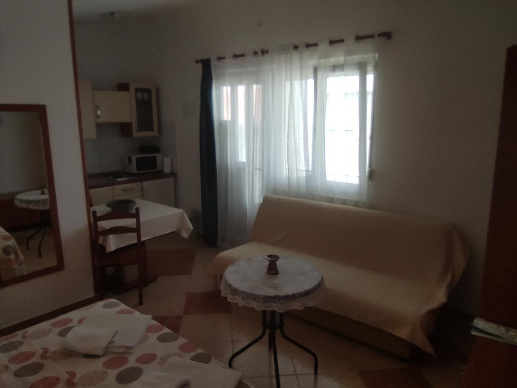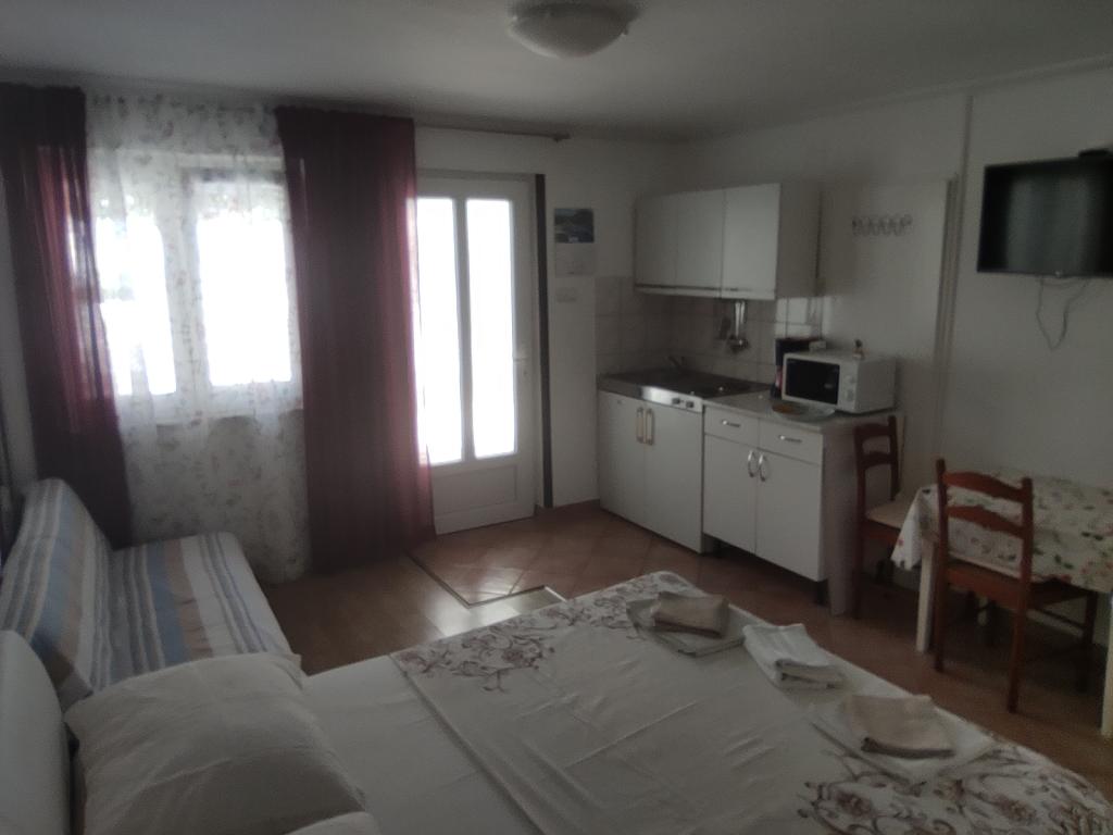 Small studio apartment, ideal for two people. An extra bed is a sofa bed suitable for an adult but more comfortable for children. The apartment is located second row from the sea. Parking is provided and included in the price. The apartment is part of a building with 3 more studio app. The apartment building is located behind the host's house. The yard is used by both guests and hosts.