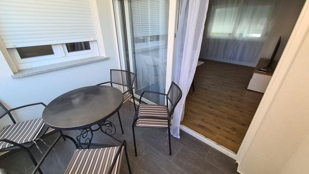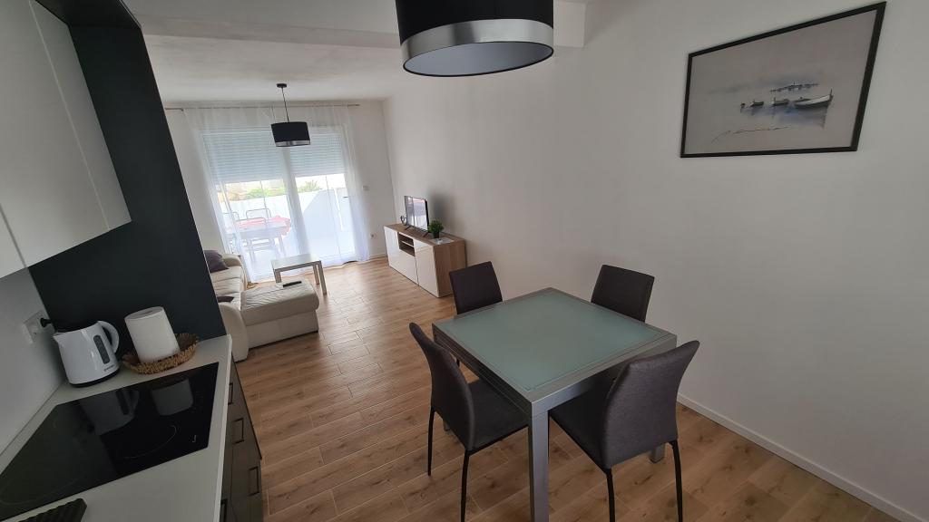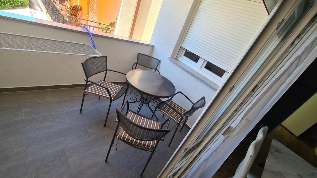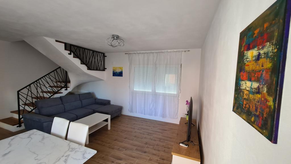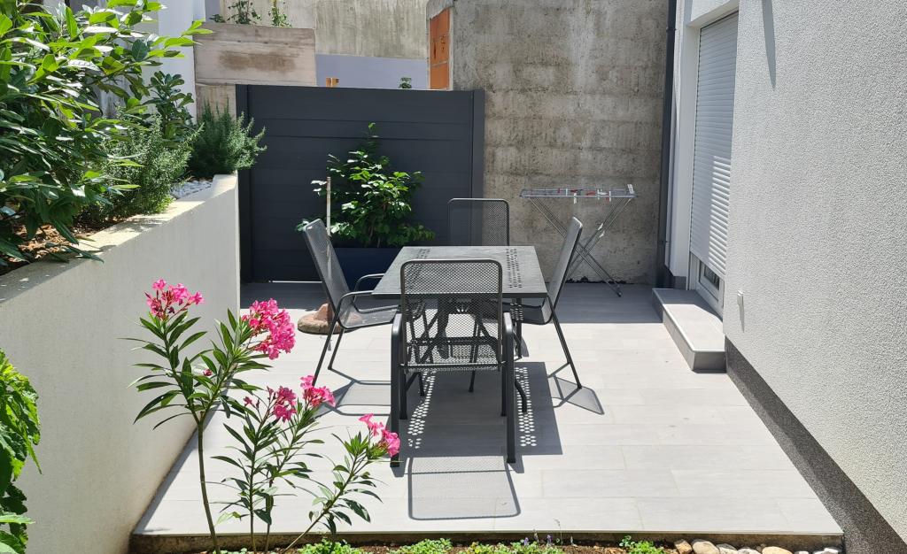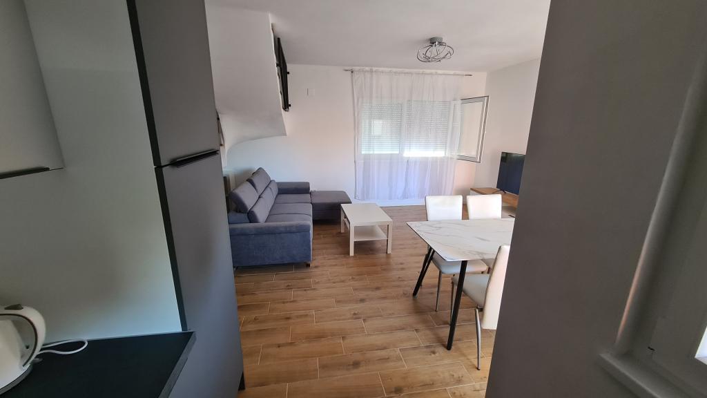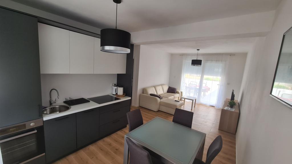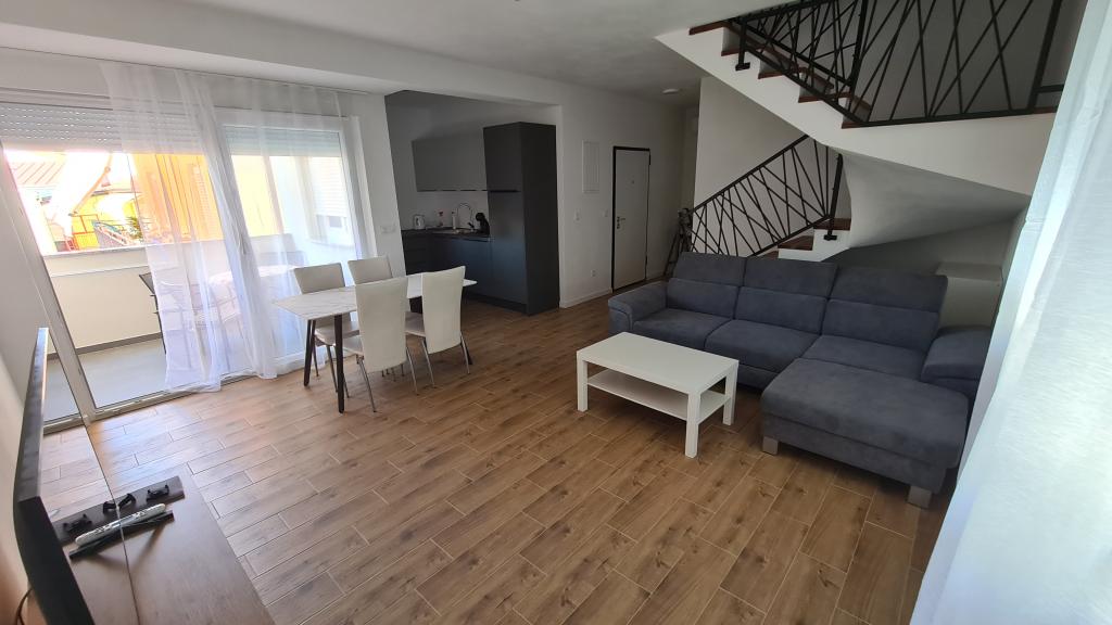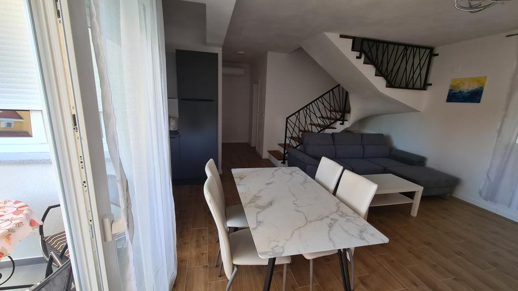 AP-Ground floor: New, well-furnished apartment, ideal for a great vacation. The residential building consists of an entrance, a bathroom, a kitchen, a private terrace and a dining room, a living room with a sofa bed and a bedroom with a double bed. Guests have their own terrace at their disposal. Two-story AP floor: New, well-furnished apartment, ideal for a great vacation. The residential building is on two floors. Lower floor living area (entrance, bathroom, kitchen, dining loggia and living room with sofa bed) and sleeping area on the upper floor (two bedrooms with double beds). It is located in an exceptional location, two minutes from the central square, one minute from shops and bakeries and various restaurants, and three minutes from the beach. Free parking and Wi-Fi.