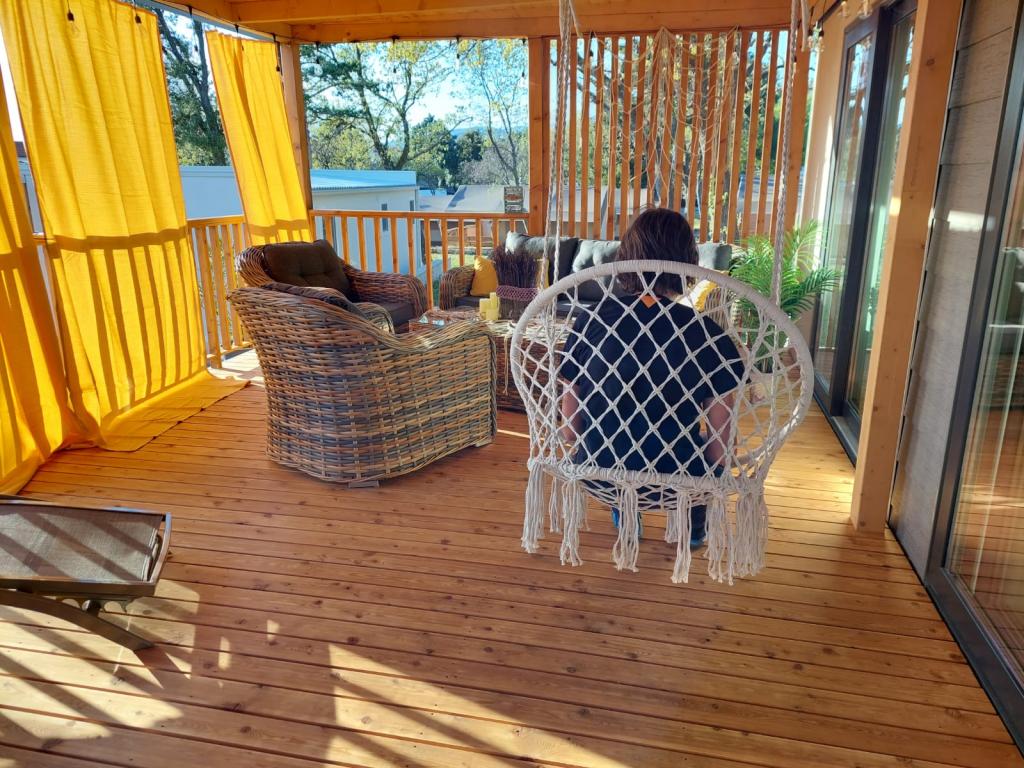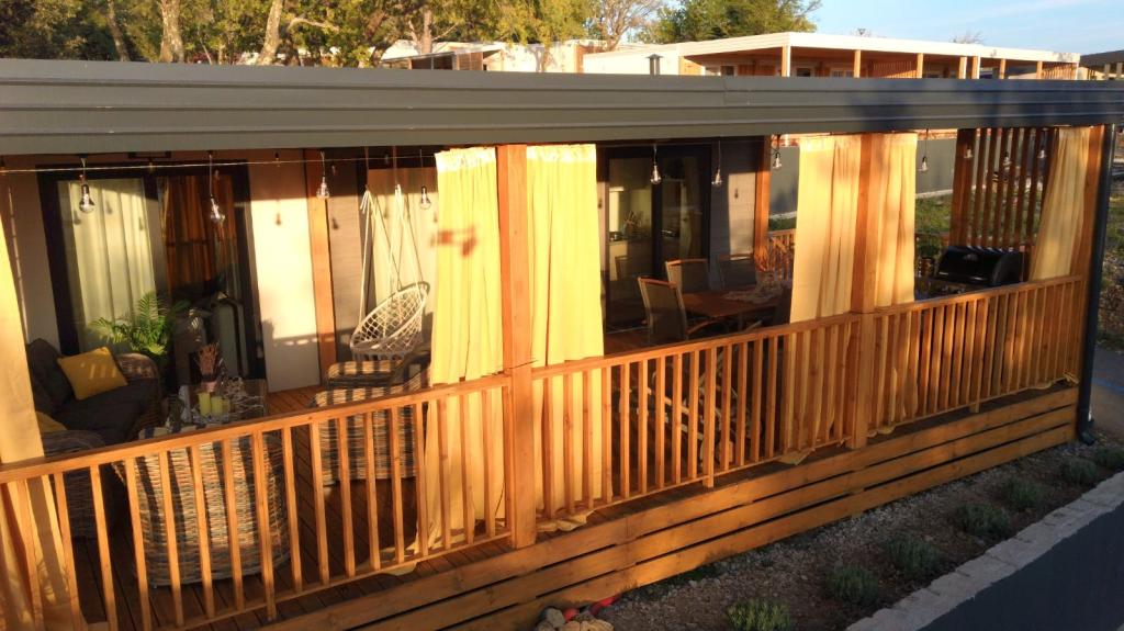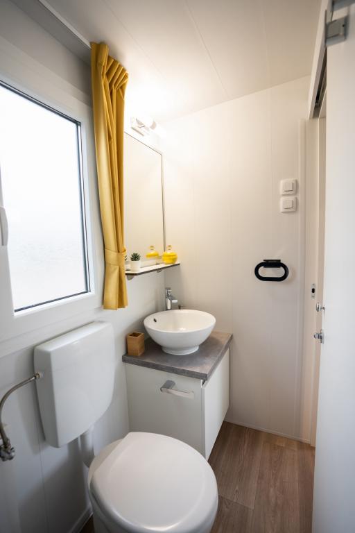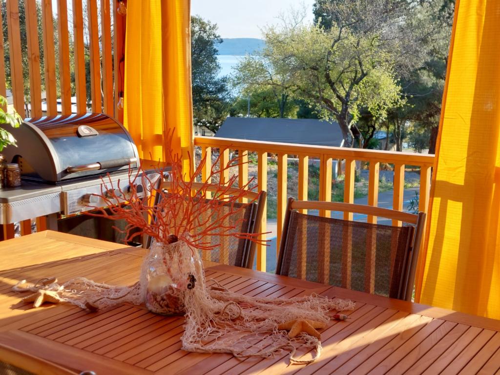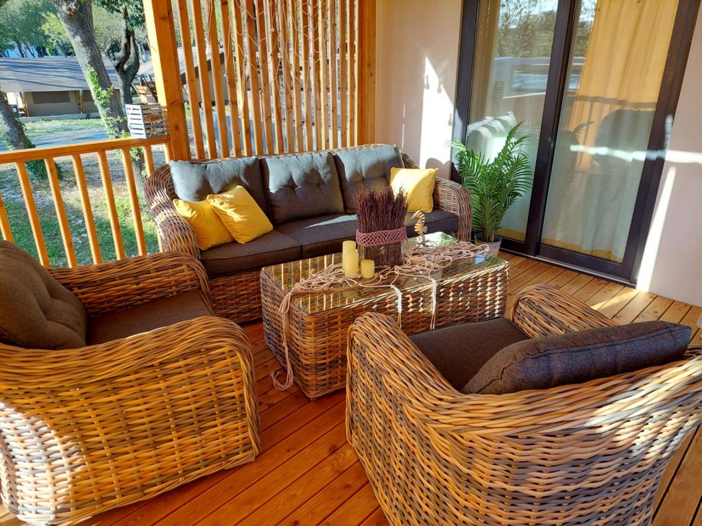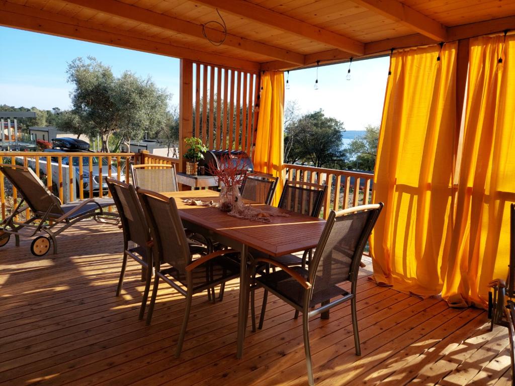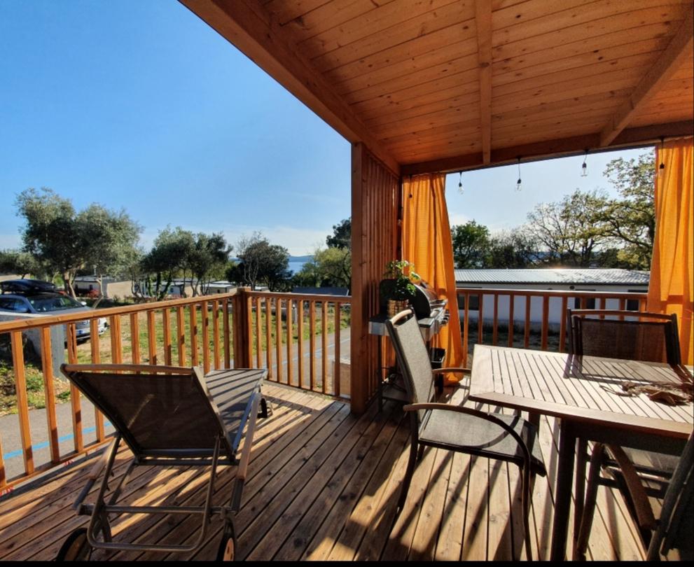 JaNoRe - Mobile Home located in the shade of Mediterranean trees surrounded by rich greenery and beautiful views of the sea and the island of Krk. The camp offers accommodation for true nature lovers of the famous combination of healing sea air and pine in which nature, the sound of waves and the smell of spruce are intertwined, with the feeling of relaxation you have in your own home, the terrace entices you to stay all day. Everything you need for a peaceful vacation, fun and recreation is located just 100 meters from the beach. A bakery and a cafe are inside the camp. The prestigious and luxurious 36 m2 mobile home is the ideal size for a comfortable holiday with two air-conditioned bedrooms and a living room and two bathrooms with a fully equipped kitchen, which provides all the conditions for a luxurious time. Inside the house you can enjoy relaxing in an elegant trendy interior and outside on the large, luxurious, covered terrace of 38 m2 which offers the possibility of staying in nature in all weather conditions.
