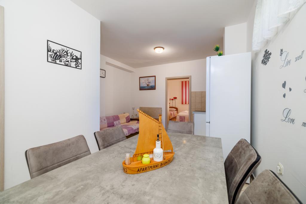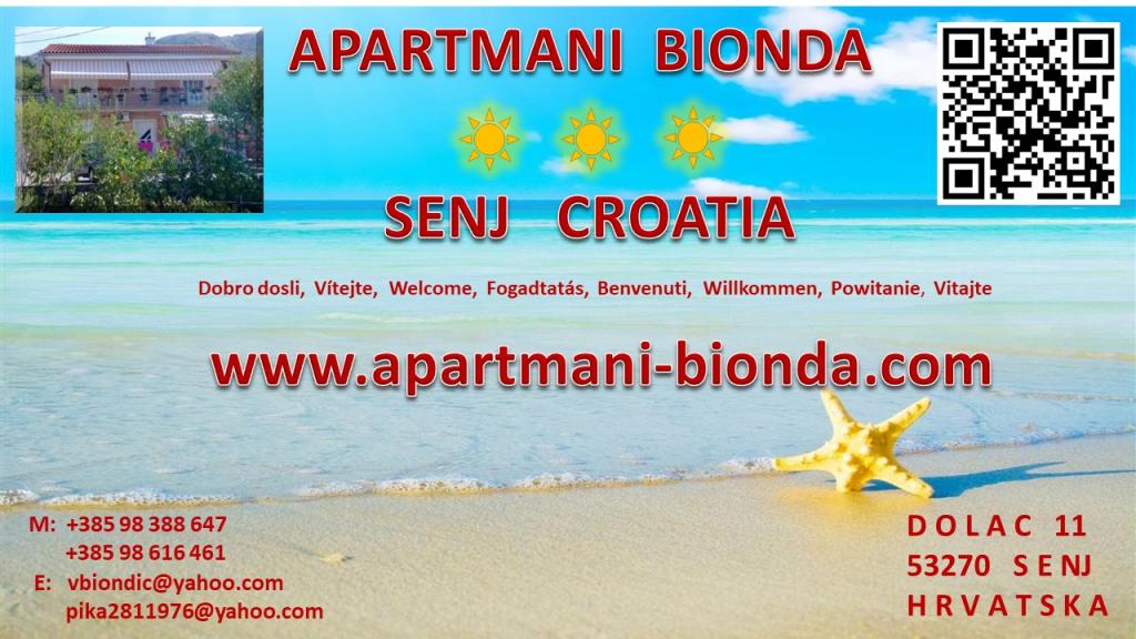 Apartments BIONDA are newly built, fully and modernly equipped in a quiet part of the town of Senj. They are located in a separate building, i.e. a detached house. Each apartment has a separate entrance, its own balcony or terrace, table and chairs for the balcony available, SAT-TV, wireless internet, WI-FI, mini bar, air conditioning, electric heating plates, and parking for your car is provided. In the immediate vicinity of the town of Senj are the Plitvice Lakes National Park, nature parks Velebit, Zavratnica, the islands of Goli, Grgur, Prvić, Krk and Rab. The apartments are rented all year round.