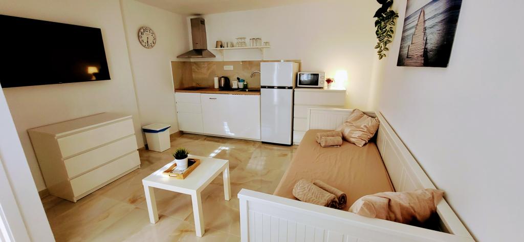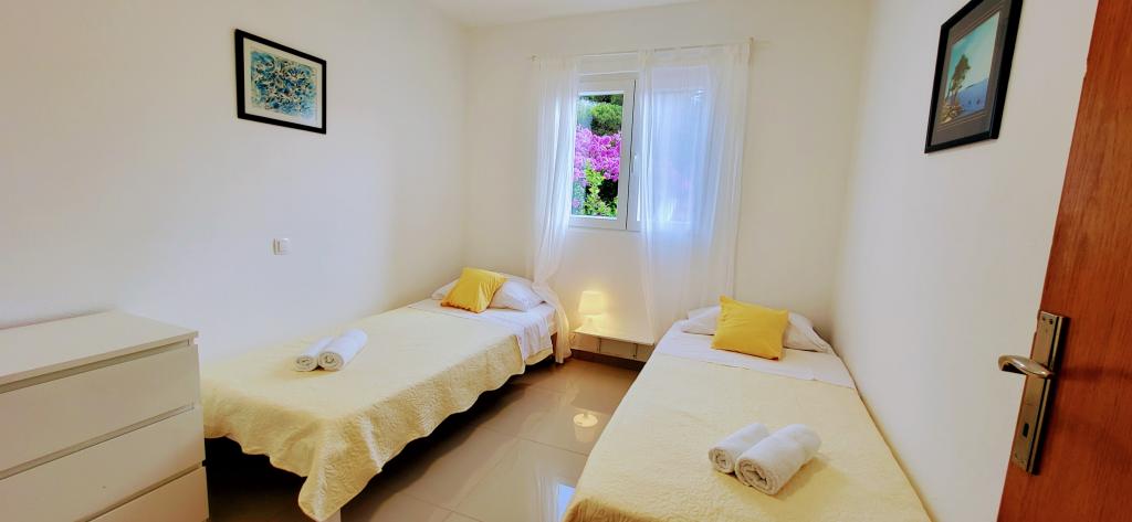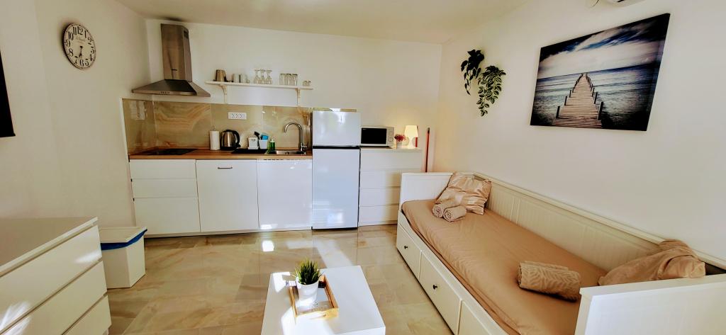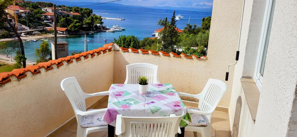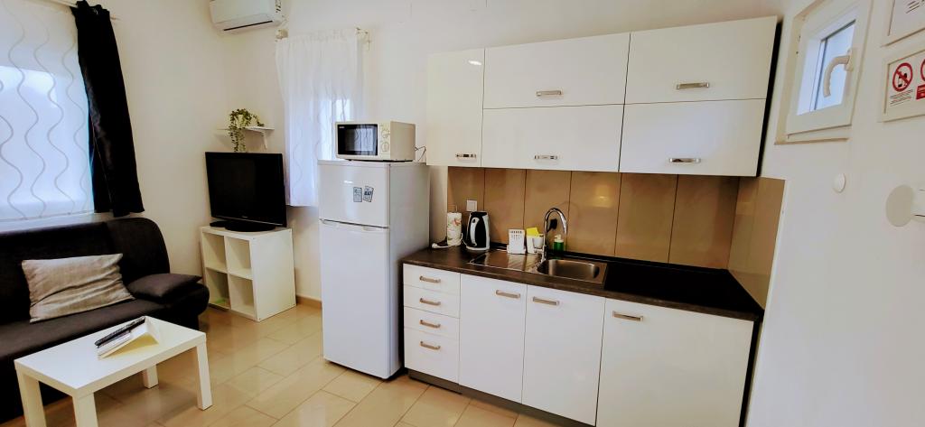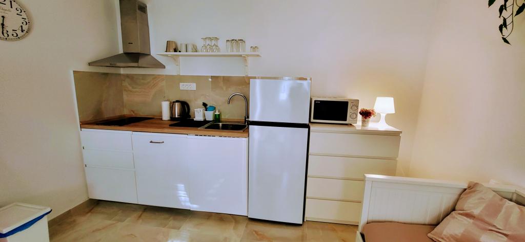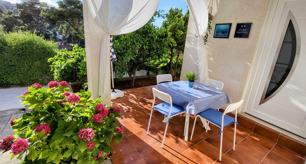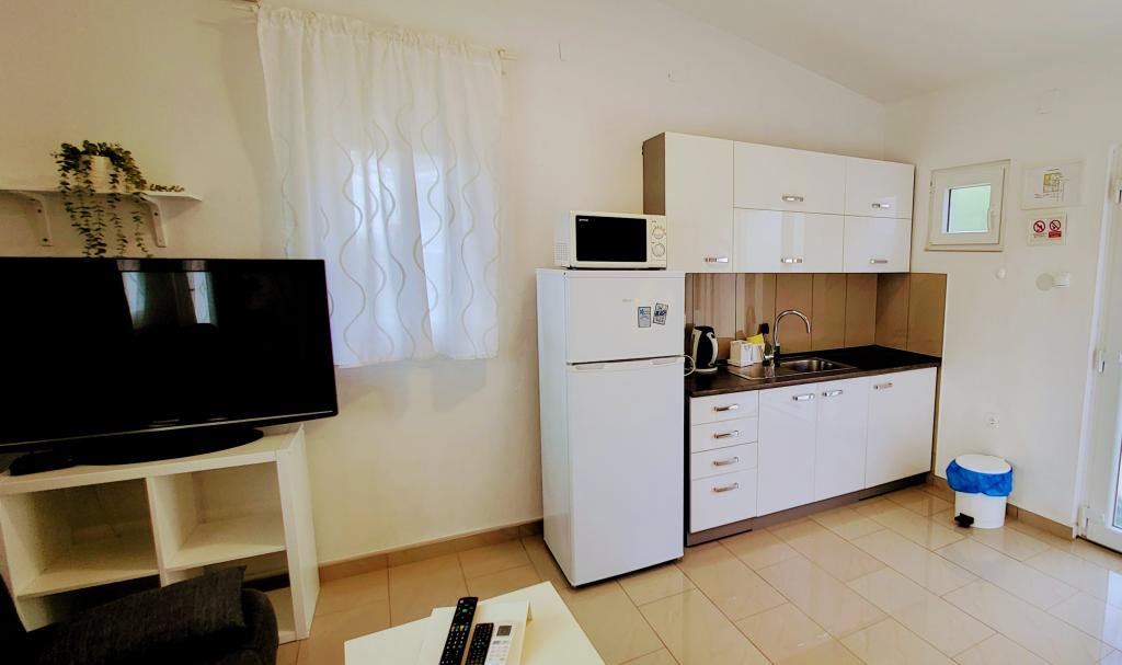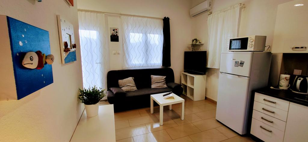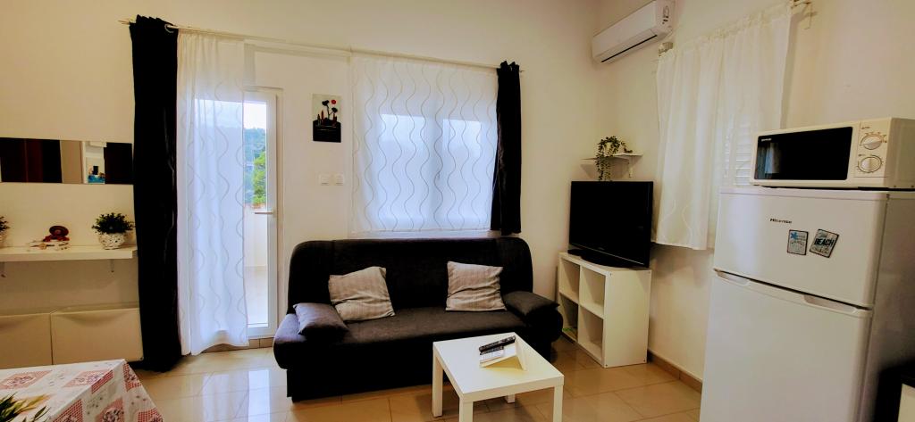Modernly equipped studio apartment. Located in a quiet bay just 80 m from the pebble beach. It consists of a bedroom with a double bed (160x200 cm), a bathroom with a walk-in shower, a kitchen and a living room with a dining area. The living room has a pull-out bed (160x200 cm). The apartment has air conditioning, smart TV, free WI-FI and parking, and its own terrace. Barbecue and outdoor shower within the building.