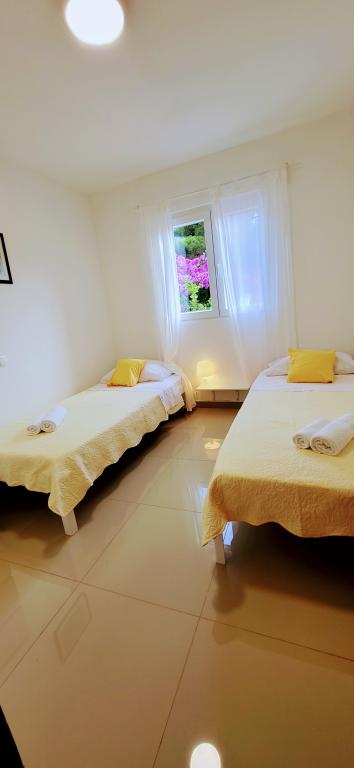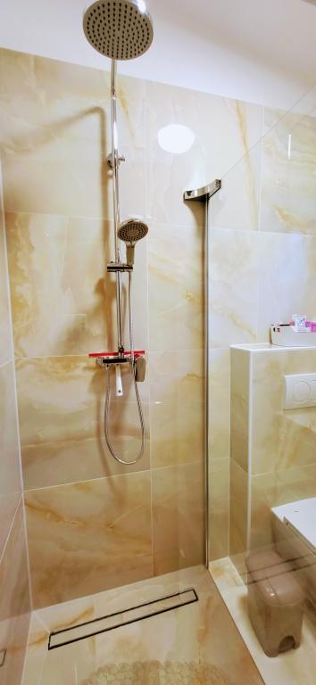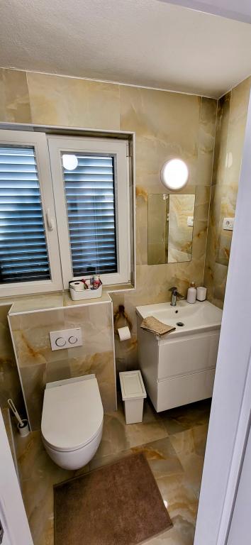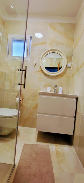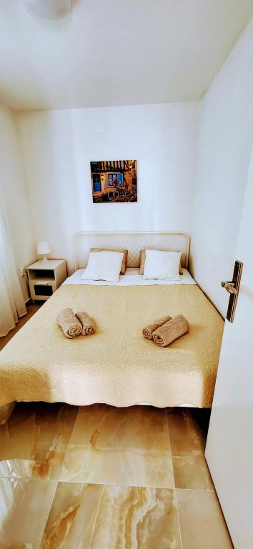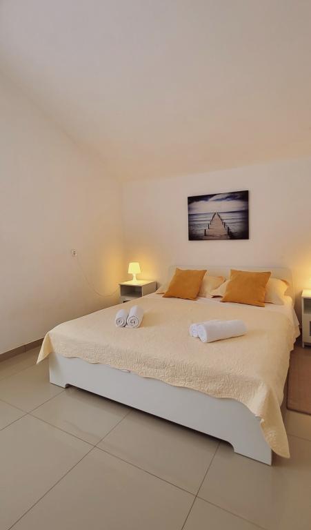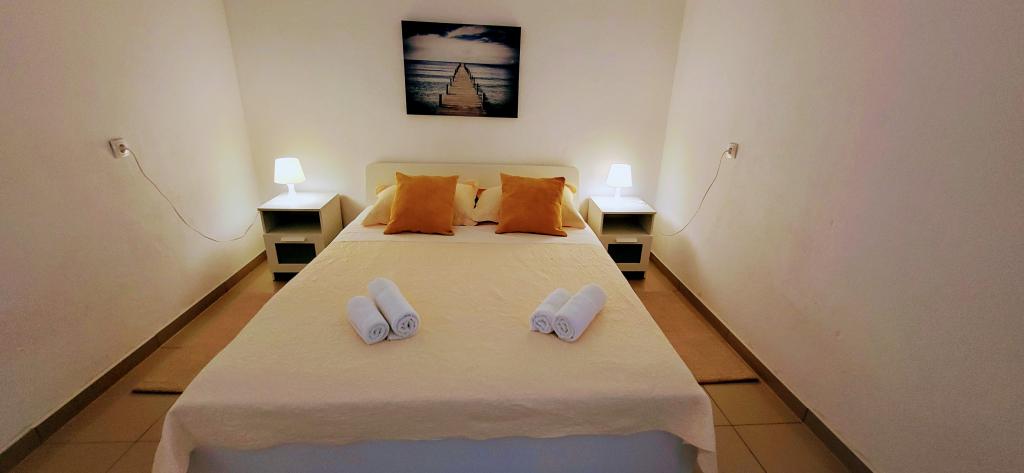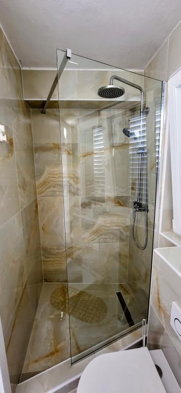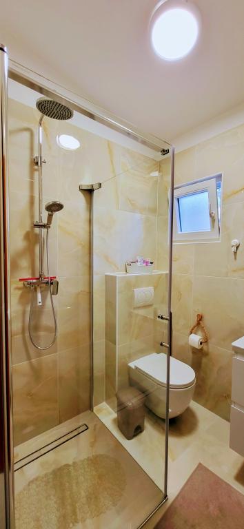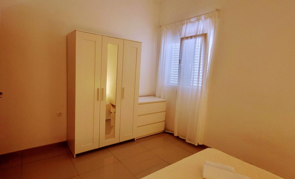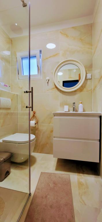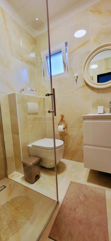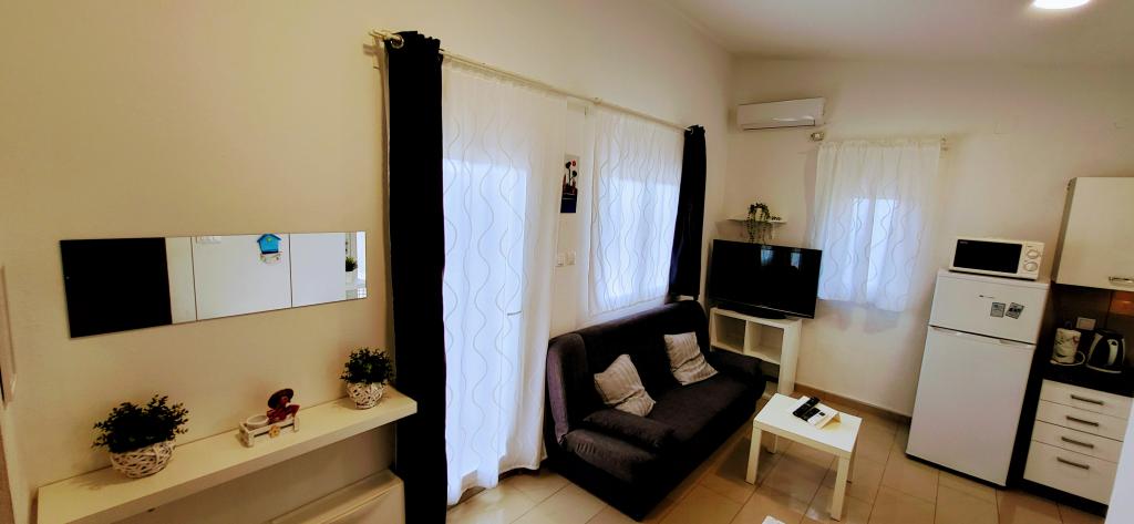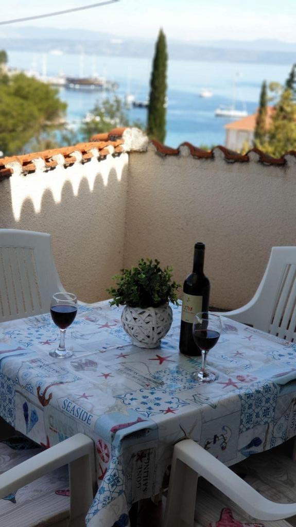 Modernly equipped studio apartment. Located in a quiet bay just 80 m from the pebble beach. It consists of a bedroom with a double bed (160x200 cm), a bathroom with a walk-in shower, a kitchen and a living room with a dining area. The living room has a pull-out bed (160x200 cm). The apartment has air conditioning, smart TV, free WI-FI and parking, and its own terrace. Barbecue and outdoor shower within the building.